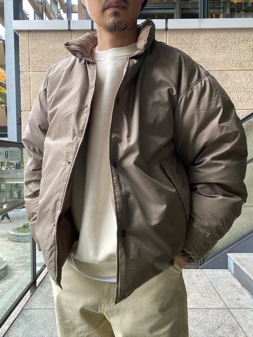 マットな質感の生地に、パッカリングを効かせてスポーティ感を抑えています。中わたはリサイクルダウンを封入し、保温性と軽さを追求。裏地にGORE-TEX WINDSTOPPER 2層構造を使用し、風の侵入を軽減しています。衿元と後ろ肩に同色のロゴ刺繍を配置。着合わせや脱ぎ着のしやすさを考慮し、身幅や袖幅はゆったりめに仕上げています。