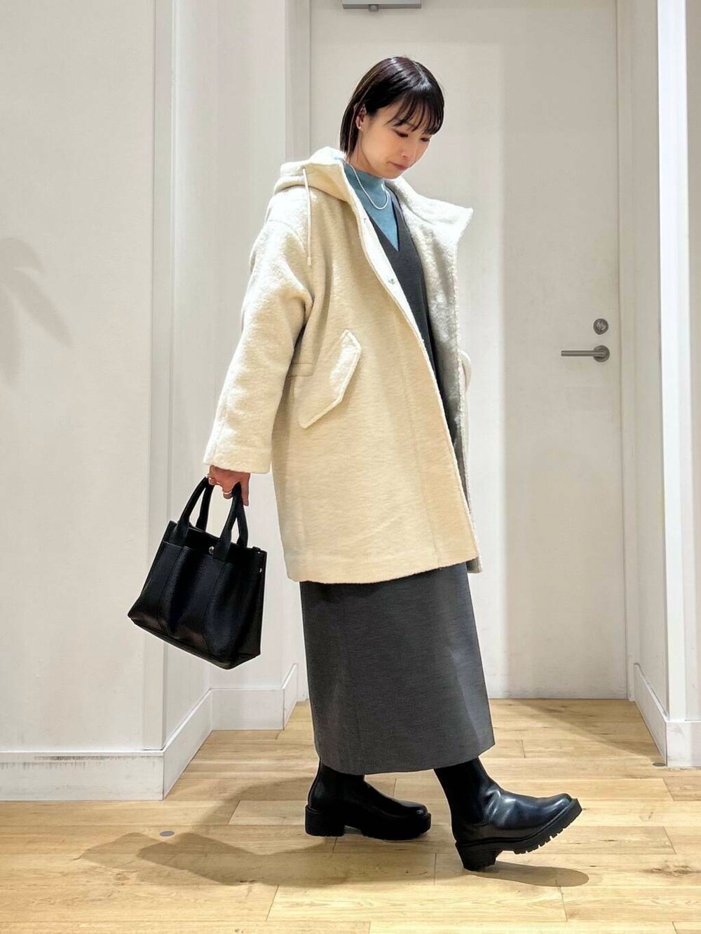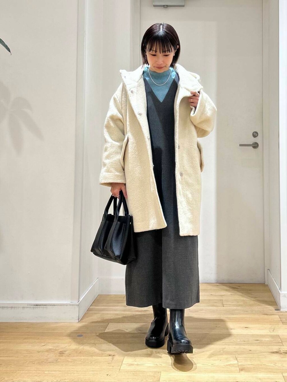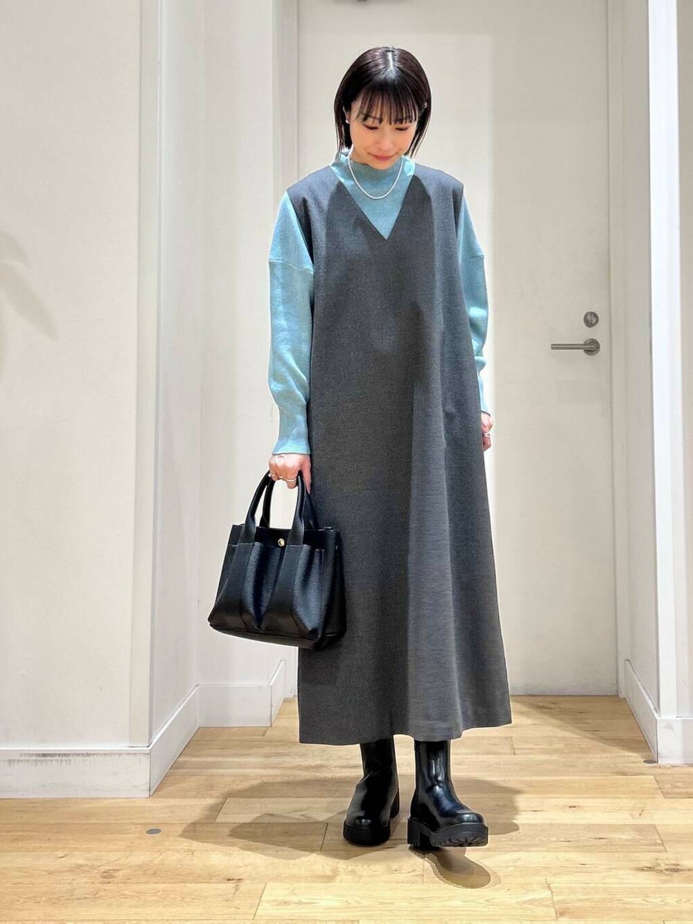 インナーにはブルーがキレイなニットを合わせてポイントに◎