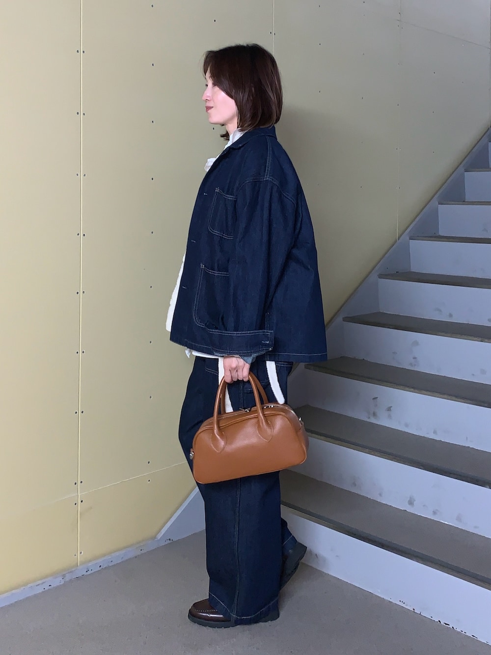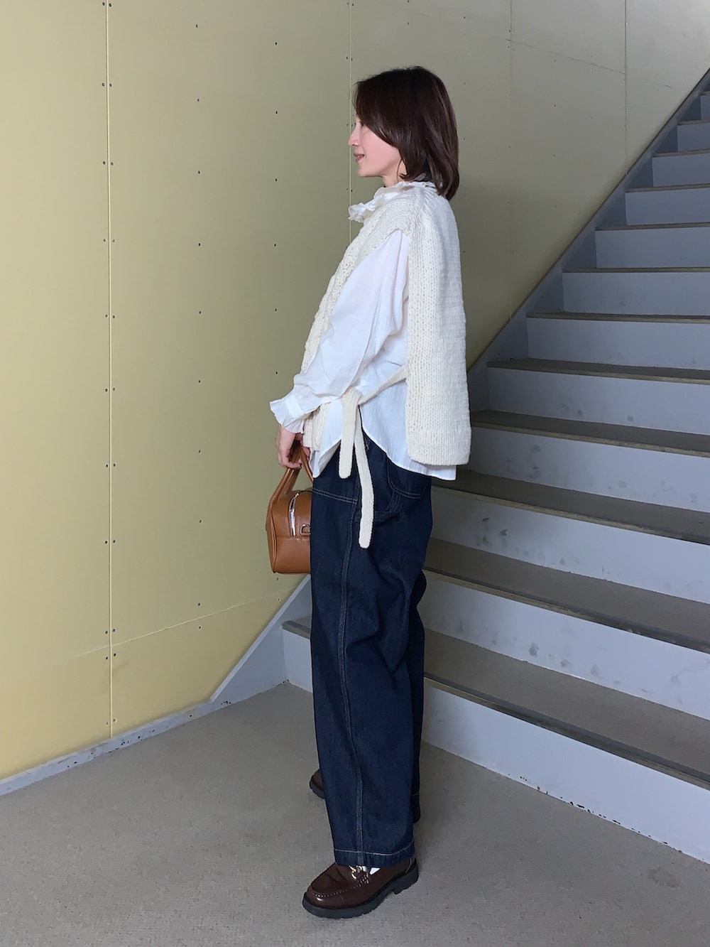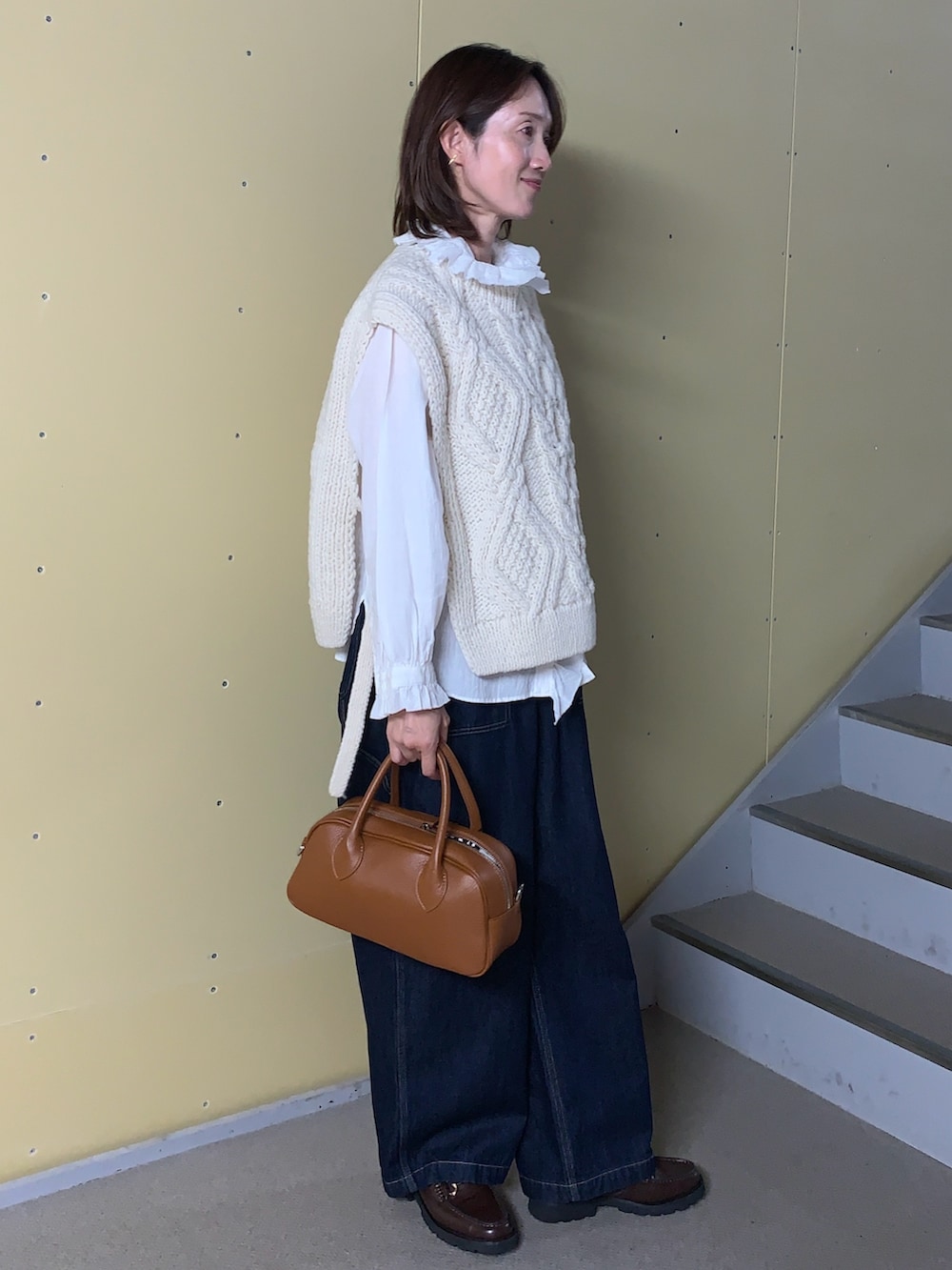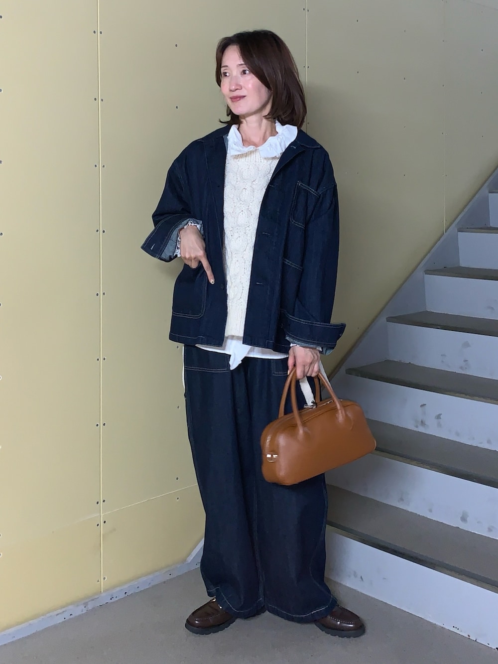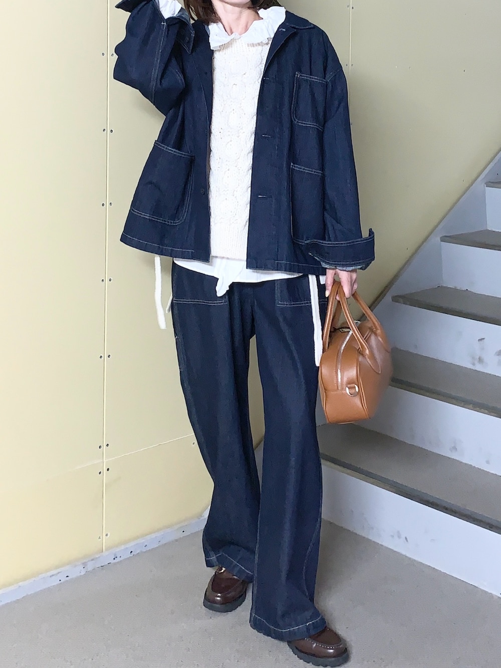 オーバーサイズ同士のデニムセットアップは、フリルカラーやアラン編みの繊細なディティールと合わすことで生まれる余裕あるこなれ感がキュンとします。