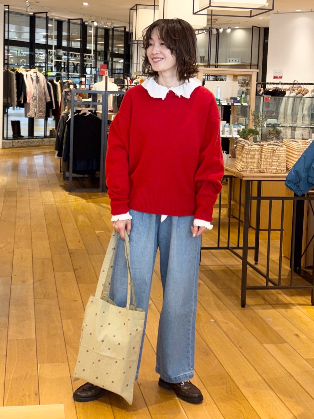 下のパンツは生地があつく、太いためがっしりとした印象になりました。
