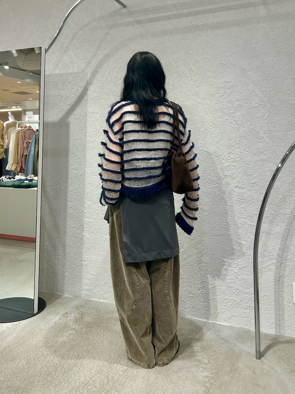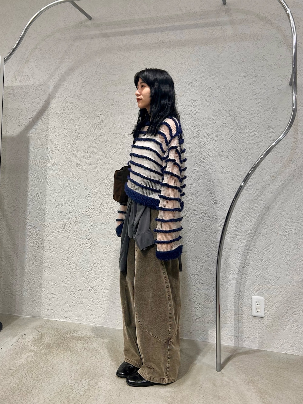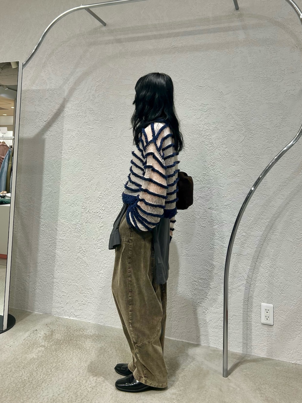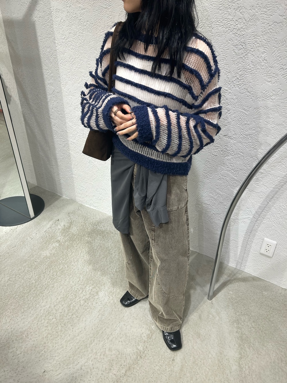 シアーのボーダーニットとコーデュロイパンツ、ポイントにシアーシャツを合わせて着てみました。