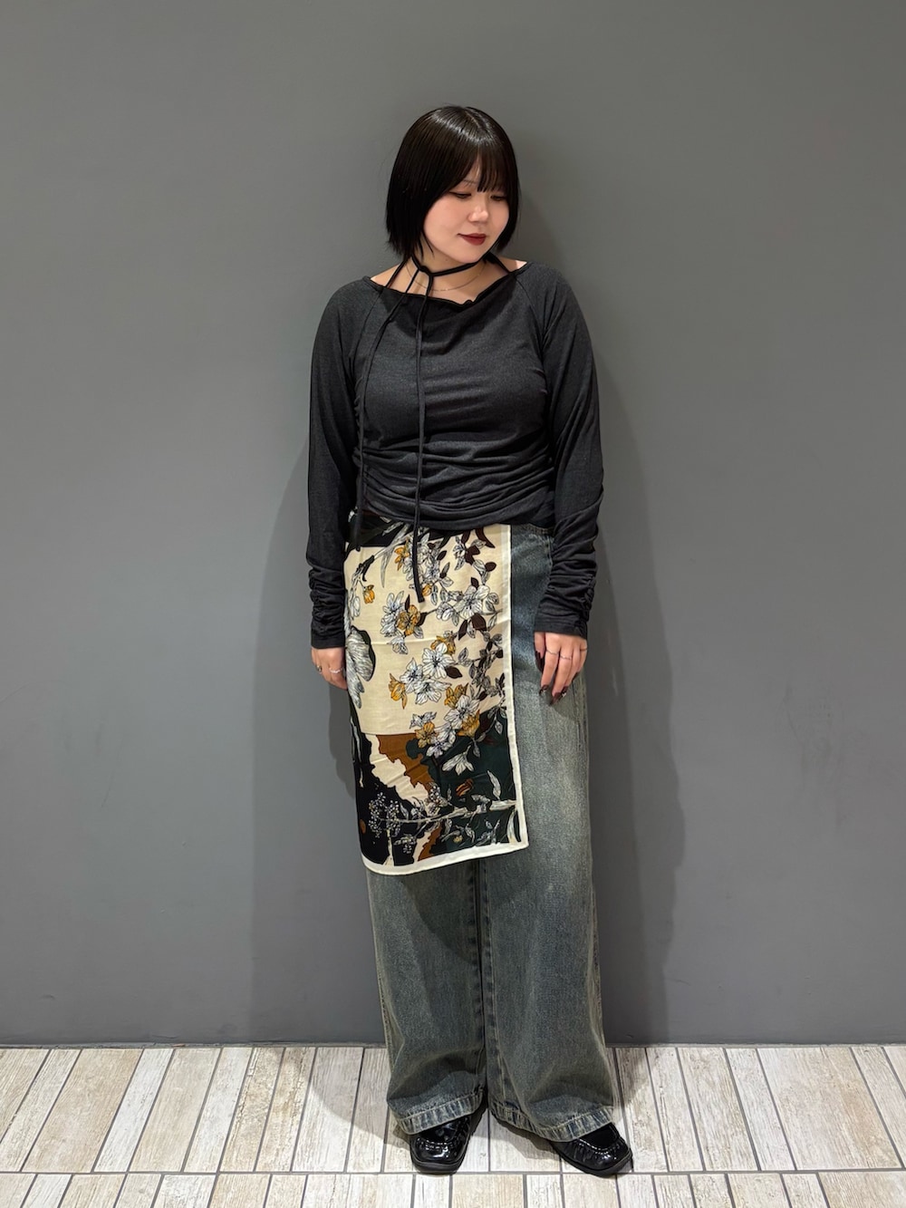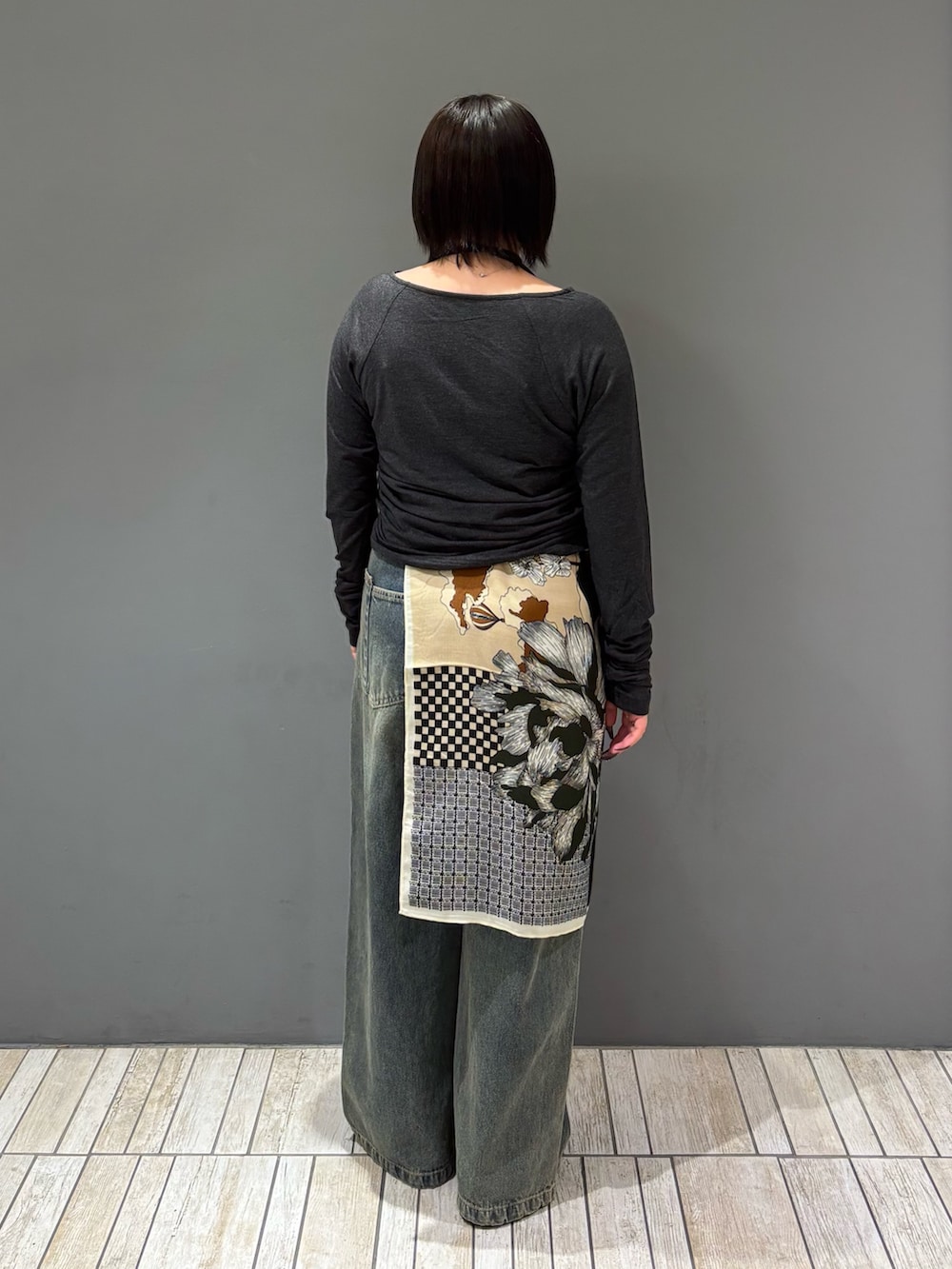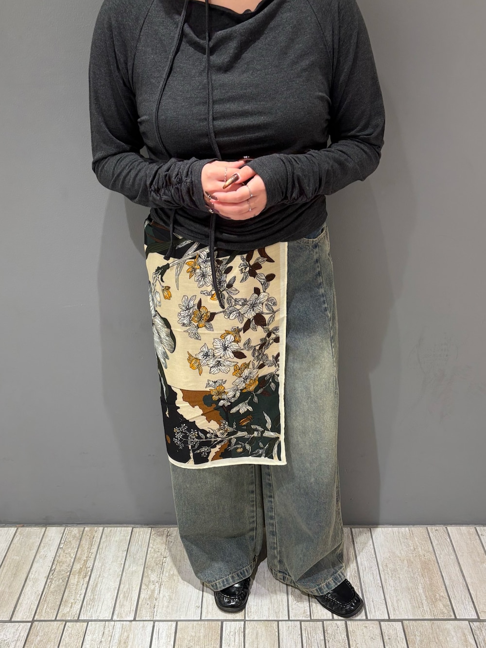 ・スカーフを腰巻きすることでカットソー×デニムの単調なコーデから一気にこなれ感をプラス!