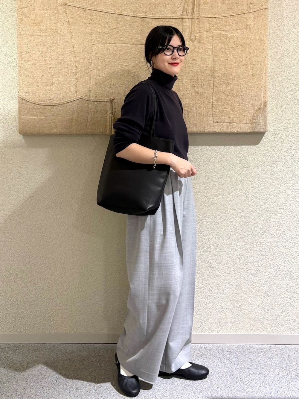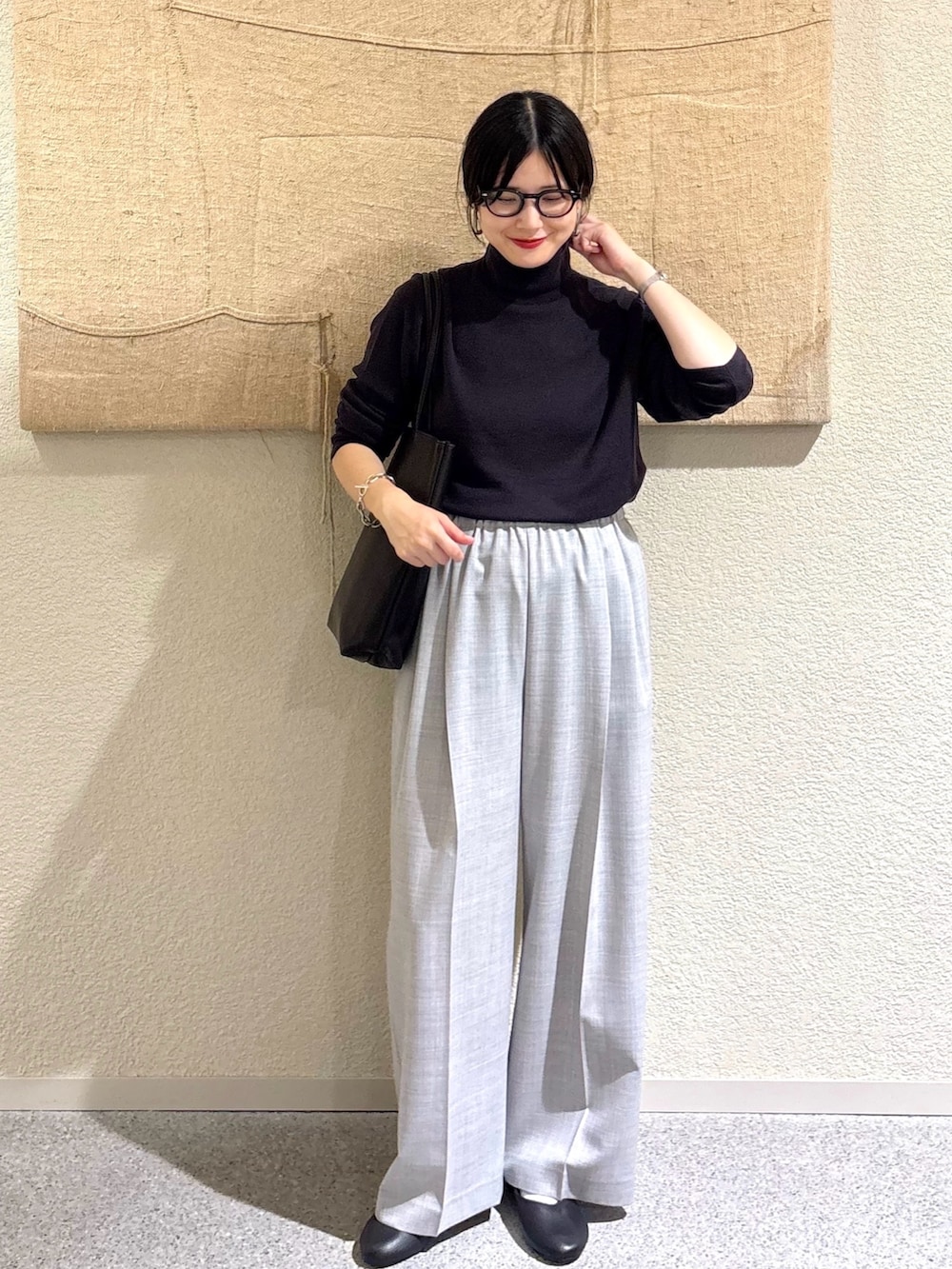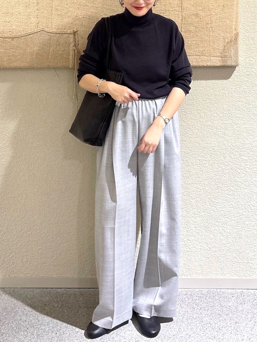 ・柔らかなウールの質感で、シンプルながら奥行きのあるコーディネートに