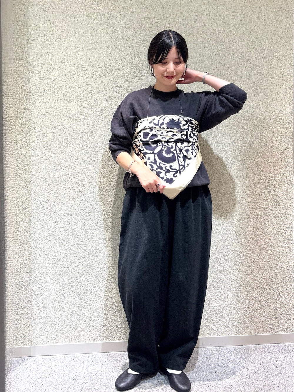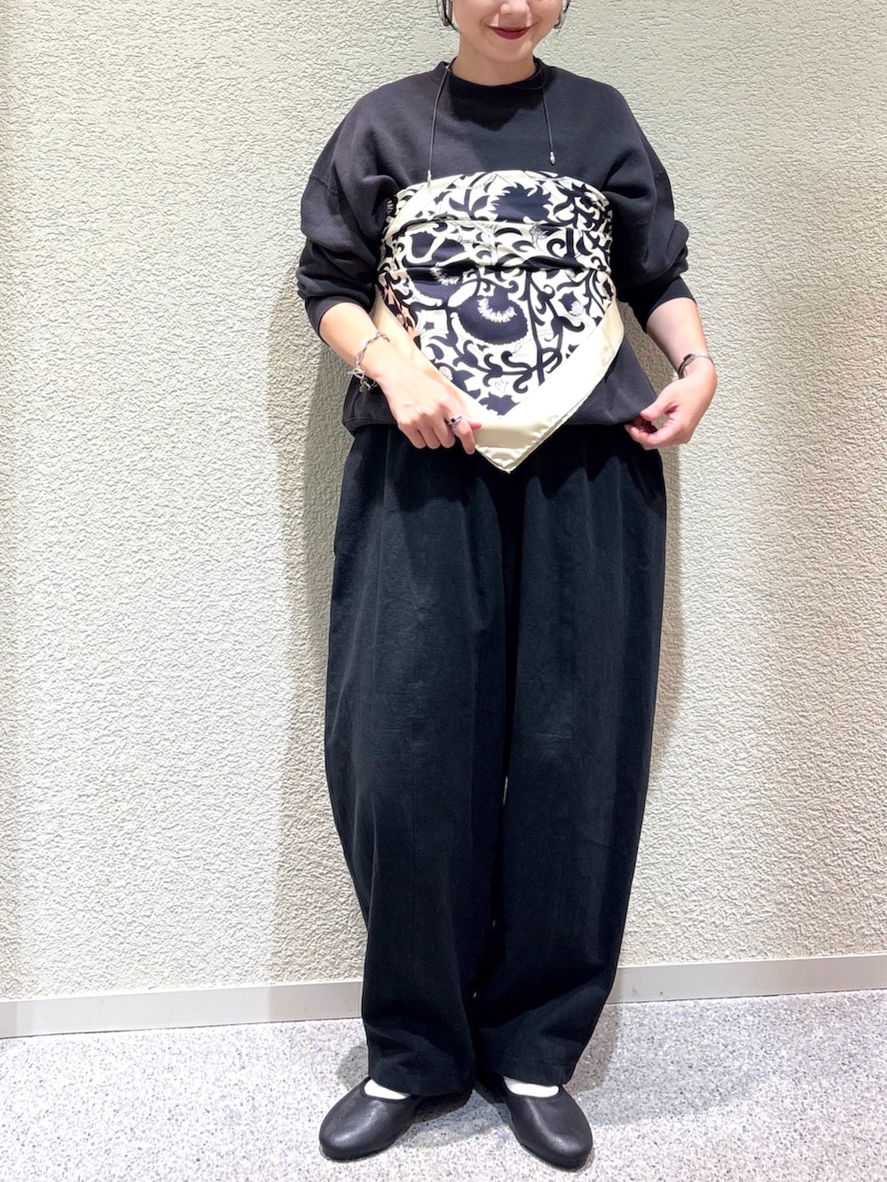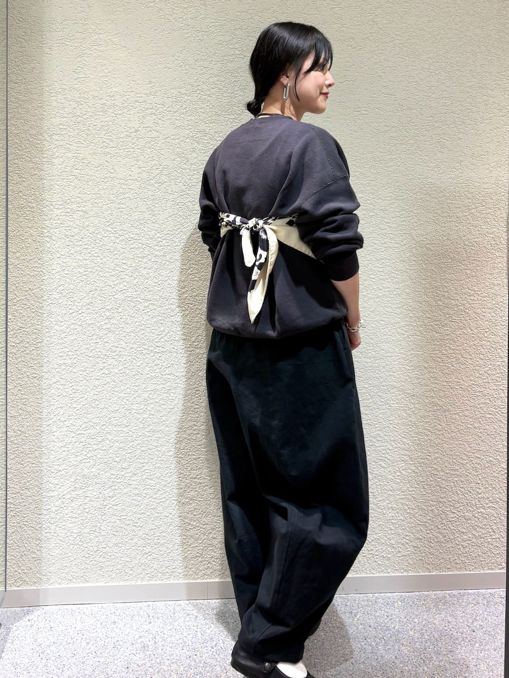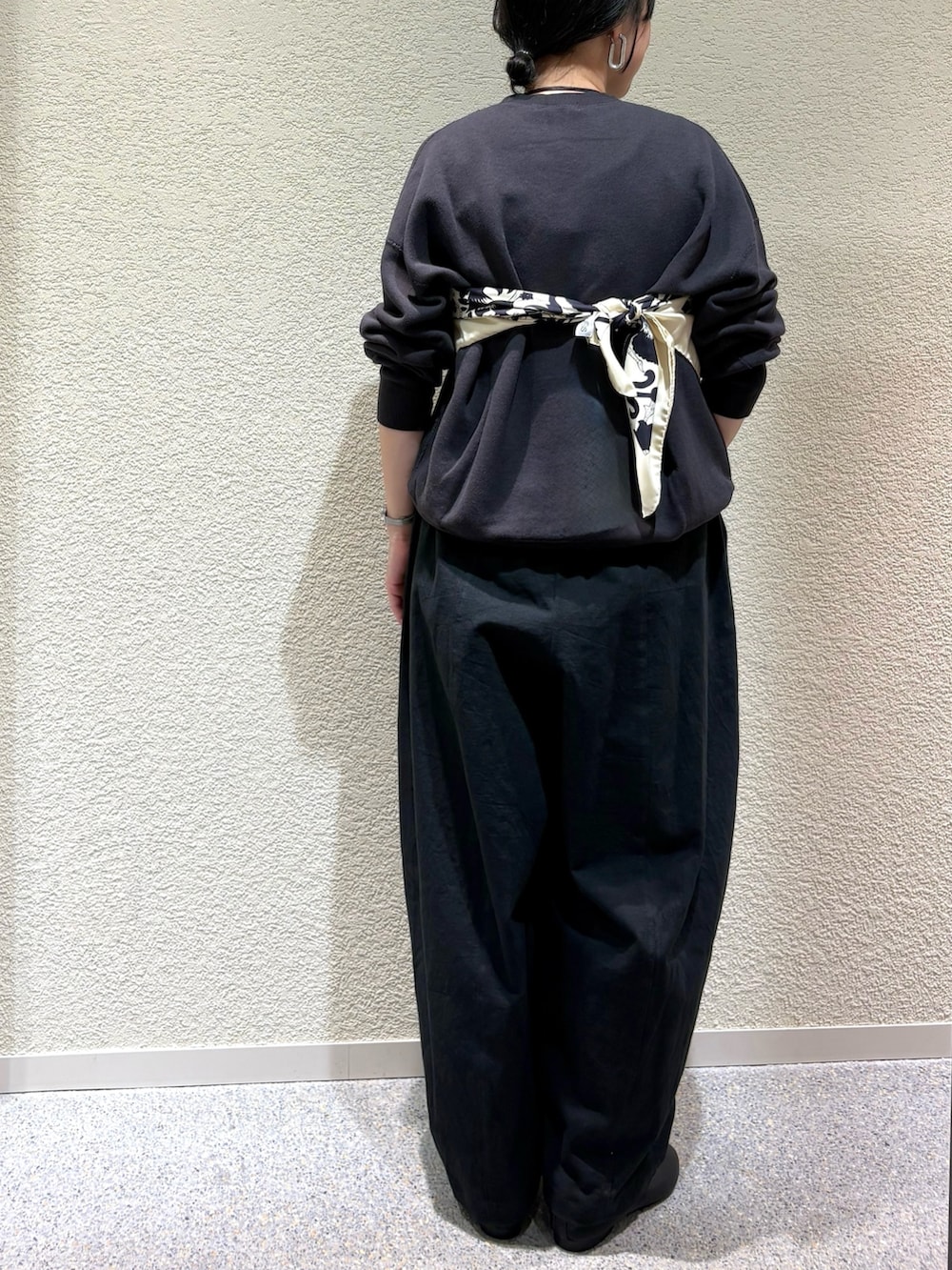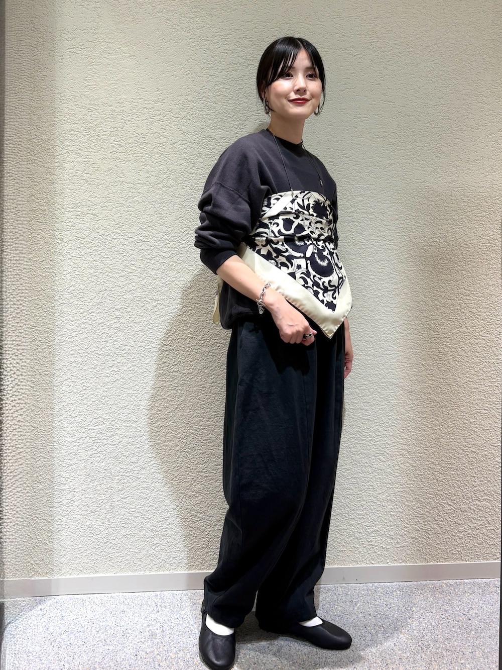 ・シンプルなスウェットにスカーフをビスチェ風にアレンジしてモードな表情をプラス