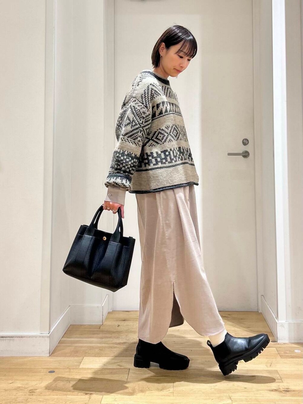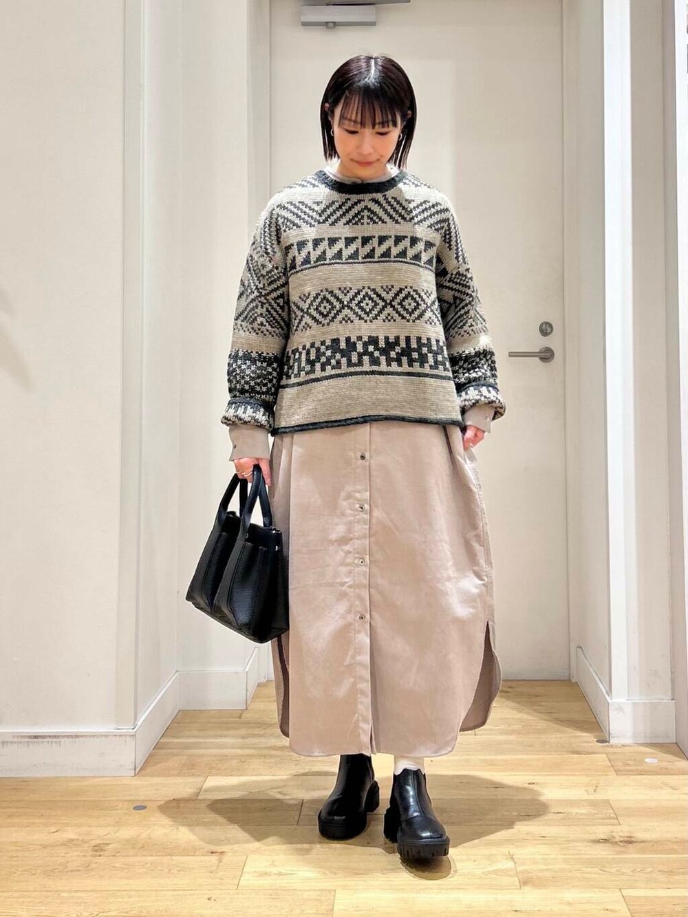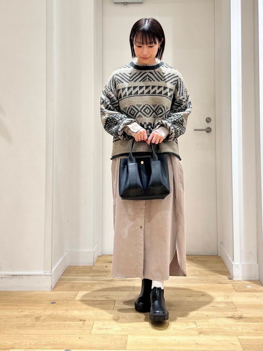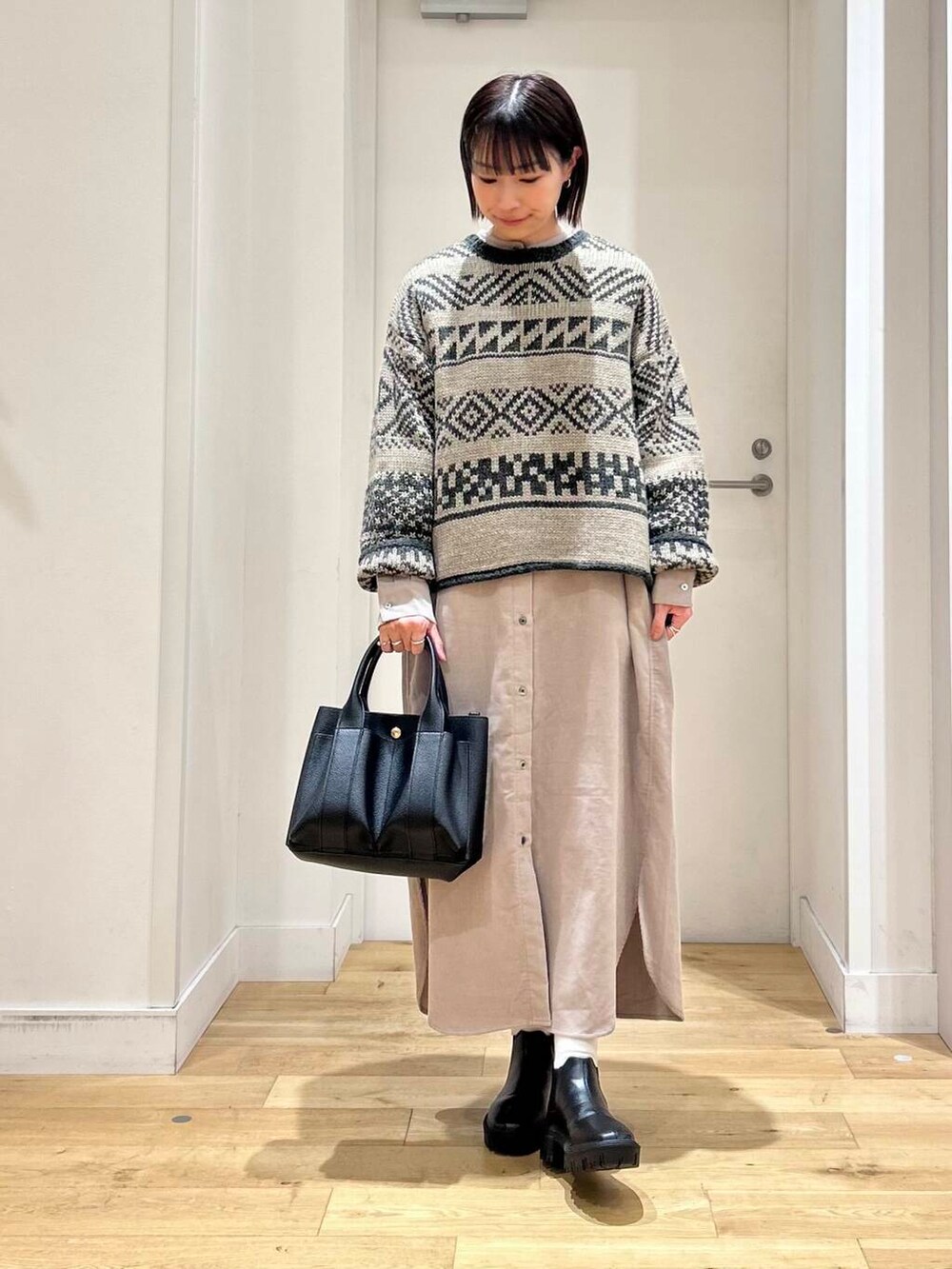 ノルディック柄が可愛いニットをワンピースに重ねてコーディネート!