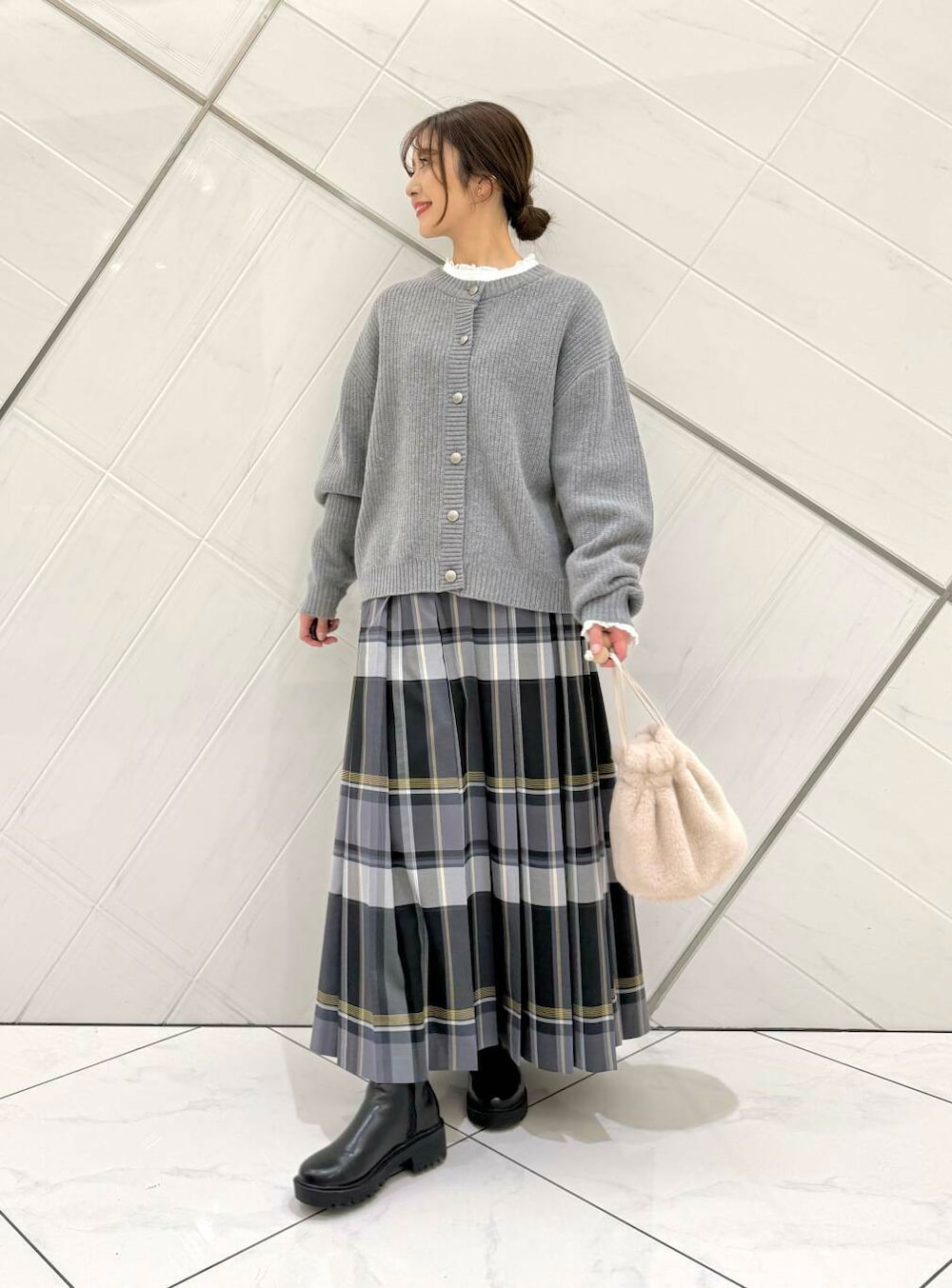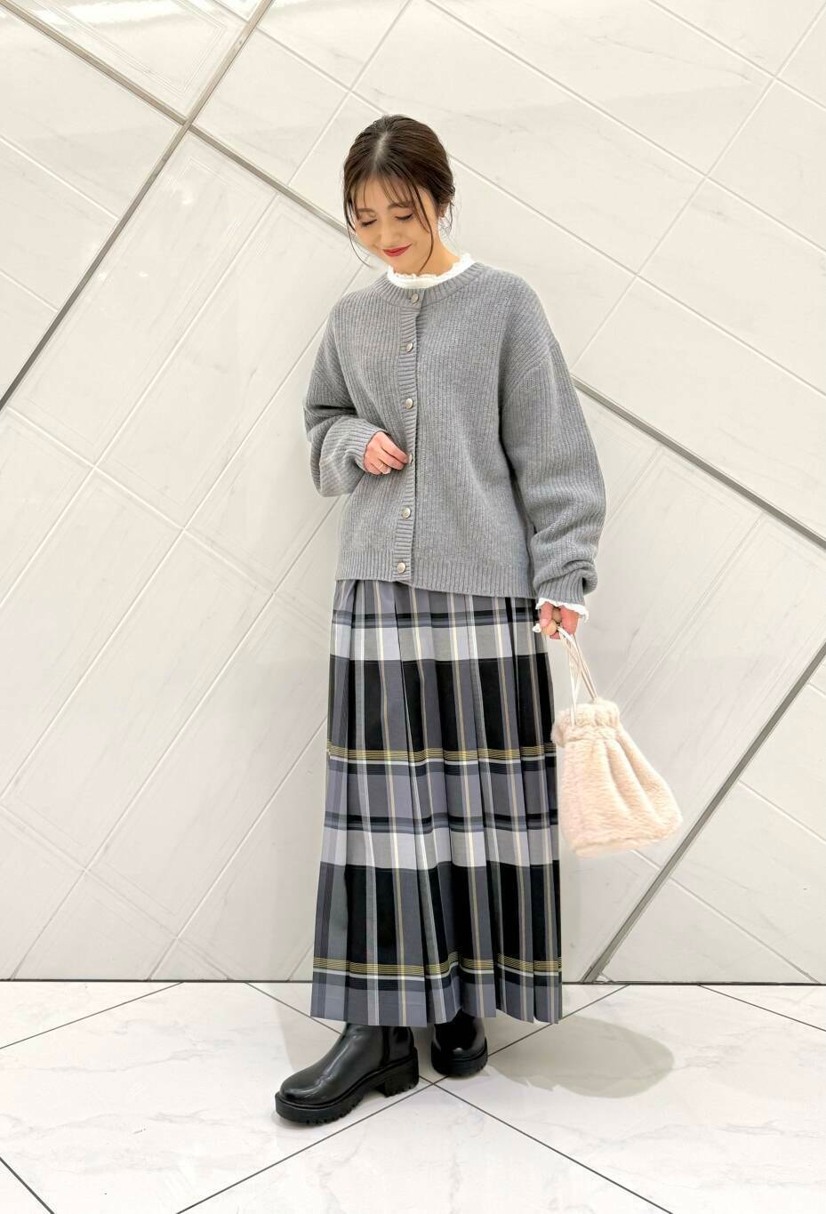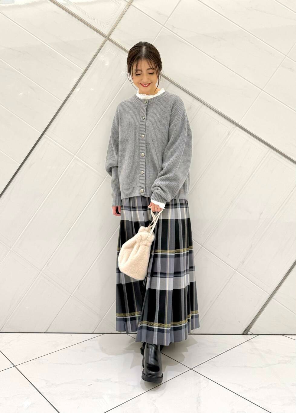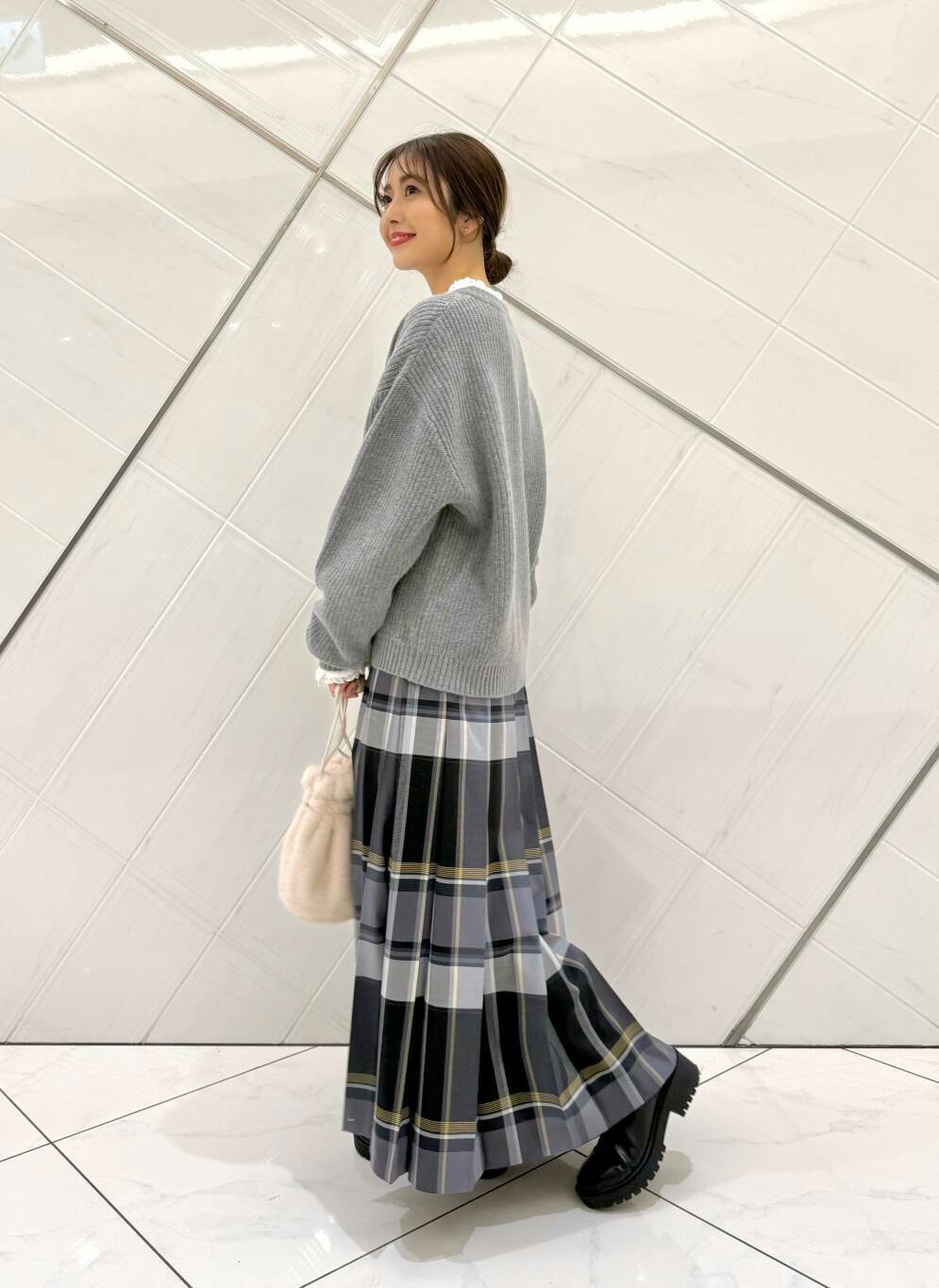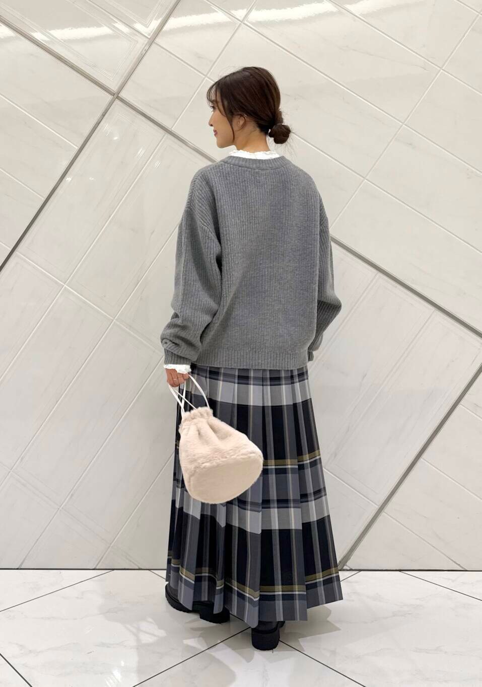 ニットの中に着ているブラウスは前回完売が早かったアイテムでニットやスウェットとレイヤードスタイルにもおすすめです。