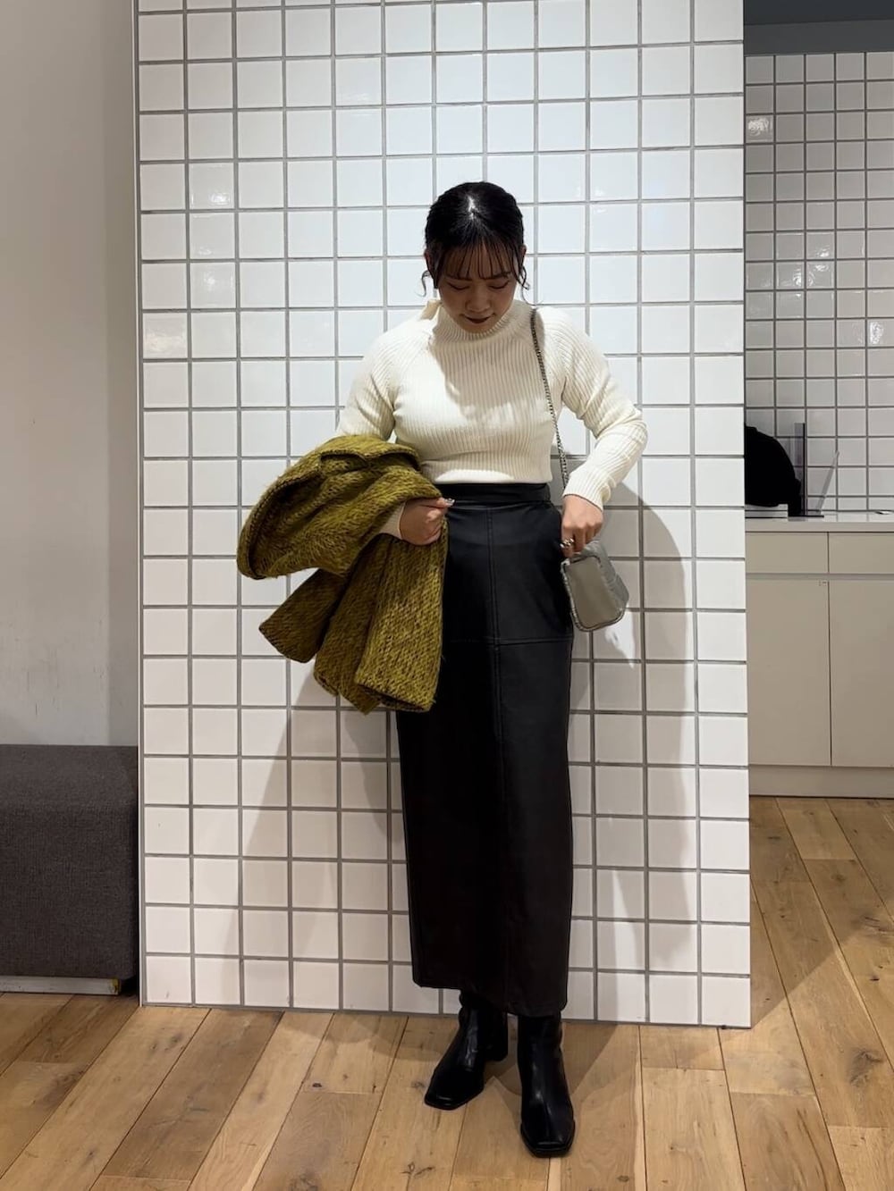 下から足元にかけて黒やレザーライクな仕様でまとめて強さもありつつ綺麗めな印象になります🖤