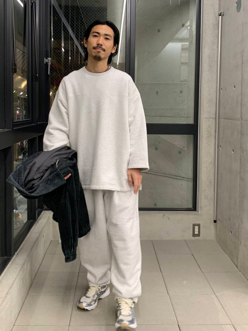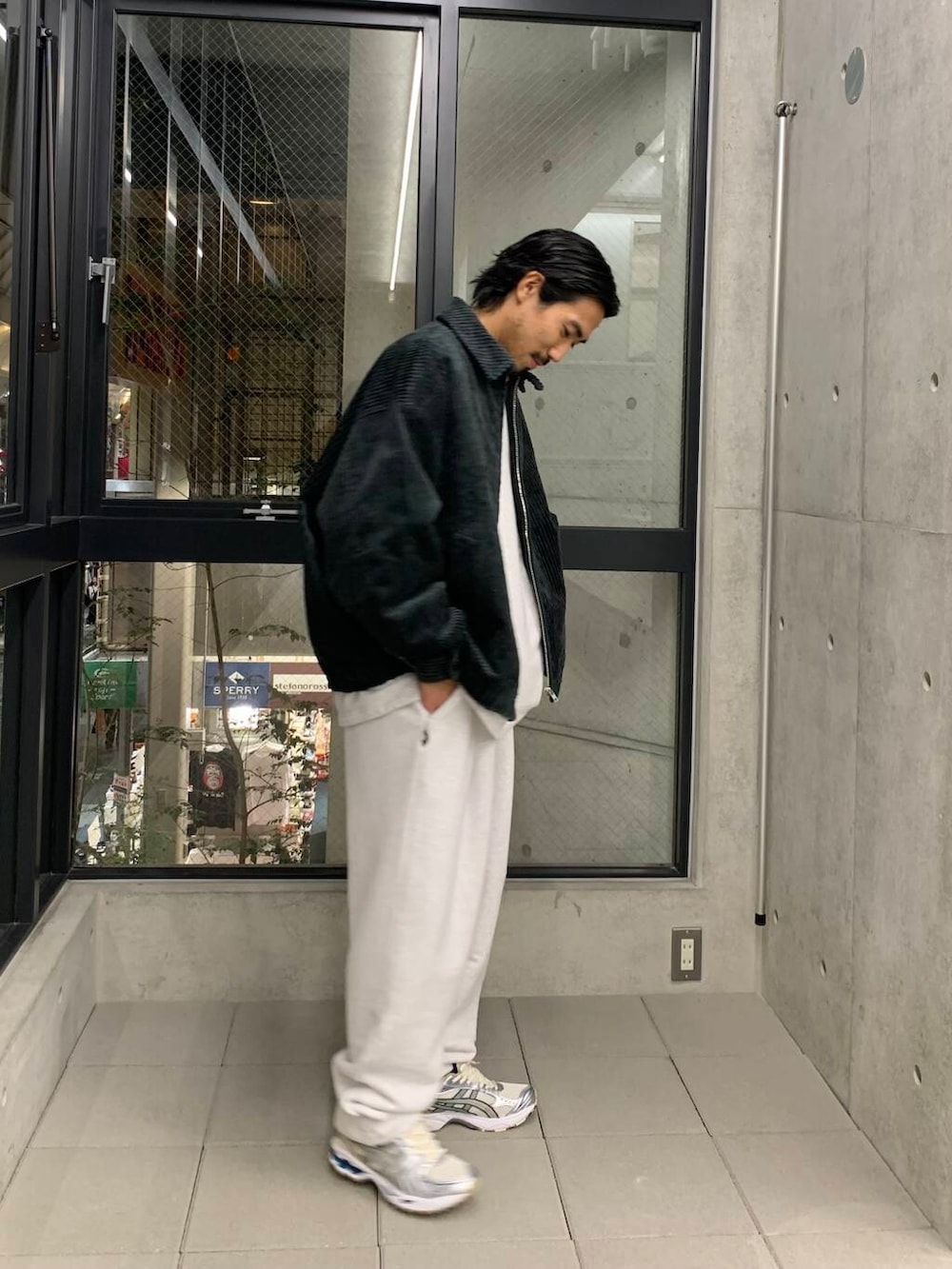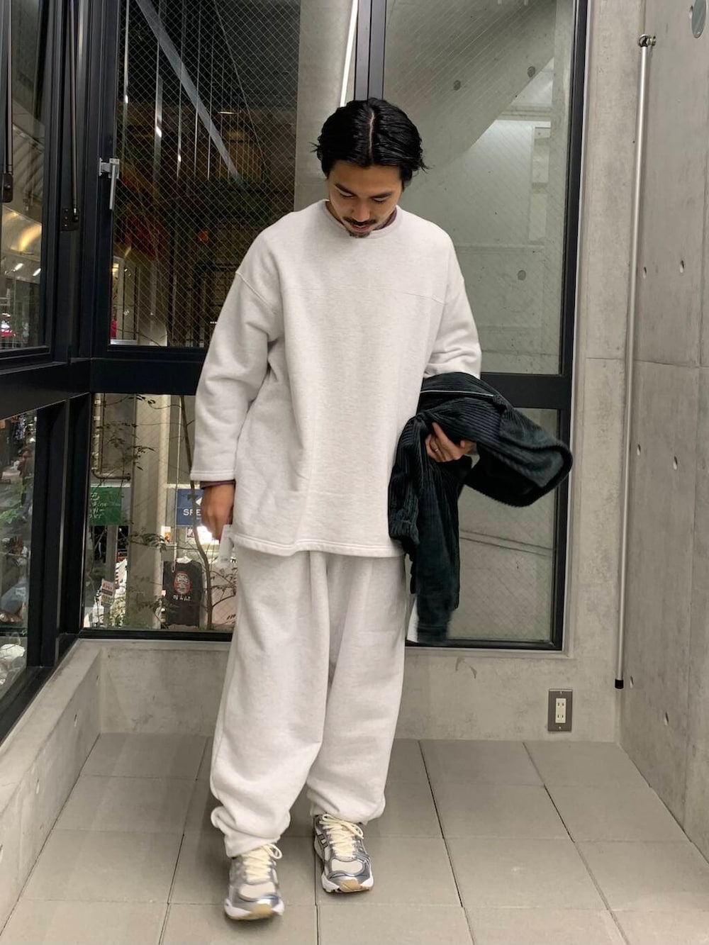 スウェットだけだと、ラフな印象ですが、ジャケットを合わせれば都会でも◎