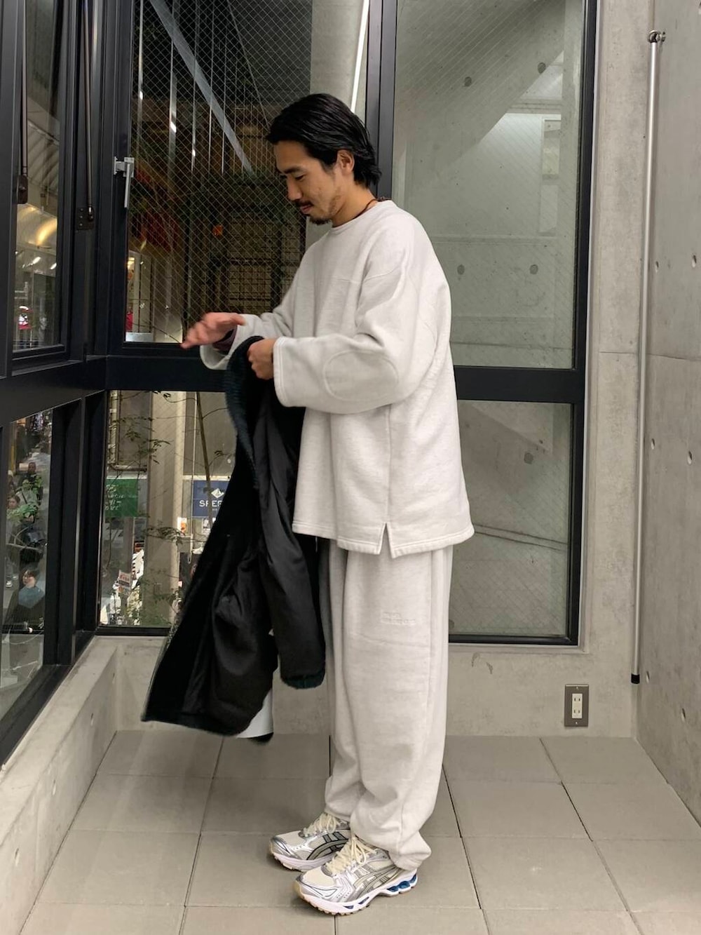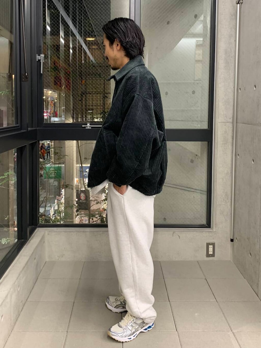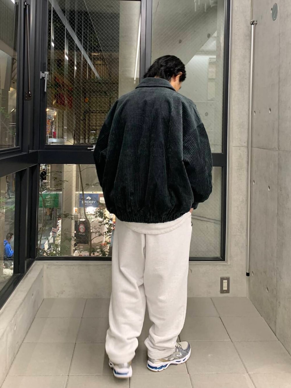 スウェットだけだと、ラフな印象ですが、ジャケットを合わせれば都会でも◎