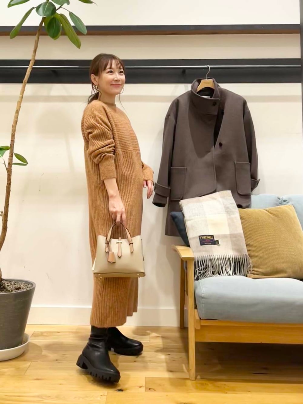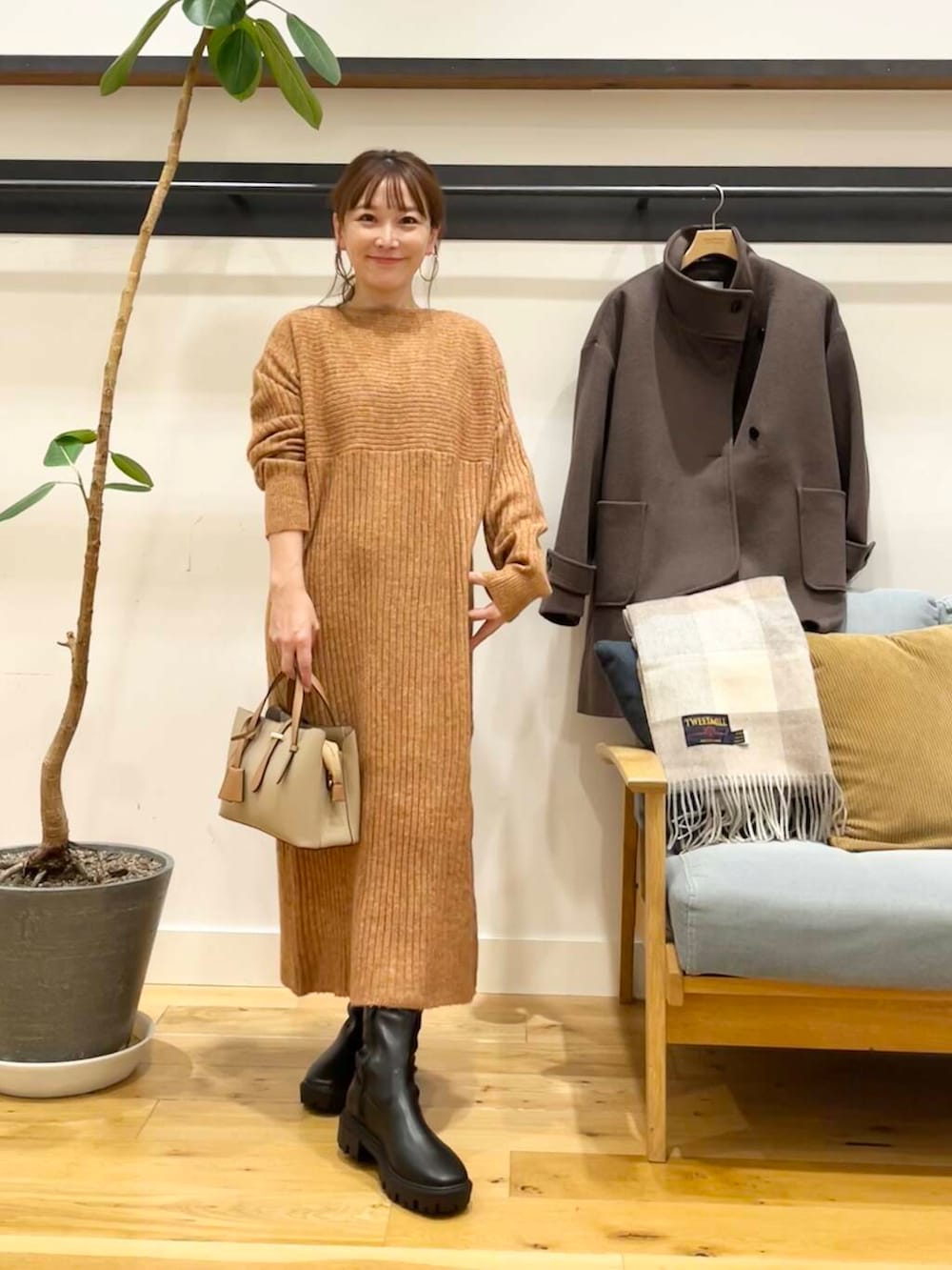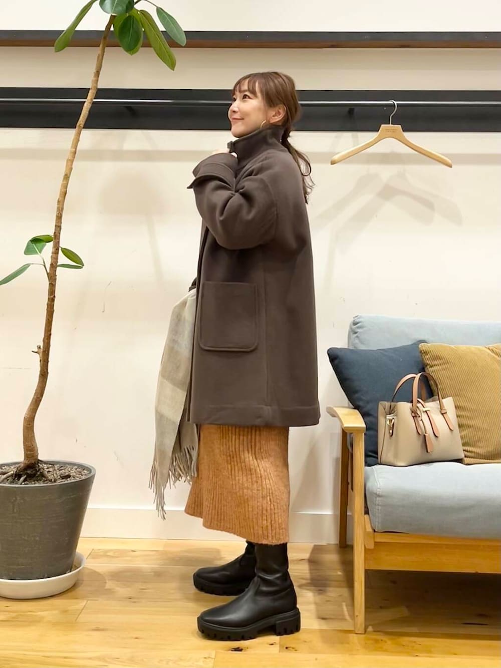 パンツを合わせてもいい感じですが小柄さんはショートブーツで脚がギリギリ出るか出ないかのちょうどいいぐらいの着丈です♪