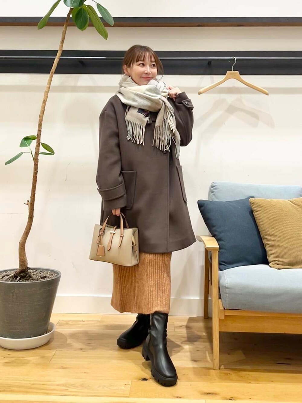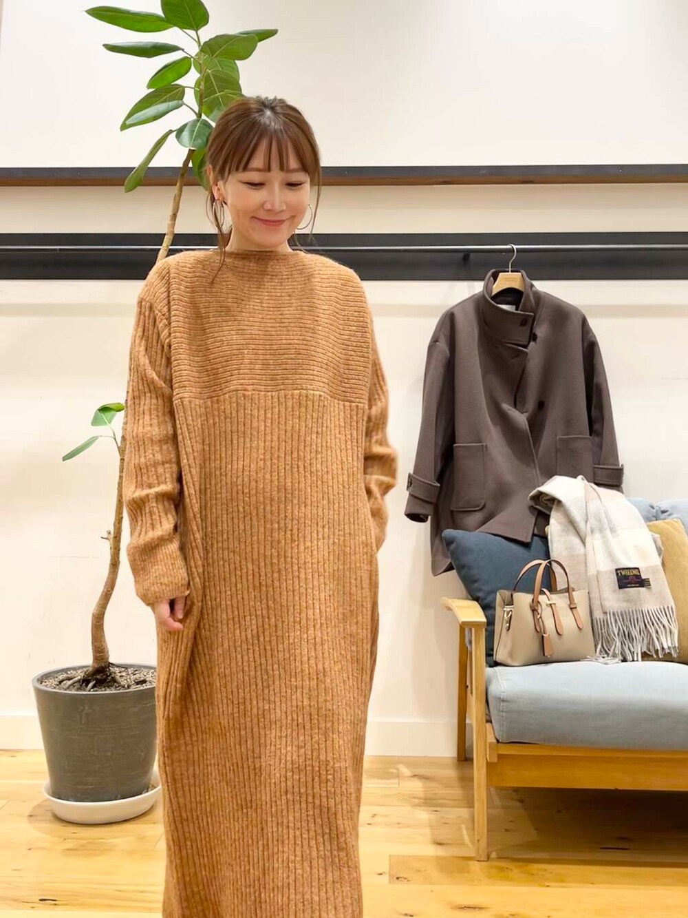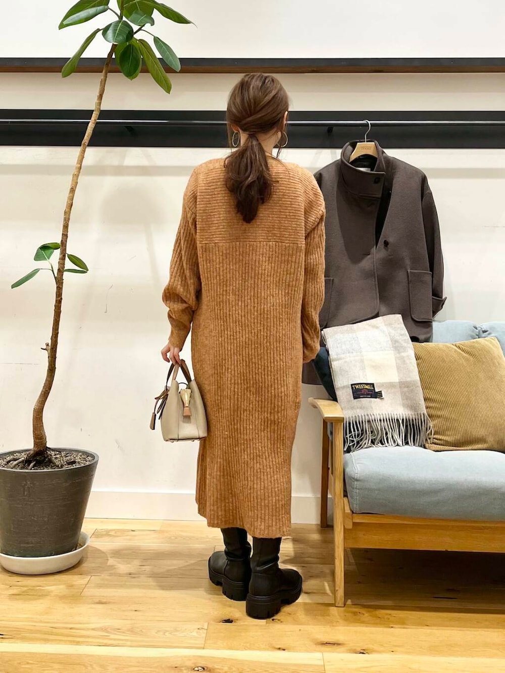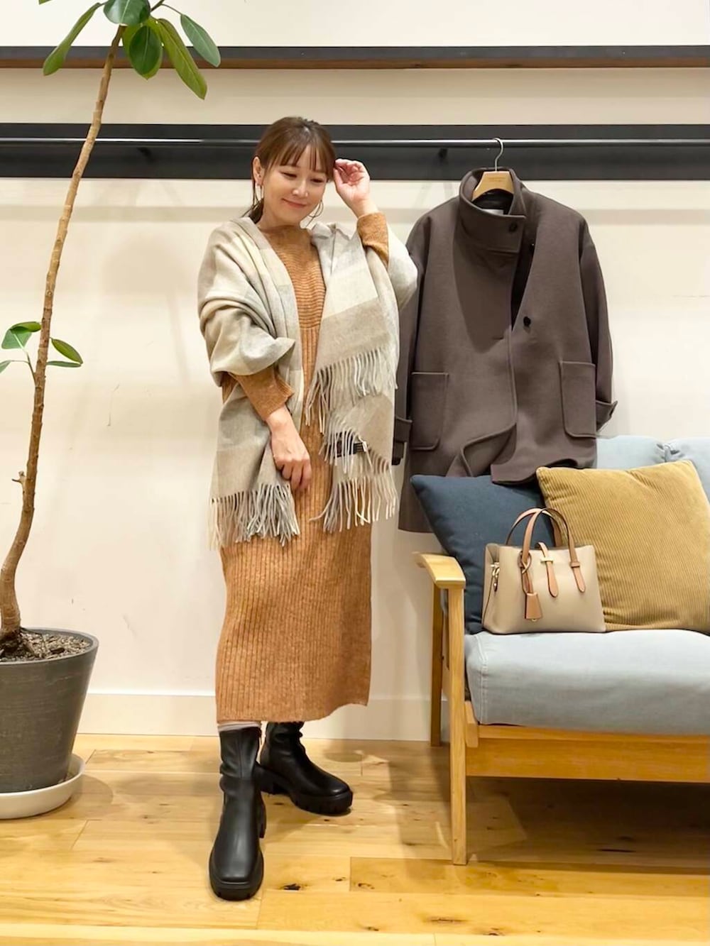 パンツを合わせてもいい感じですが小柄さんはショートブーツで脚がギリギリ出るか出ないかのちょうどいいぐらいの着丈です♪