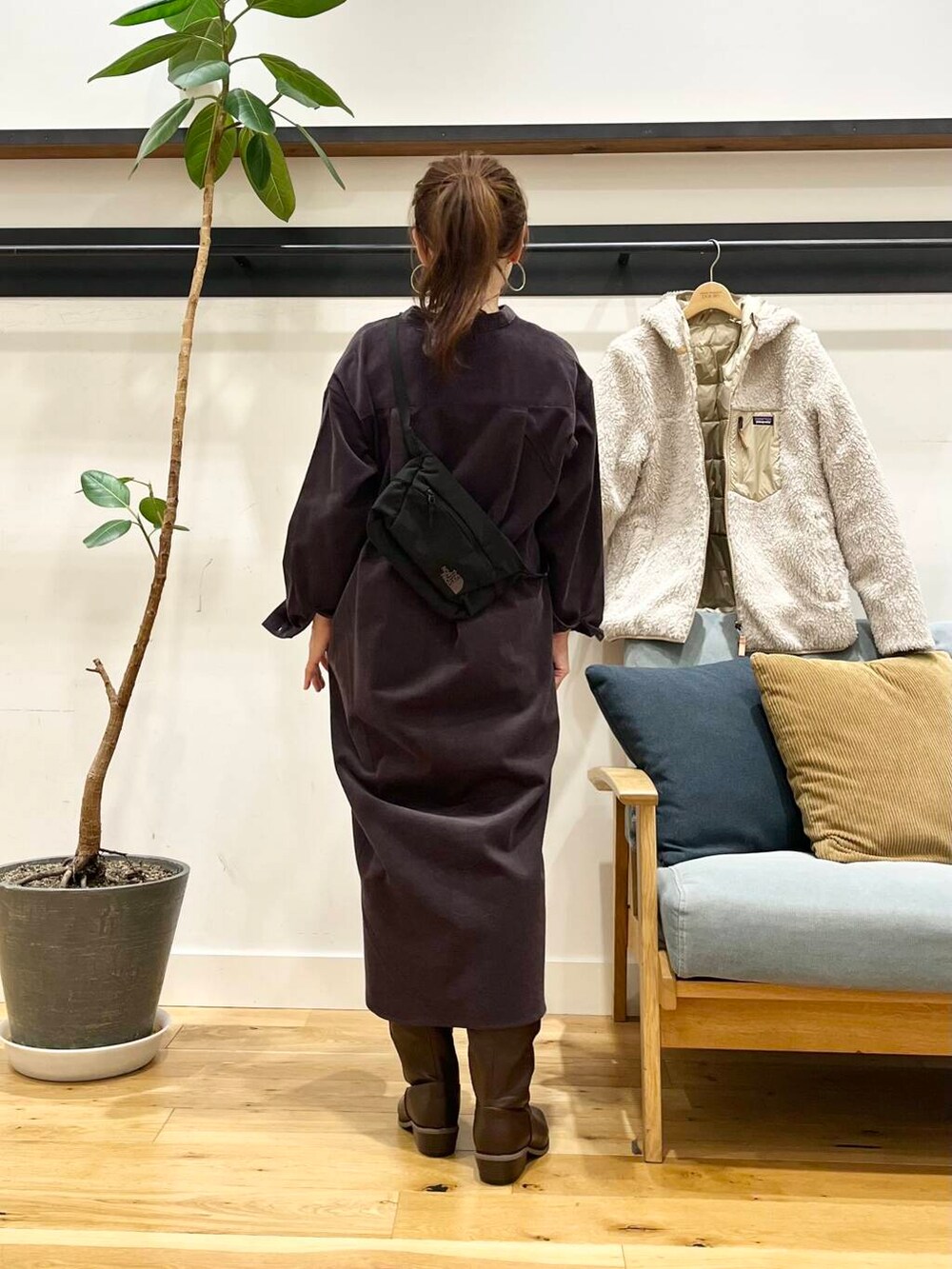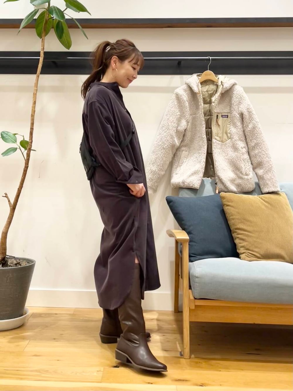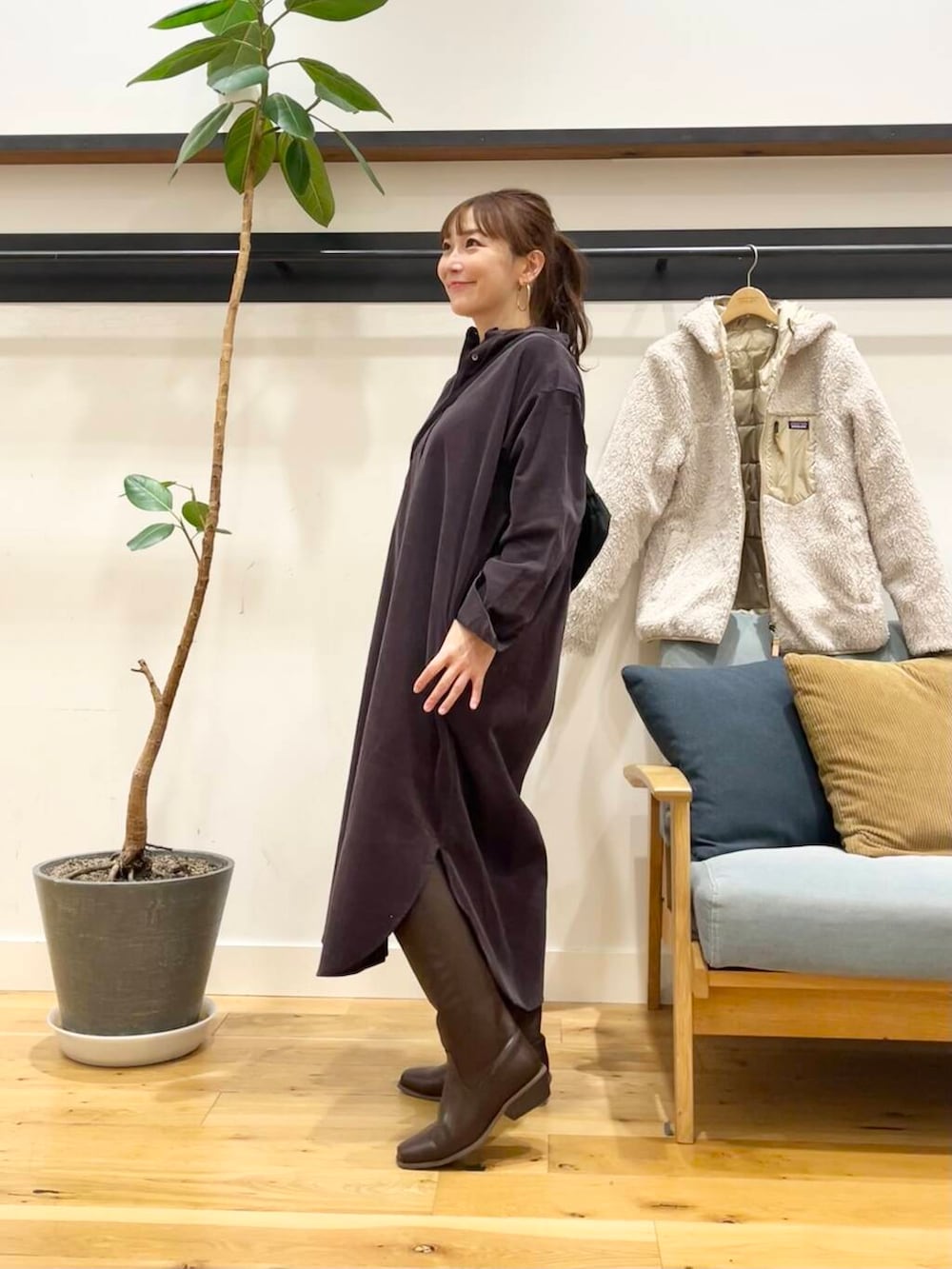 私はSサイズ前閉じで着て、ロングブーツと合わせてますが、サイドのスリットは結構深めに入ってるのでパンツ合わせにしても重くならずに着ていただけます◎