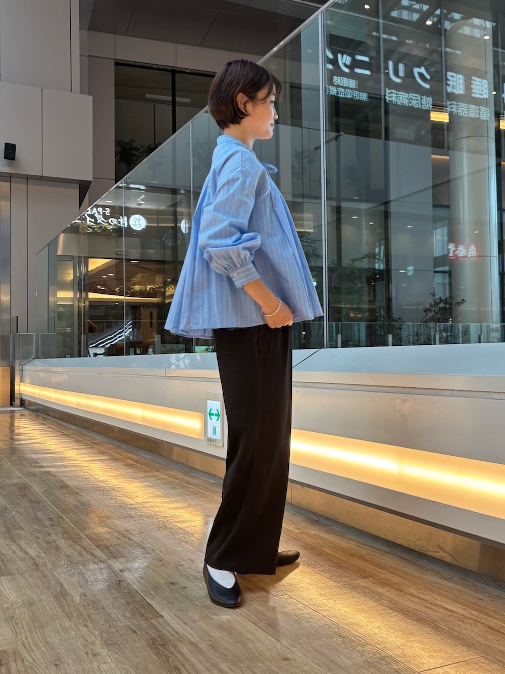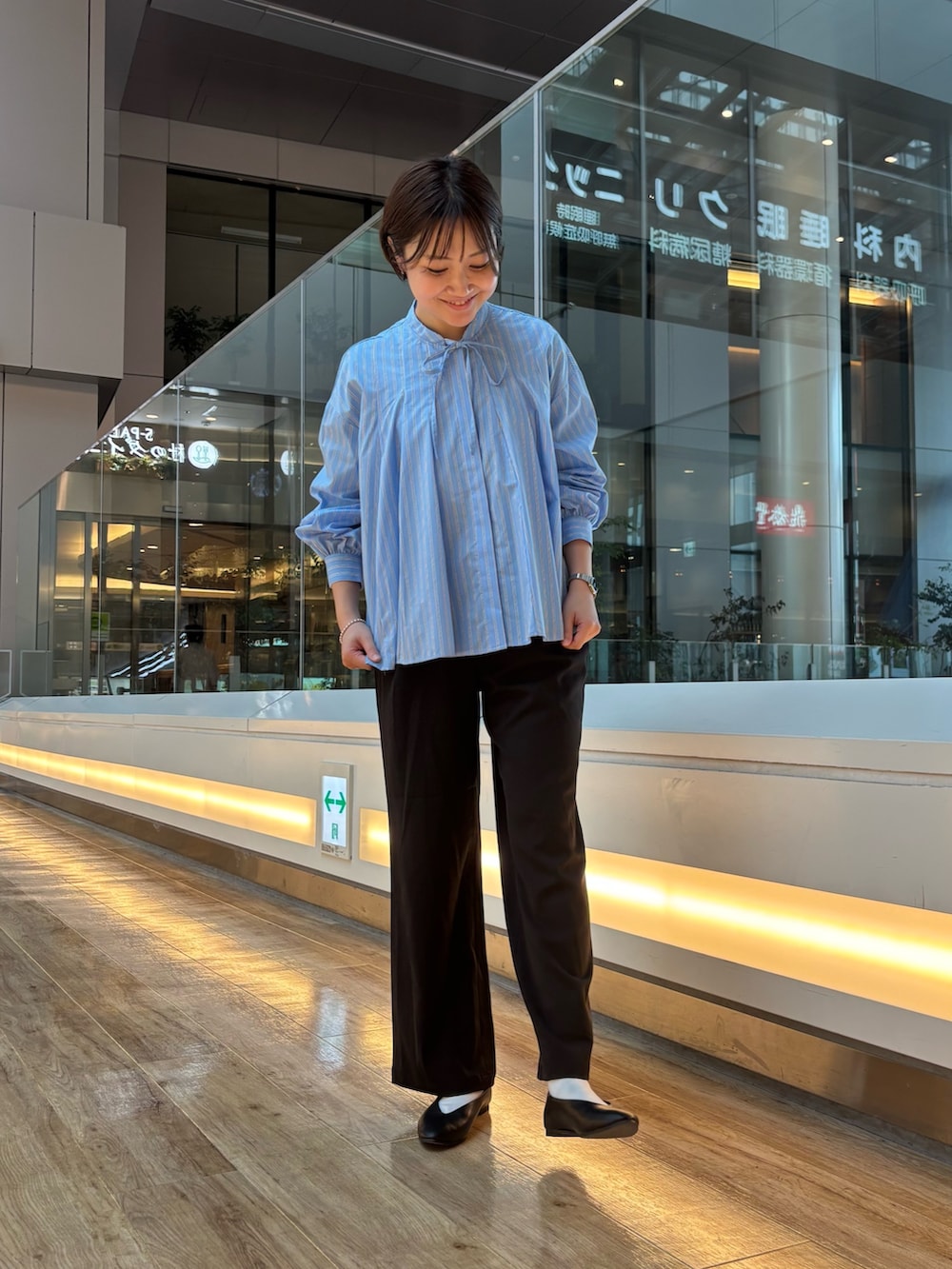 オフィスシーンにも使えるブラウス着てみました!フレアな袖丈がほどよい体型カバーにもなりますよ!