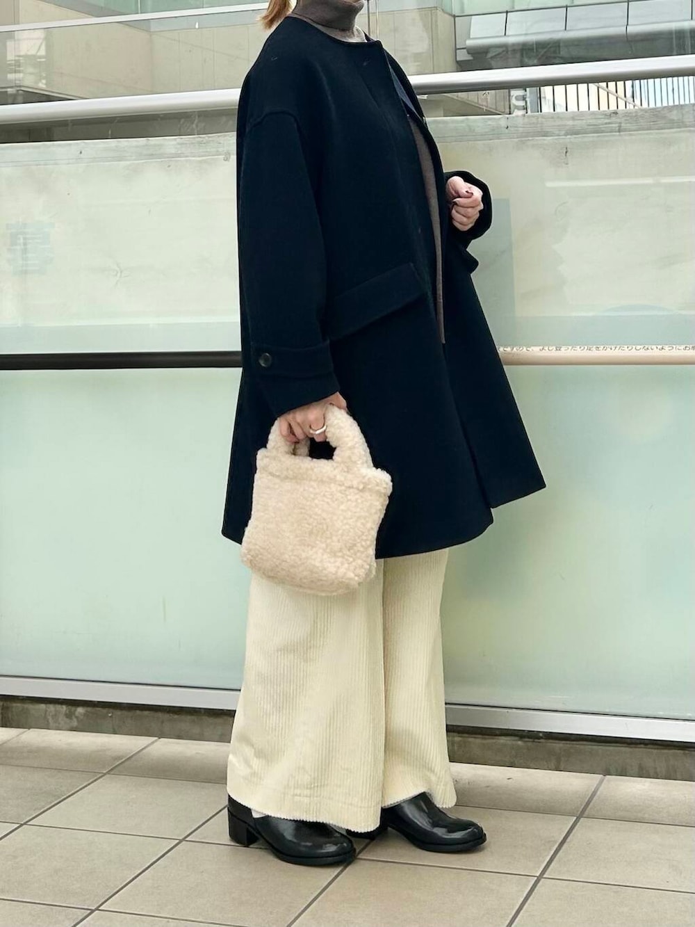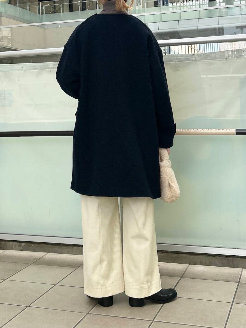 アウターはオンオフ使えるノーカラーのもを合わせました。