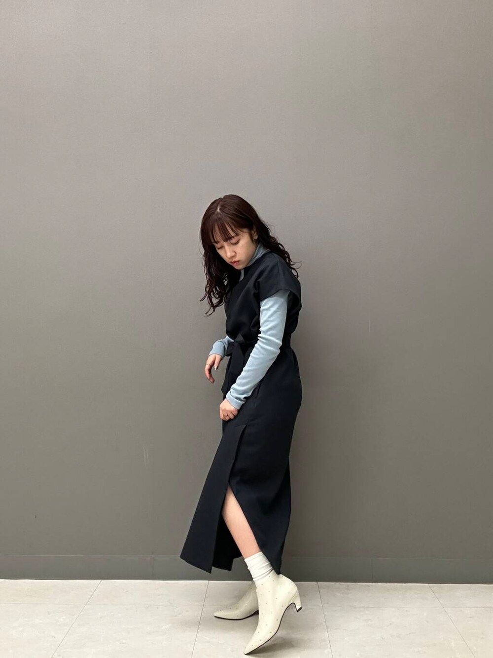 高めの位置からボタンで留められるスリットがあるので、ボタンを閉めワンピースとして1枚で着ても、開けてロングベストとして下にパンツやスカートを見せても、ロングブーツで脚をチラ見せしても◎