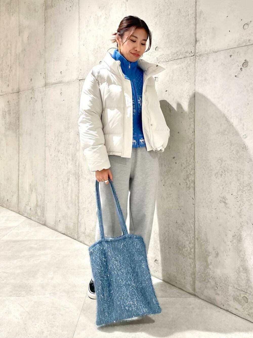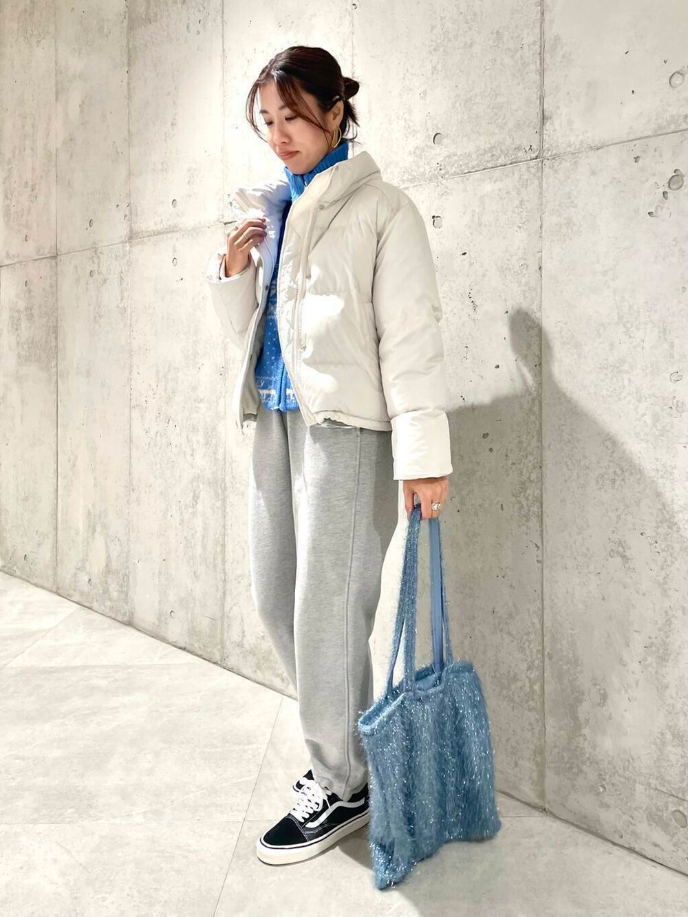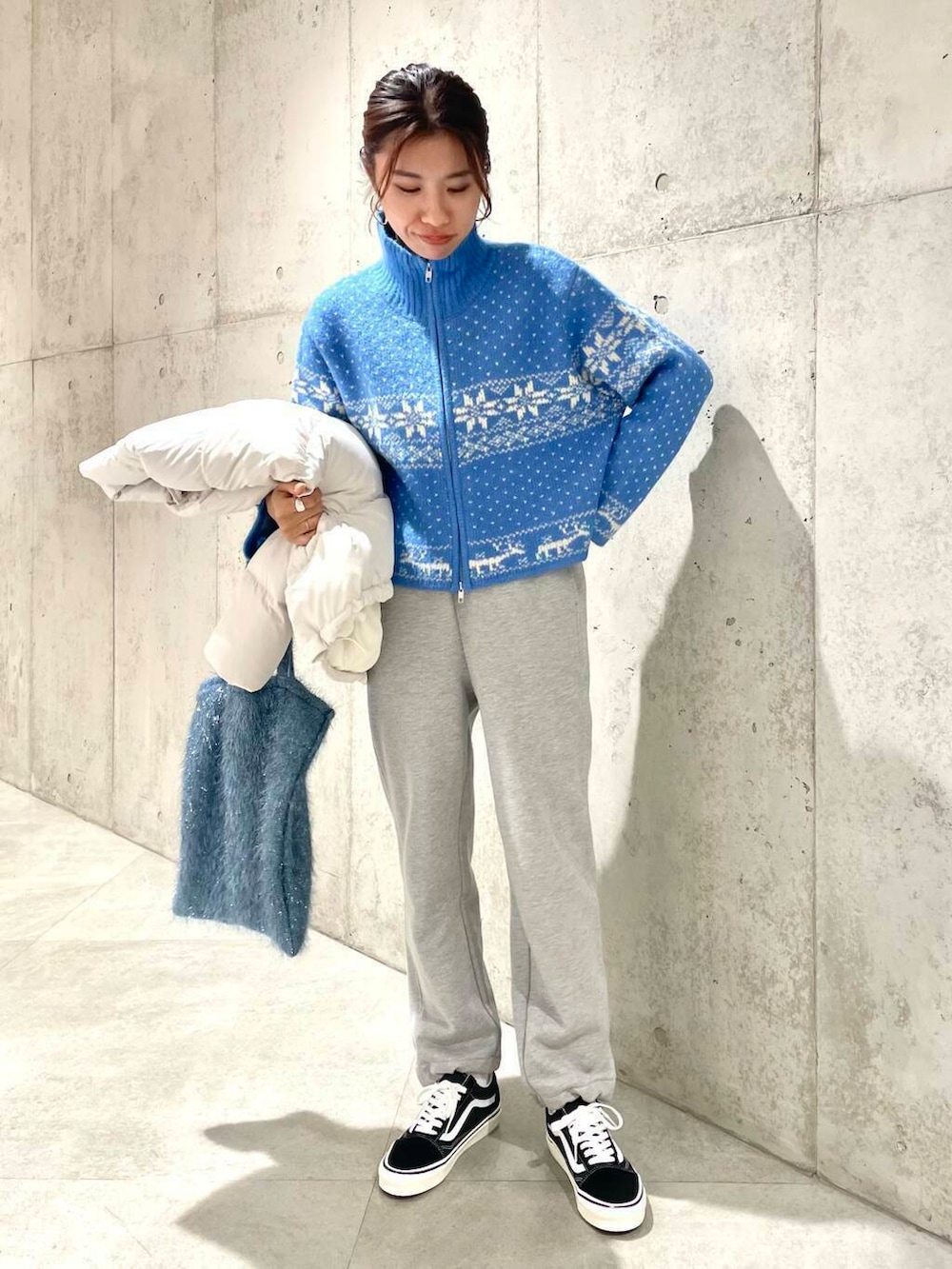 差し色のブルーが効いてるニットは、フルジップなので着脱しやすいのが◎