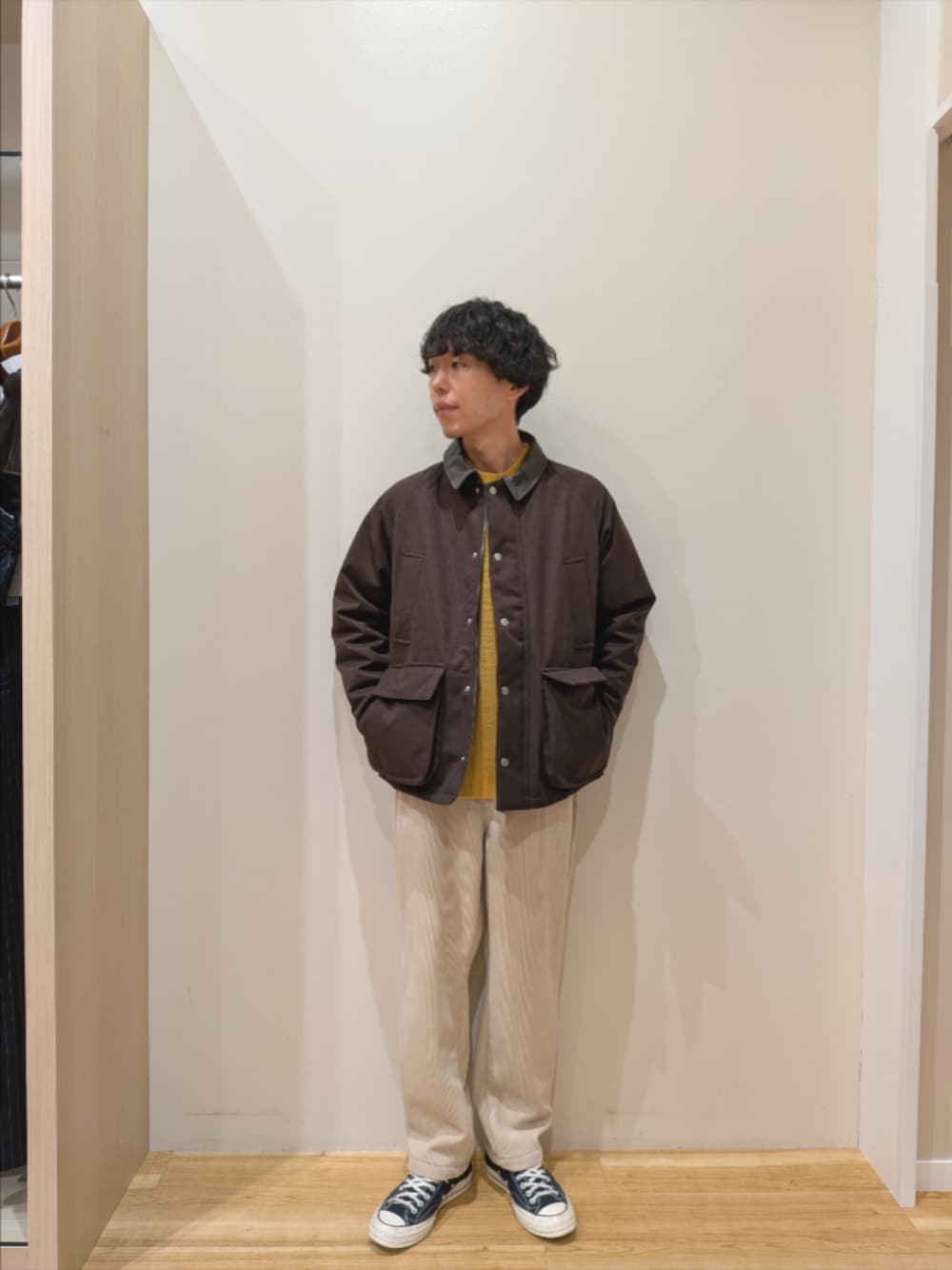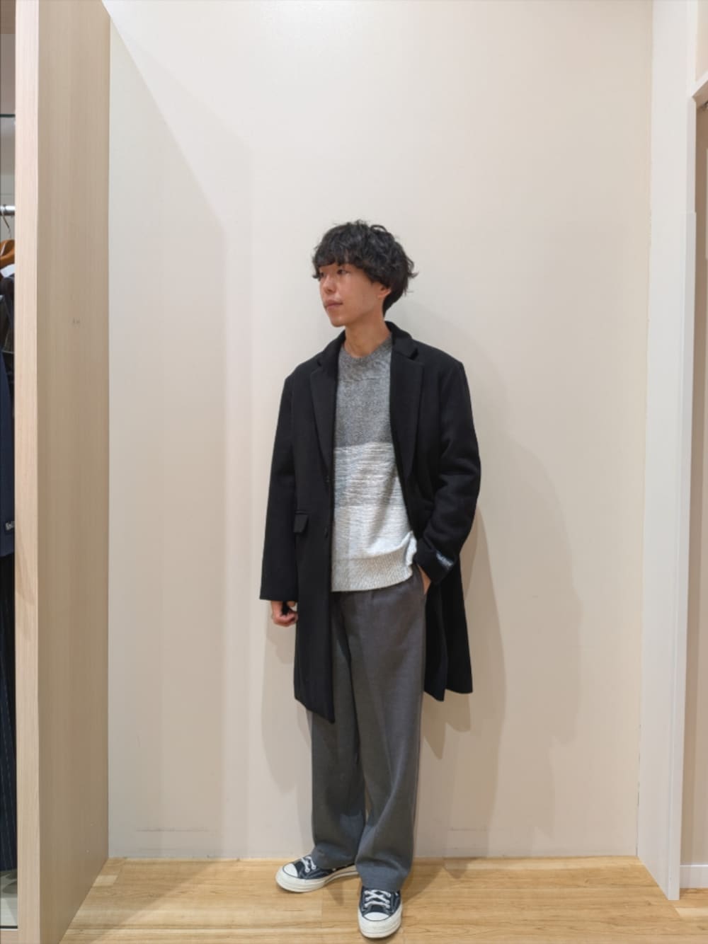 アウターはLサイズ、ニットとパンツはMサイズを着用しております。