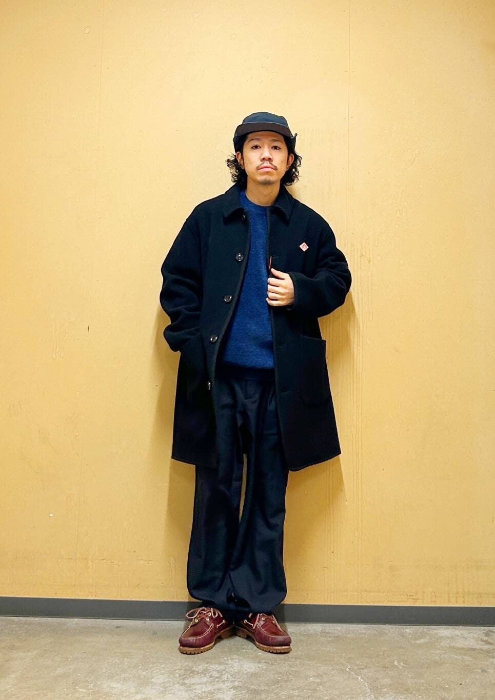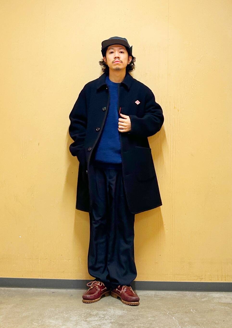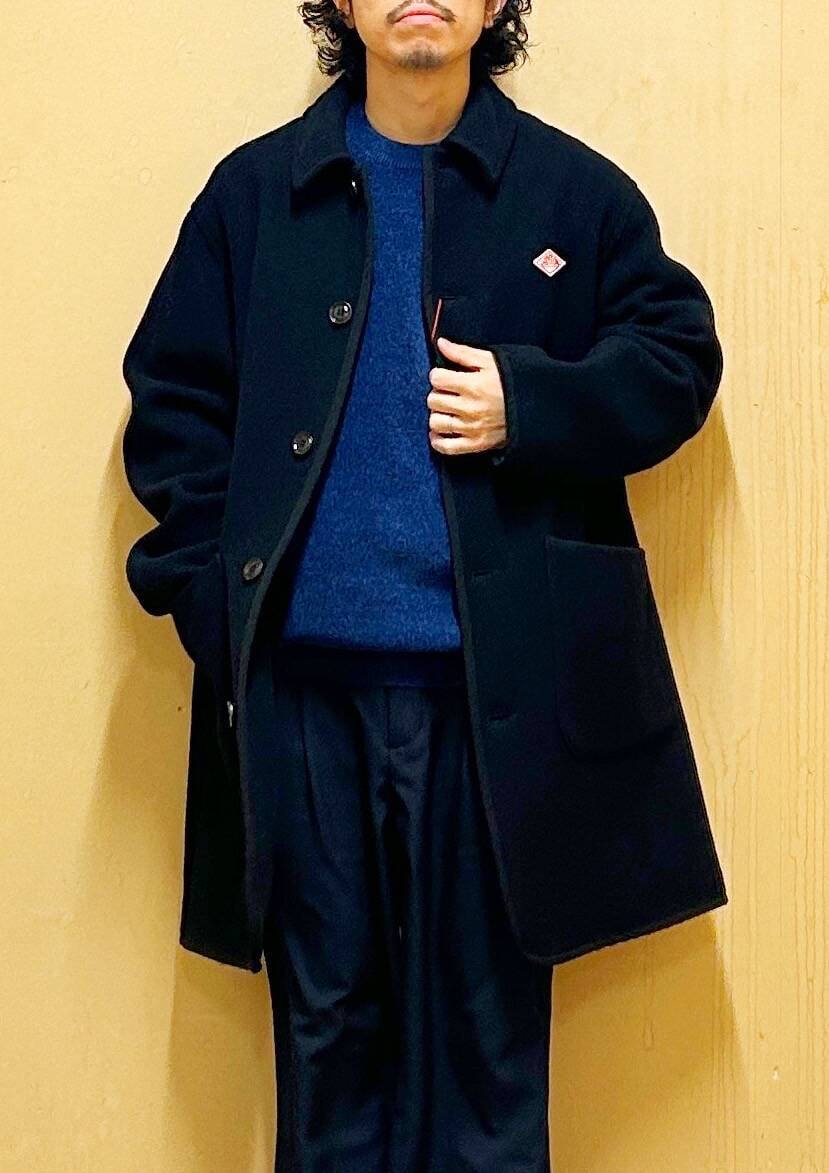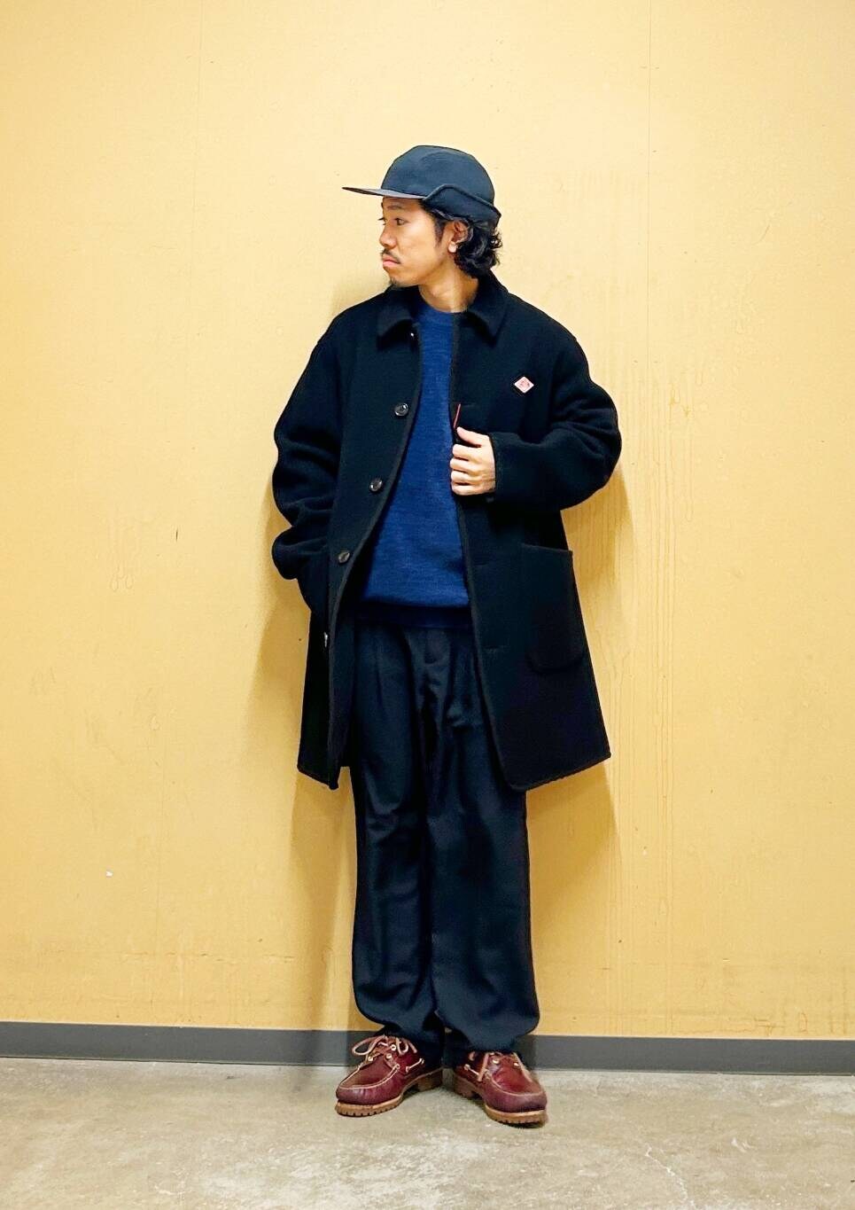 今回はDANTONカバーオールコートとツータックトラウザーを使用したコーディネート。