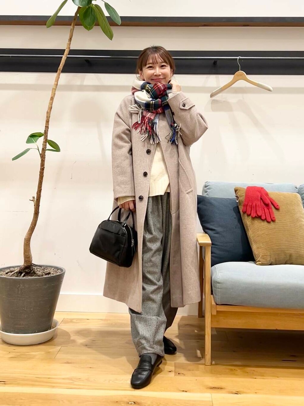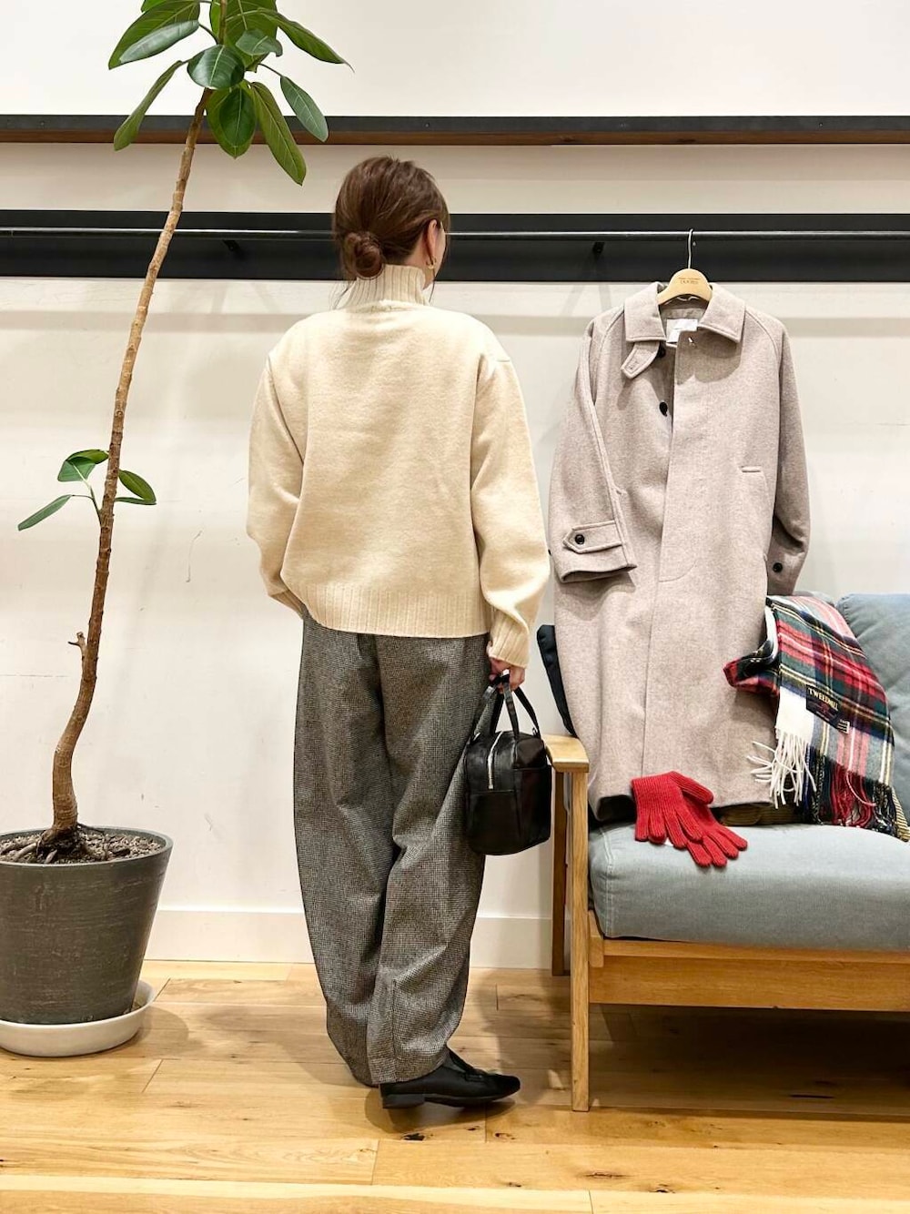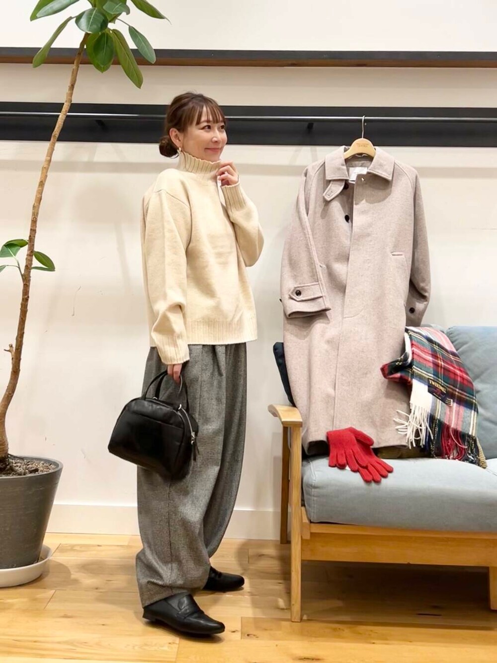 ボトムスにはボリューム感が可愛いかぐれのウールルーズテーパードパンツの千鳥の柄を合わせてます。