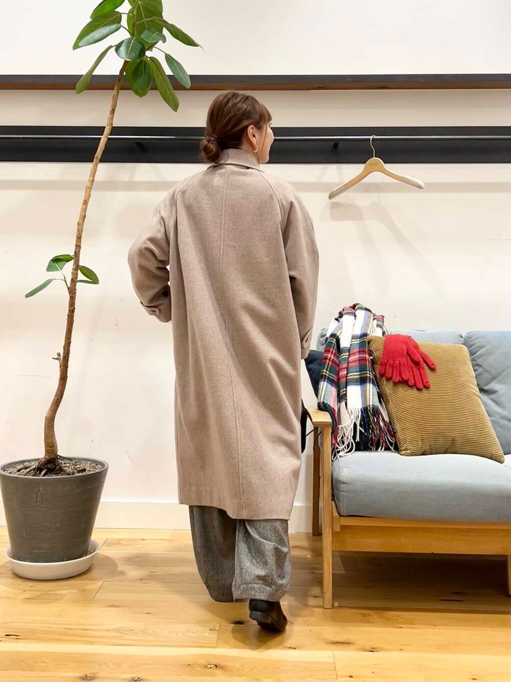 アウターにはウール100バルマカーンコートを着ています。