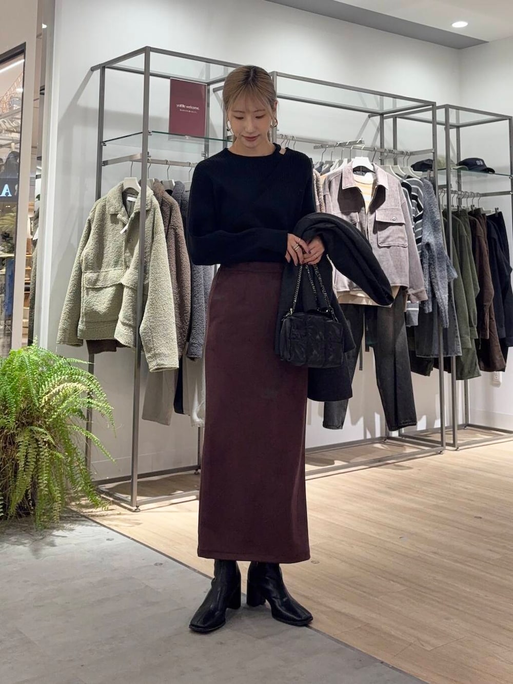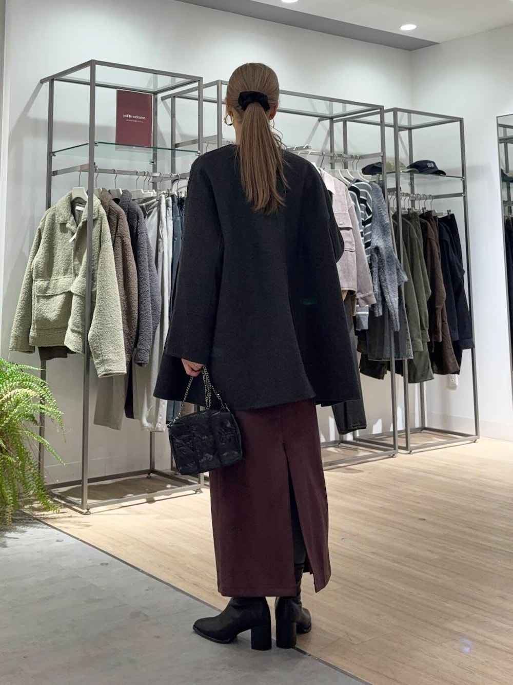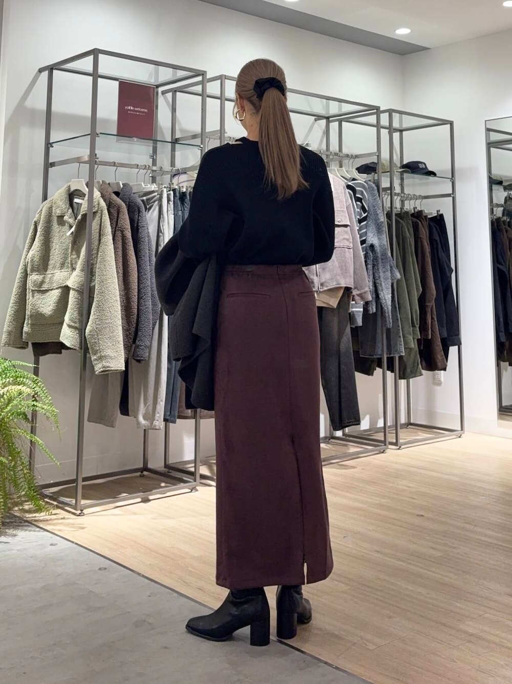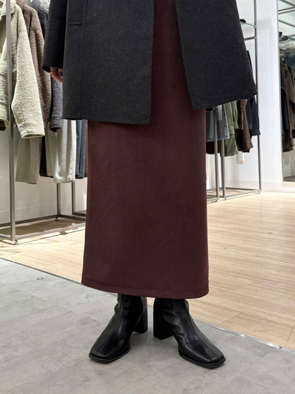 ボルドーのカラーが上品なスカートは柔らかい着心地で着やすく、スウェードのような表面感も冬らしさをプラスしてくれます◎
