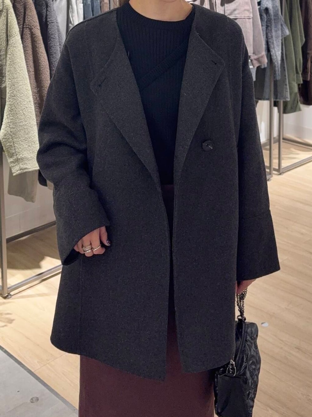 もっと寒くなってきたら赤や白などのハイネックのニットを合わせて、首から見せるのもお洒落で暖かさもバッチリです♪