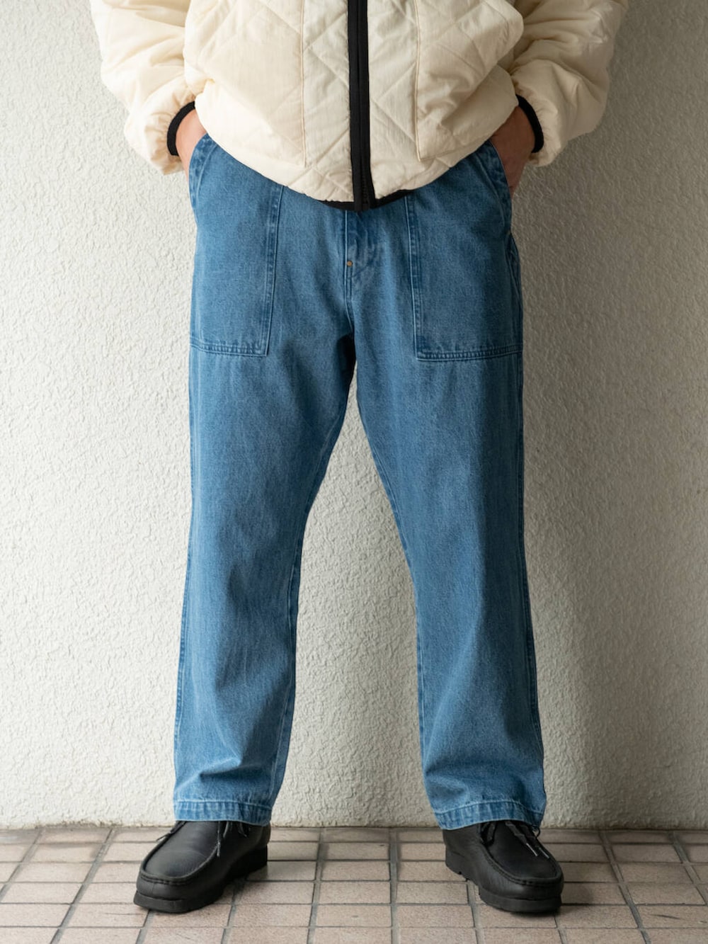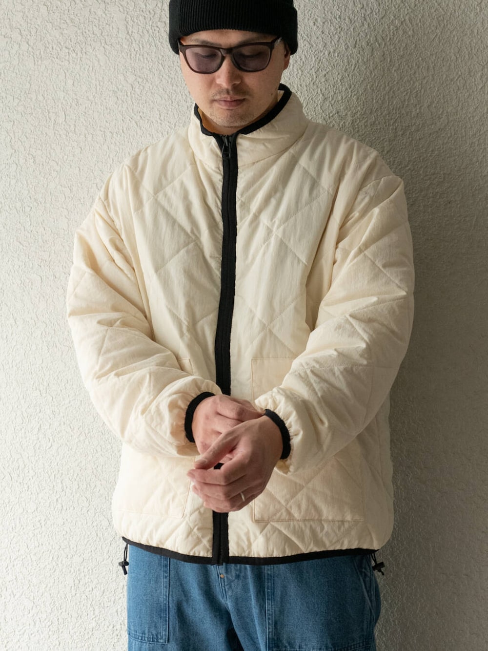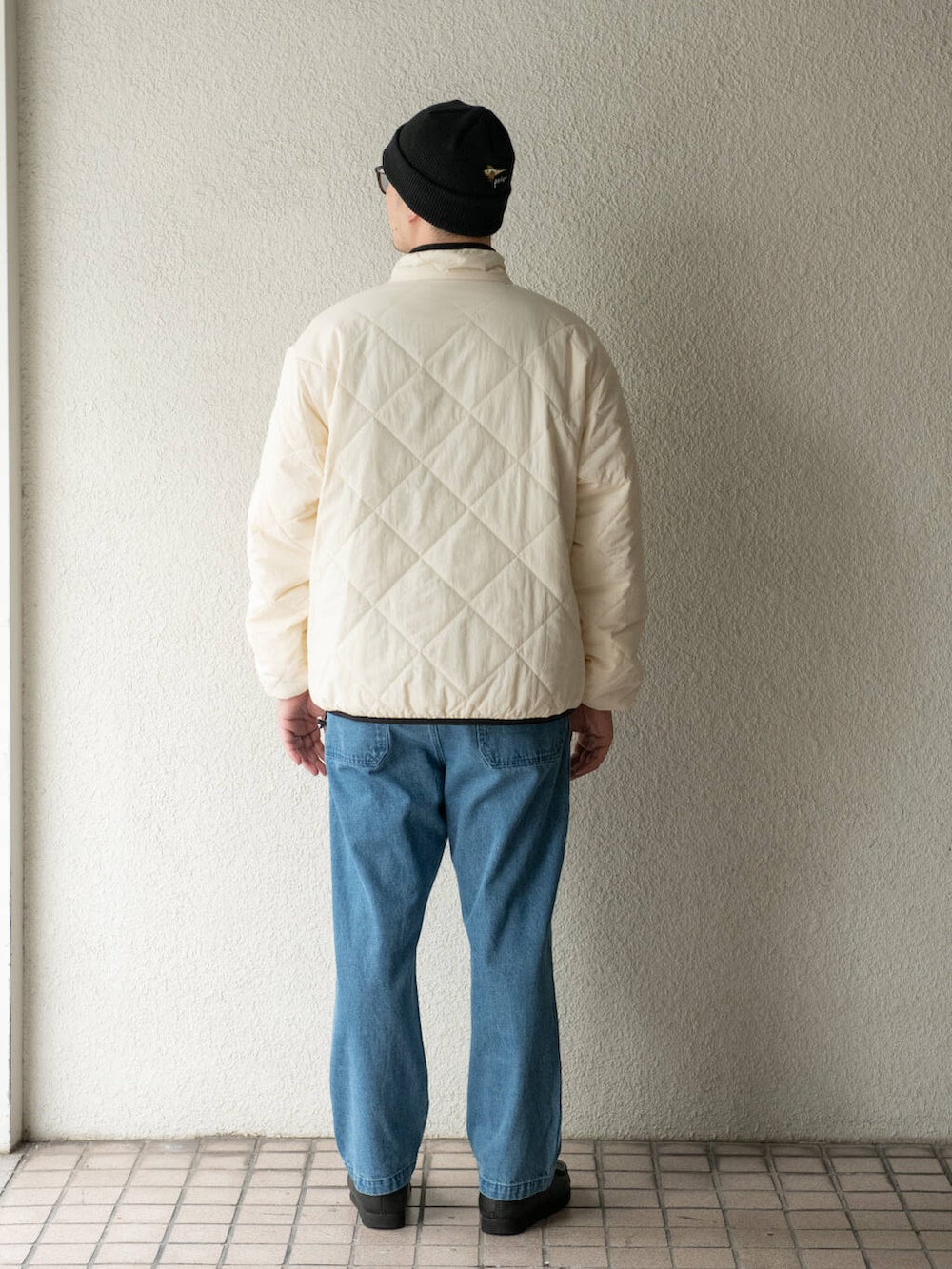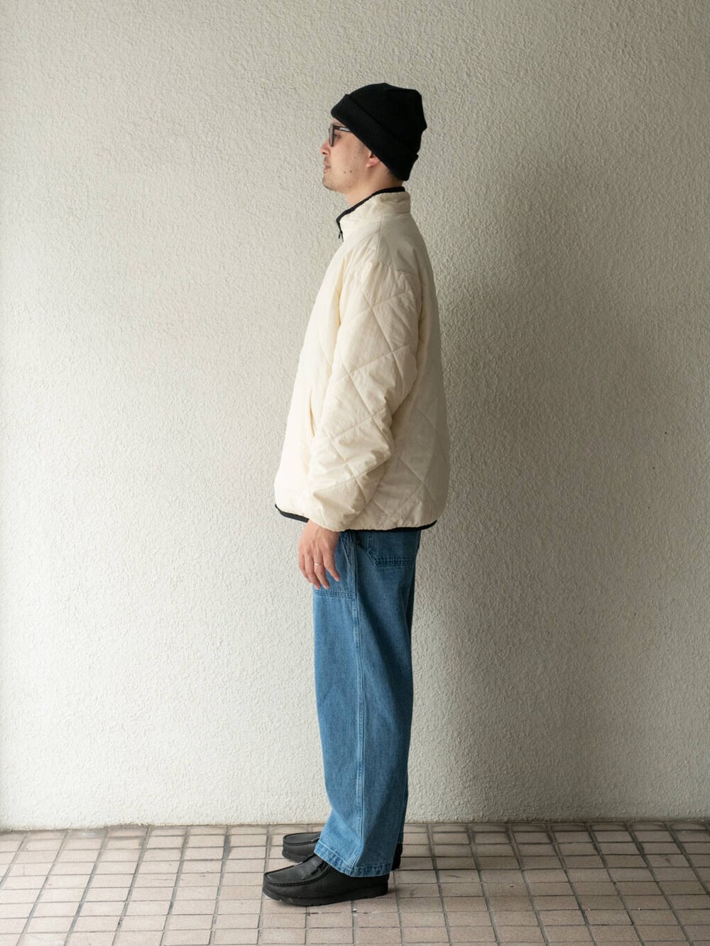 ホワイトのアウターとブルーのデニムで軽く仕上げたカジュアルスタイル。