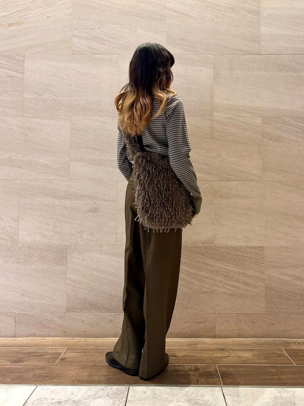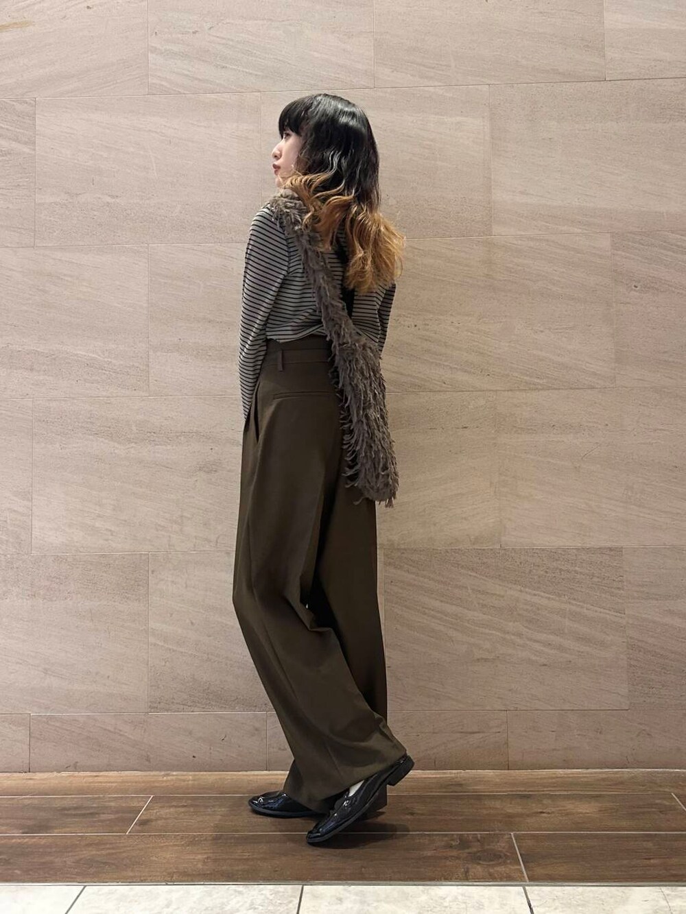 ポイントにブラウンのファーバッグをプラス。