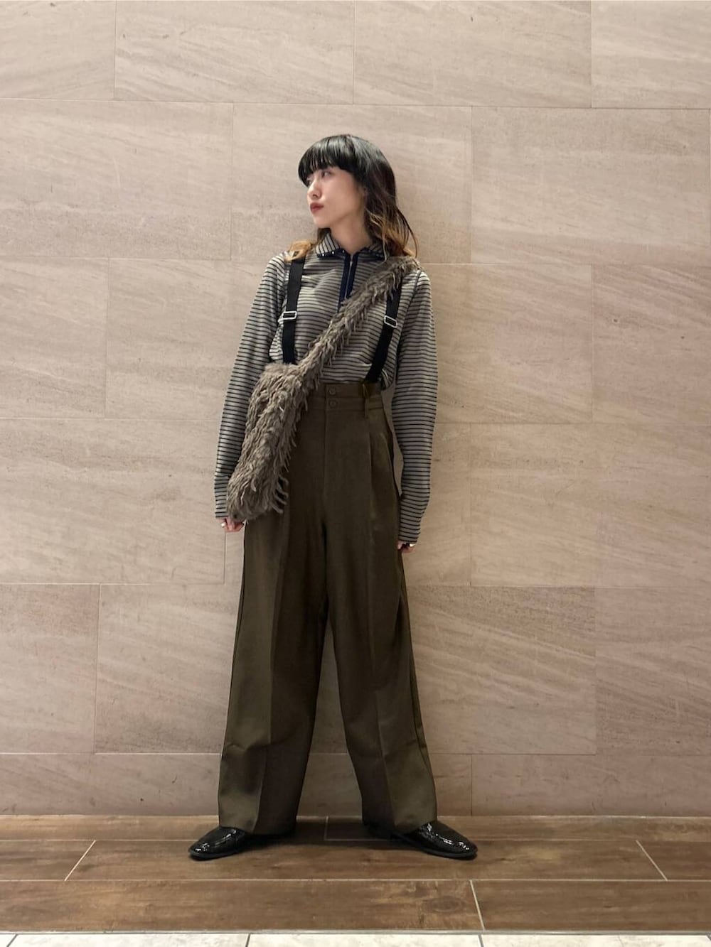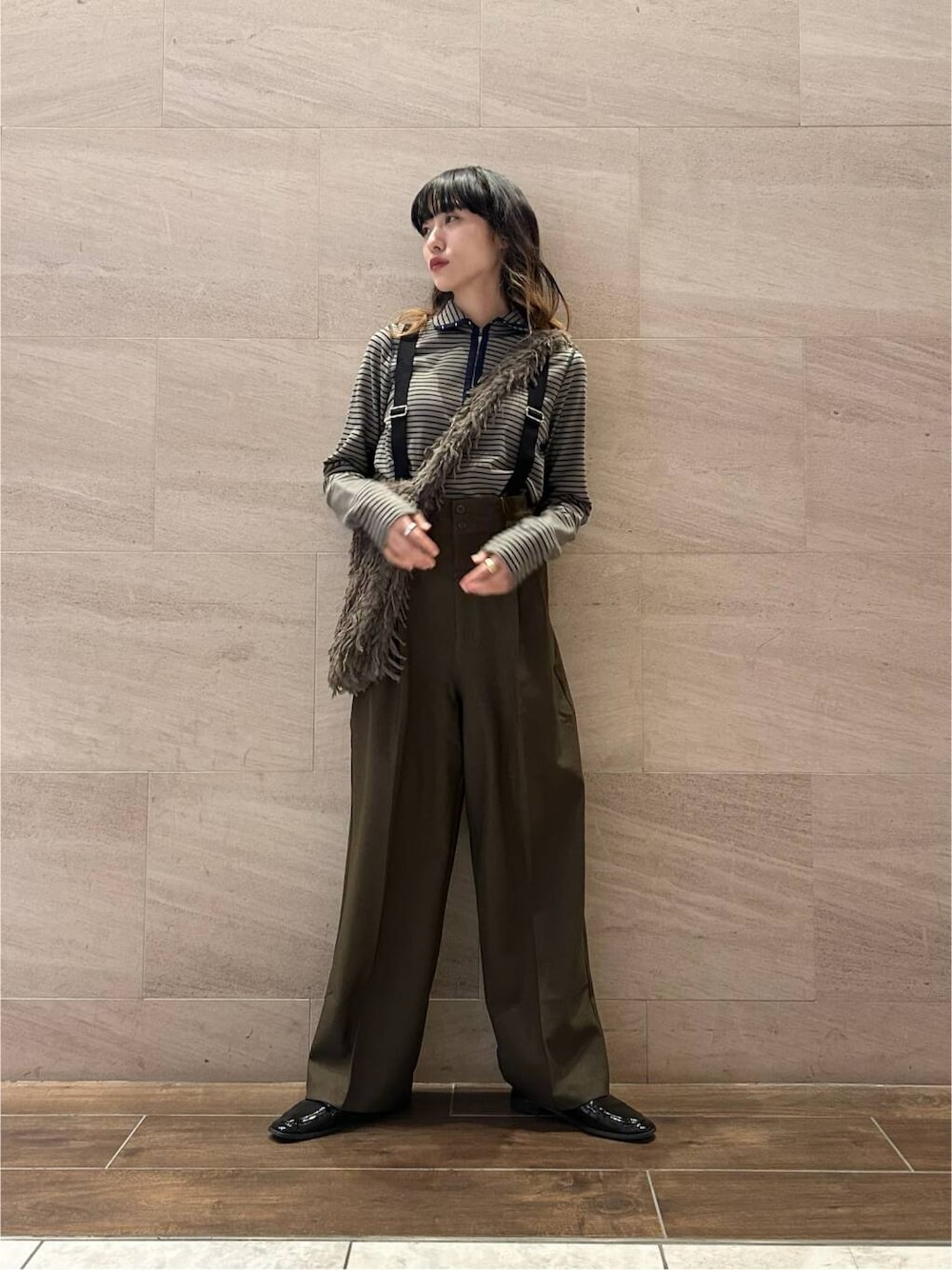 ネイビー×カーキのボーダートップスに、ブラウンのサスペンダーパンツを合わせて、大人カジュアルなスタイルにしてみました。