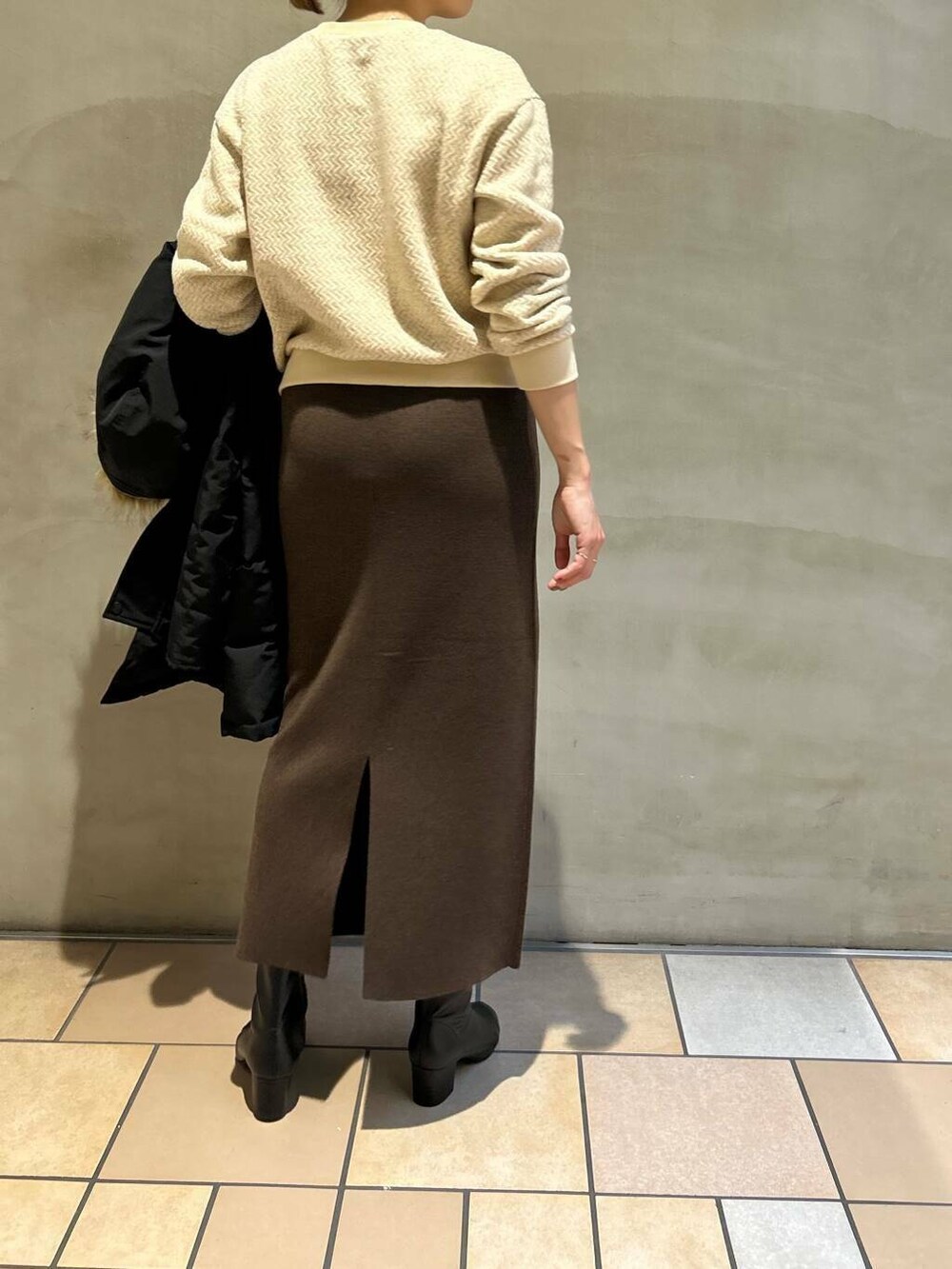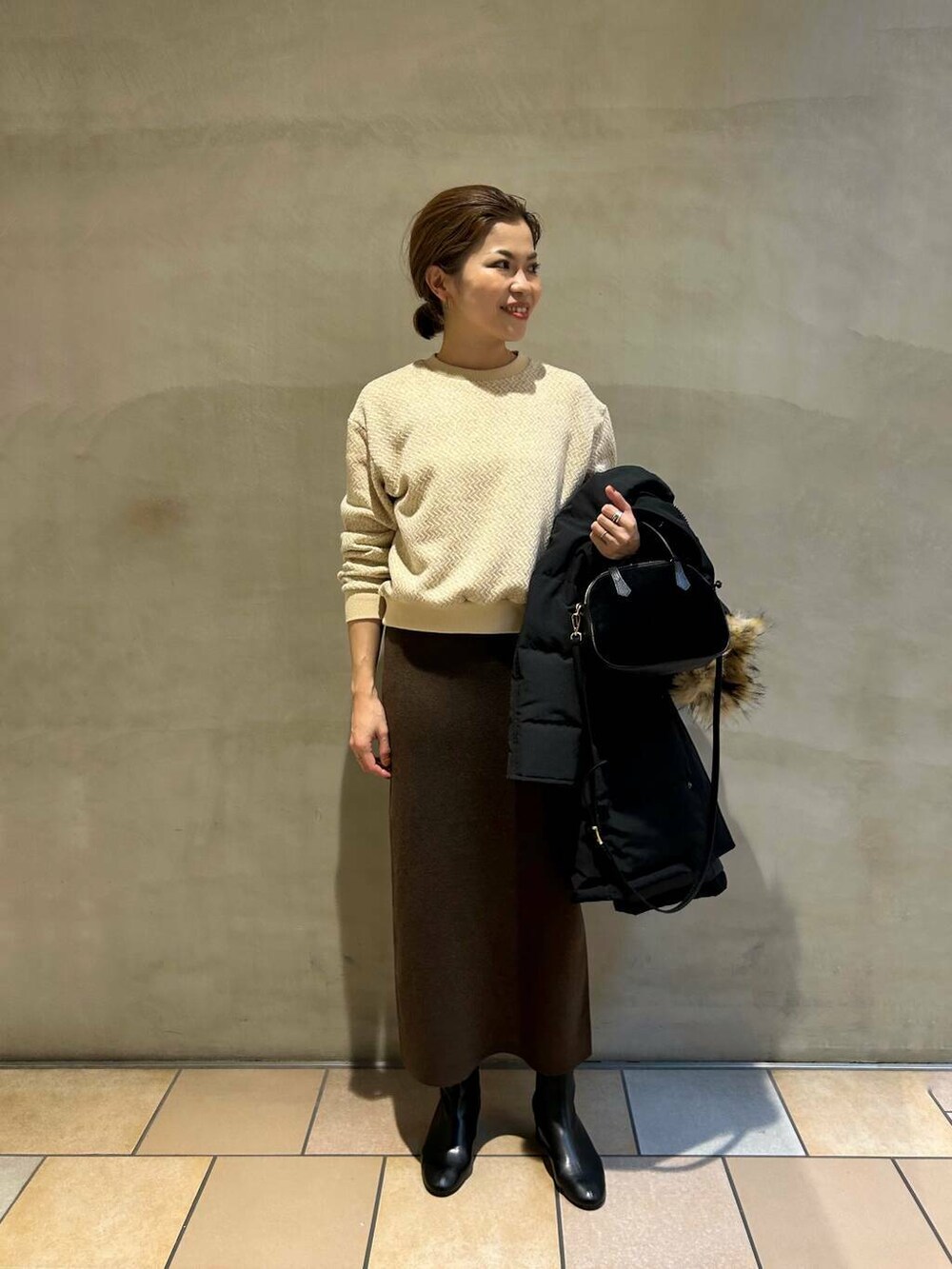 楽チンな裏起毛のカットソーと、腰回りストレスフリーなニットのスカートで、リラックスして楽しめるようにまとめました!