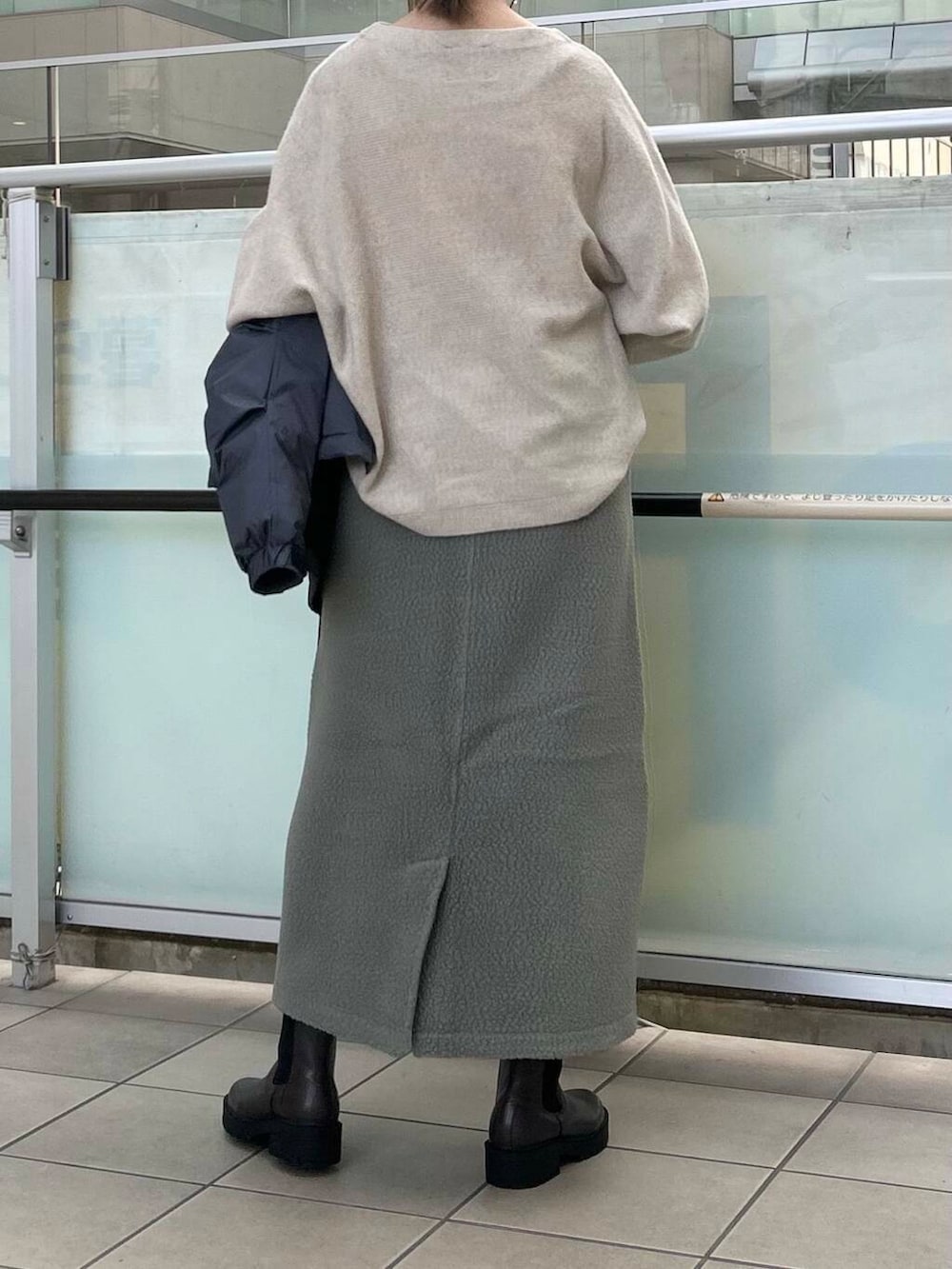 カジュアルになりすぎないようにトップスはゆるめのニットを合わせて女性らしさをプラスしました。