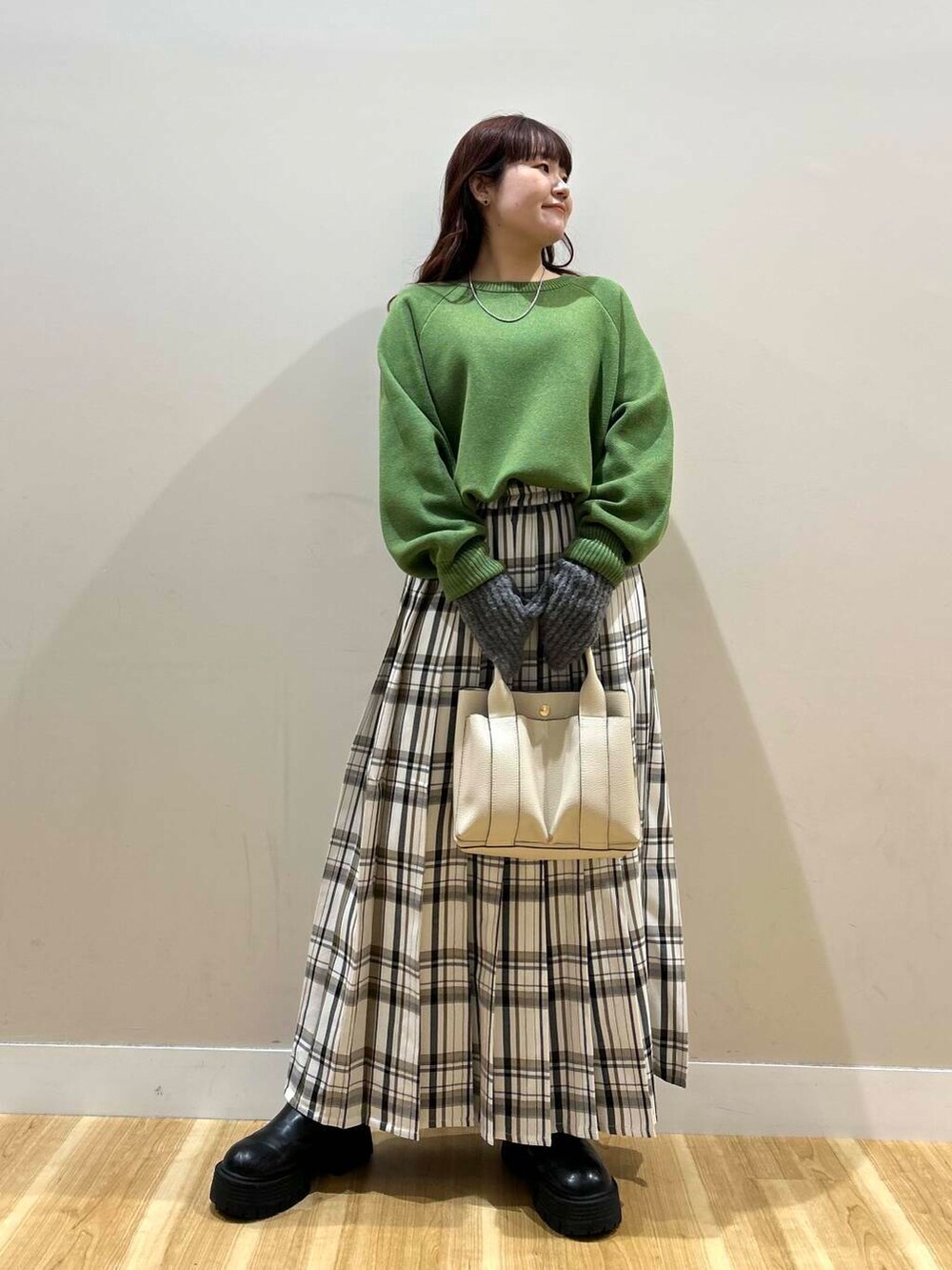 鮮やかなグリーンが目を惹くニットはスウェットっぽいデザインで楽ちん暖かで着やすいです◎