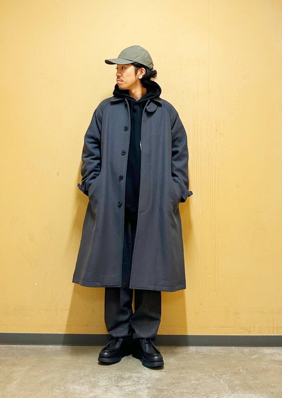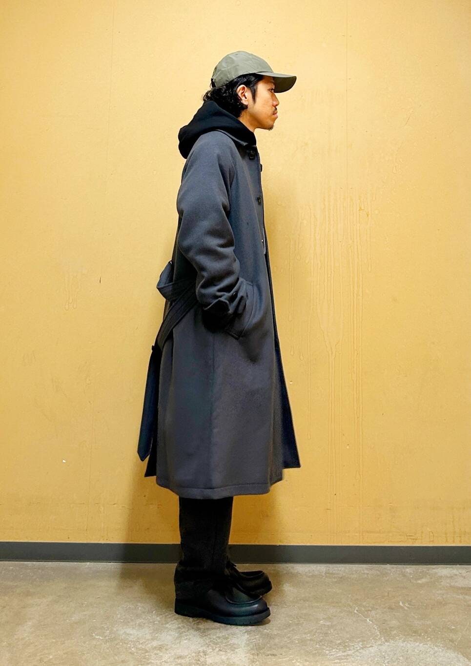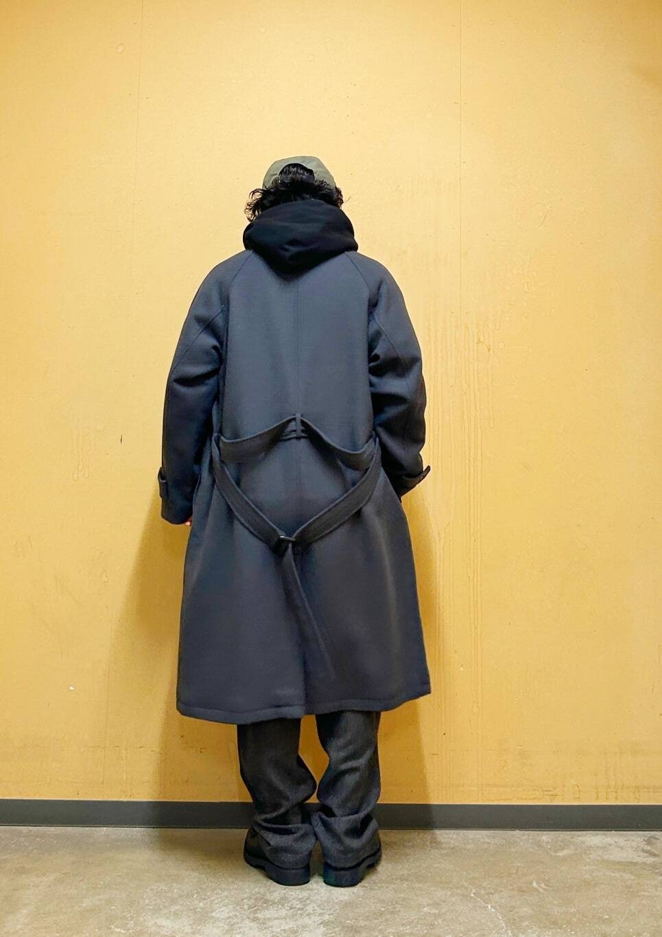 ・衿にはフラップを付けており、襟を立てて風の侵入を防ぐスタンド型にすることができます。コートの内側にフラップ留めの釦があり、使わないときは収納が可能。