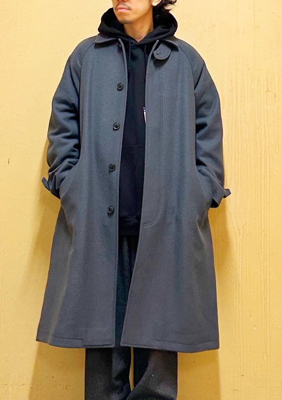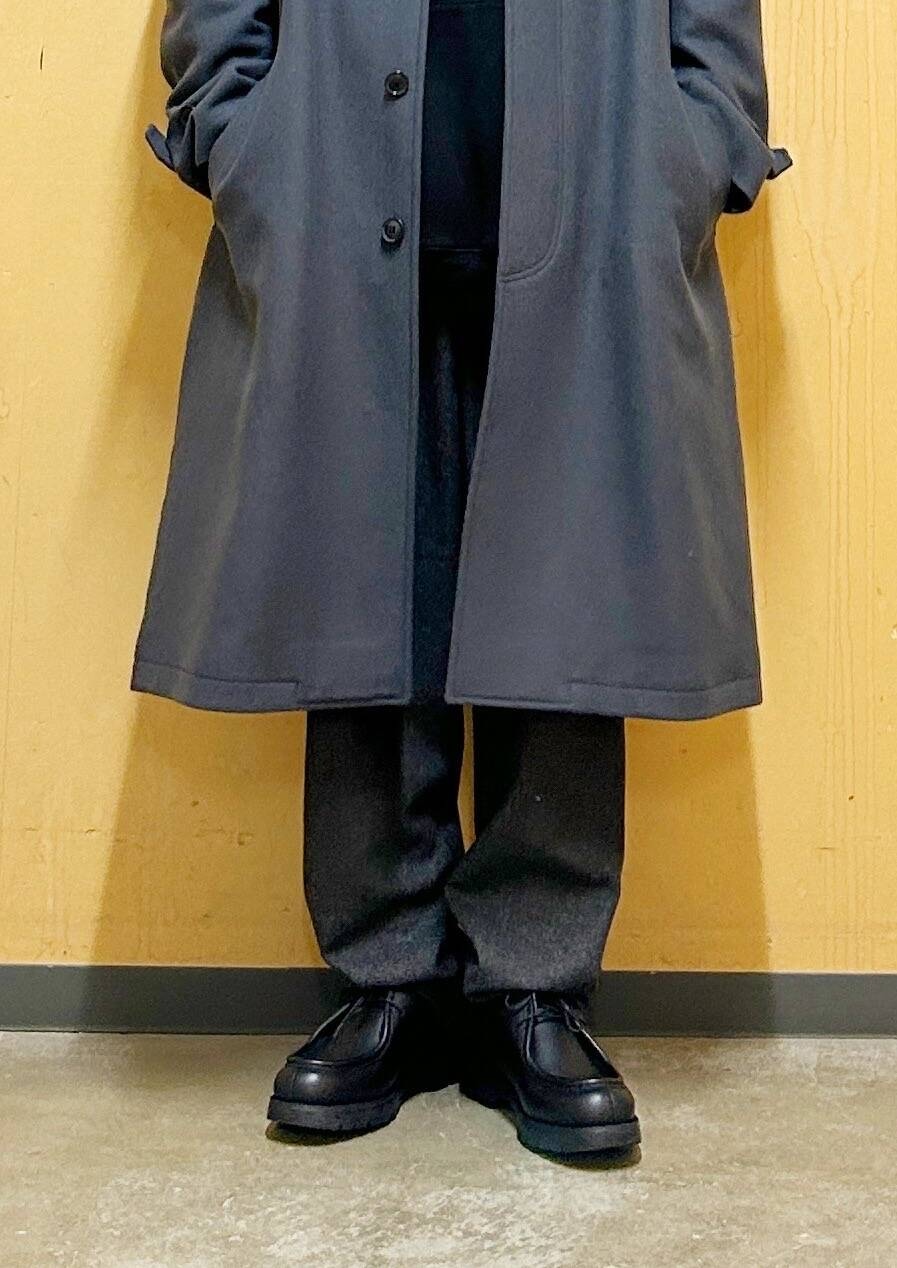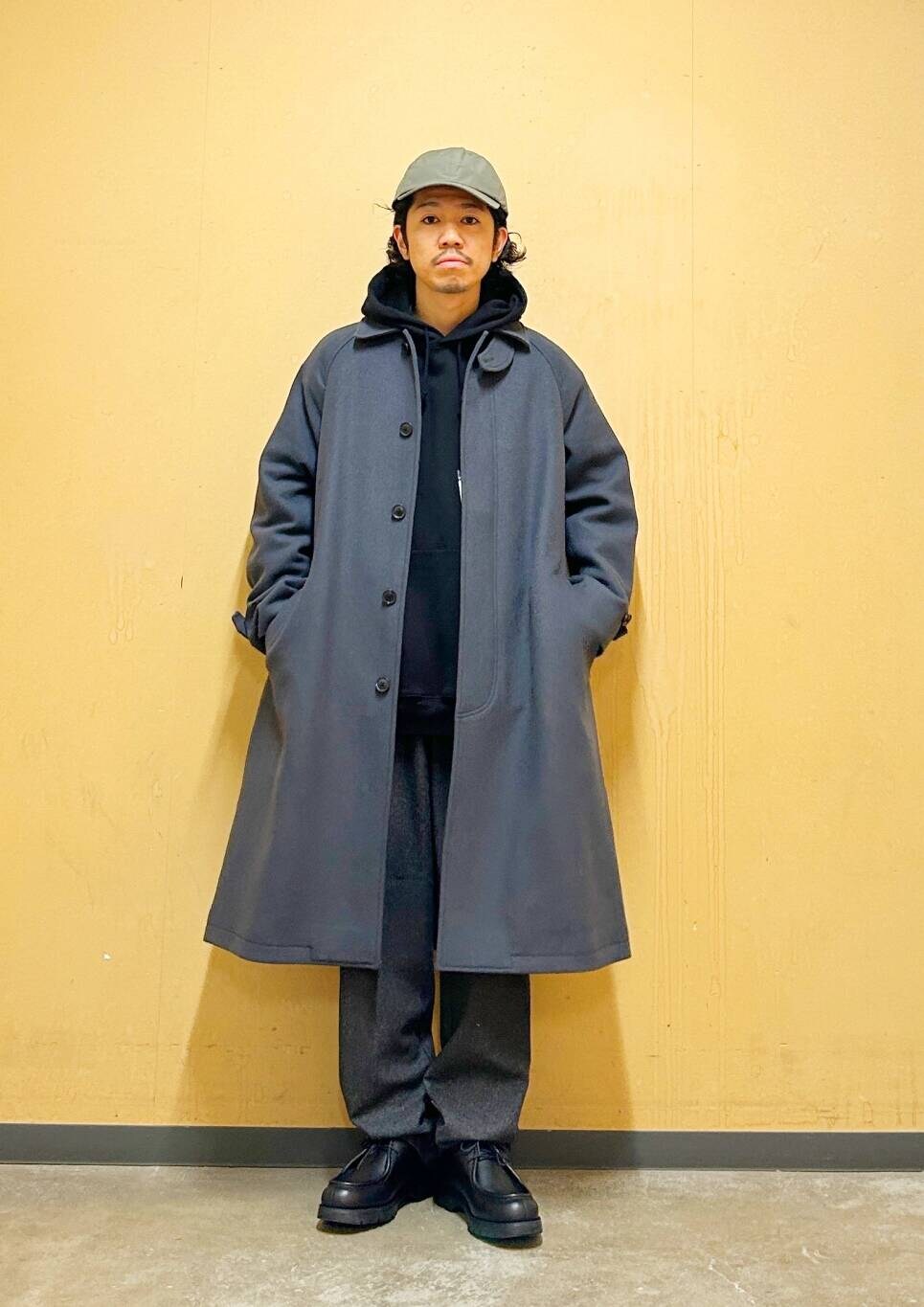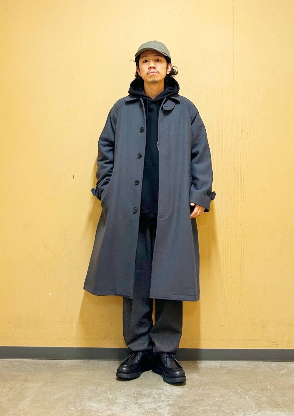 ・衿にはフラップを付けており、襟を立てて風の侵入を防ぐスタンド型にすることができます。コートの内側にフラップ留めの釦があり、使わないときは収納が可能。