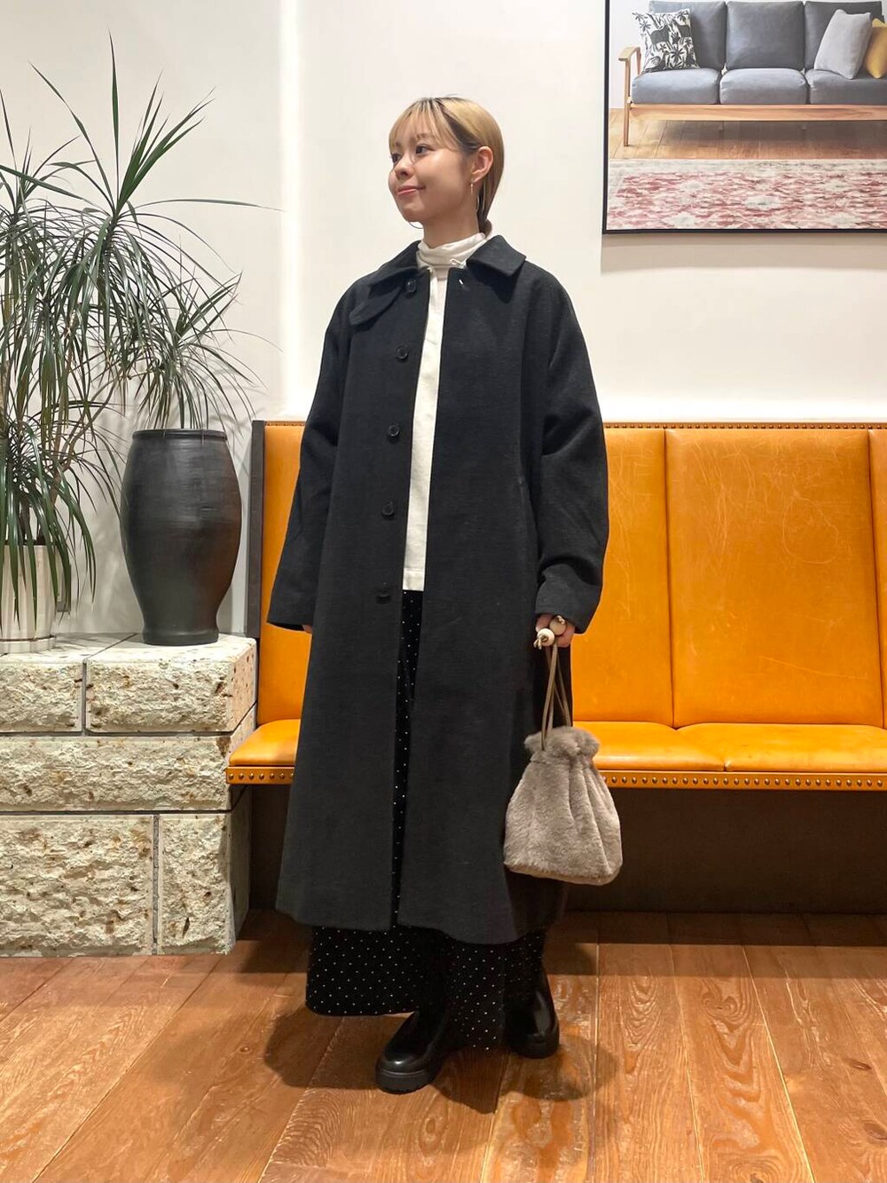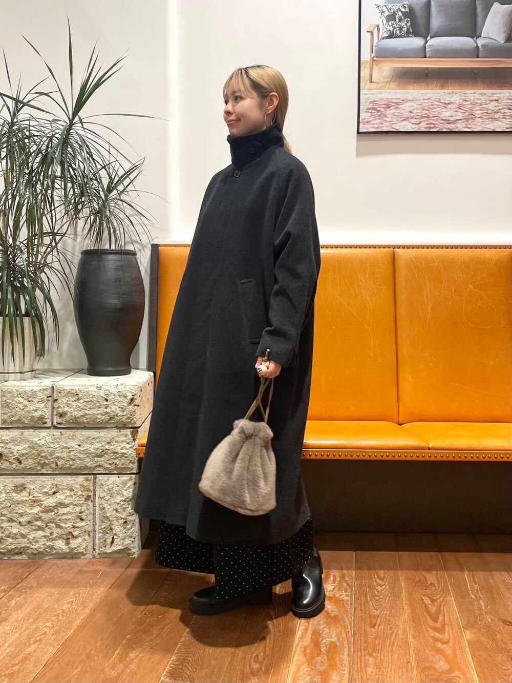 コートはウール100%の素材で裏地もついており、スタンドカラーにもなるので首周りも暖かく着て頂けます!