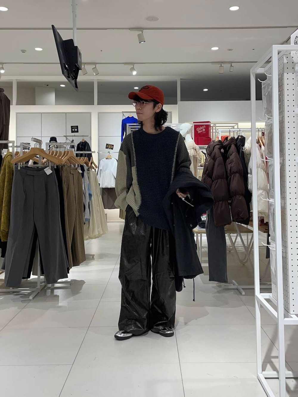 中に着用しているニットはパッチワークっぽいパターンで可愛らしいです。性別問わず着用いただけます