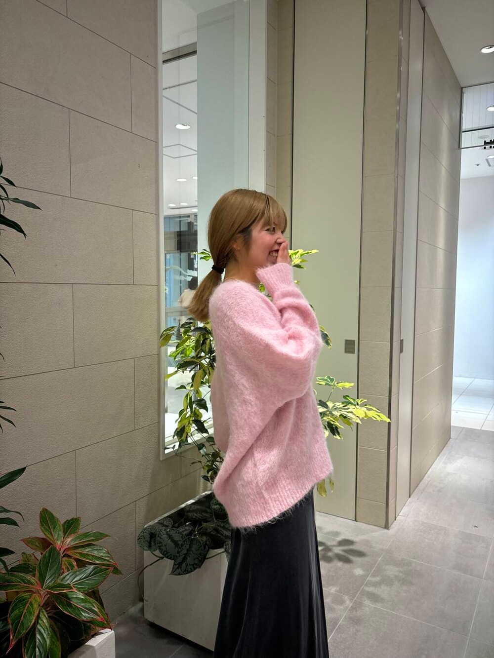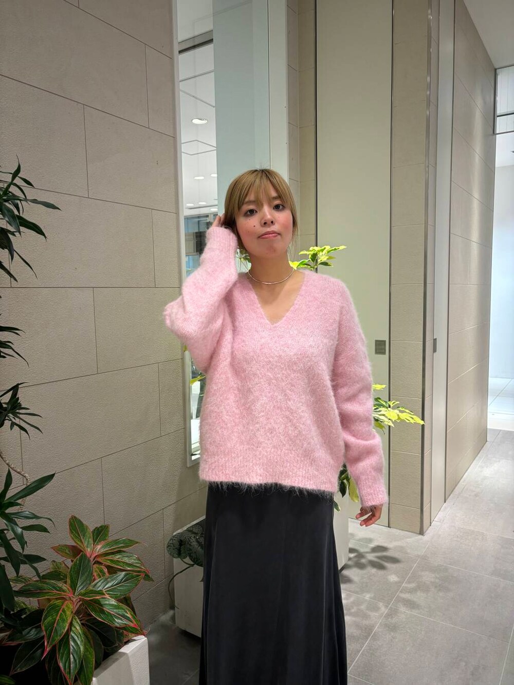淡いピンクのカラーとスッキリとしたVネックのデザインが甘すぎずに着られるのでおすすめです🦙🩷