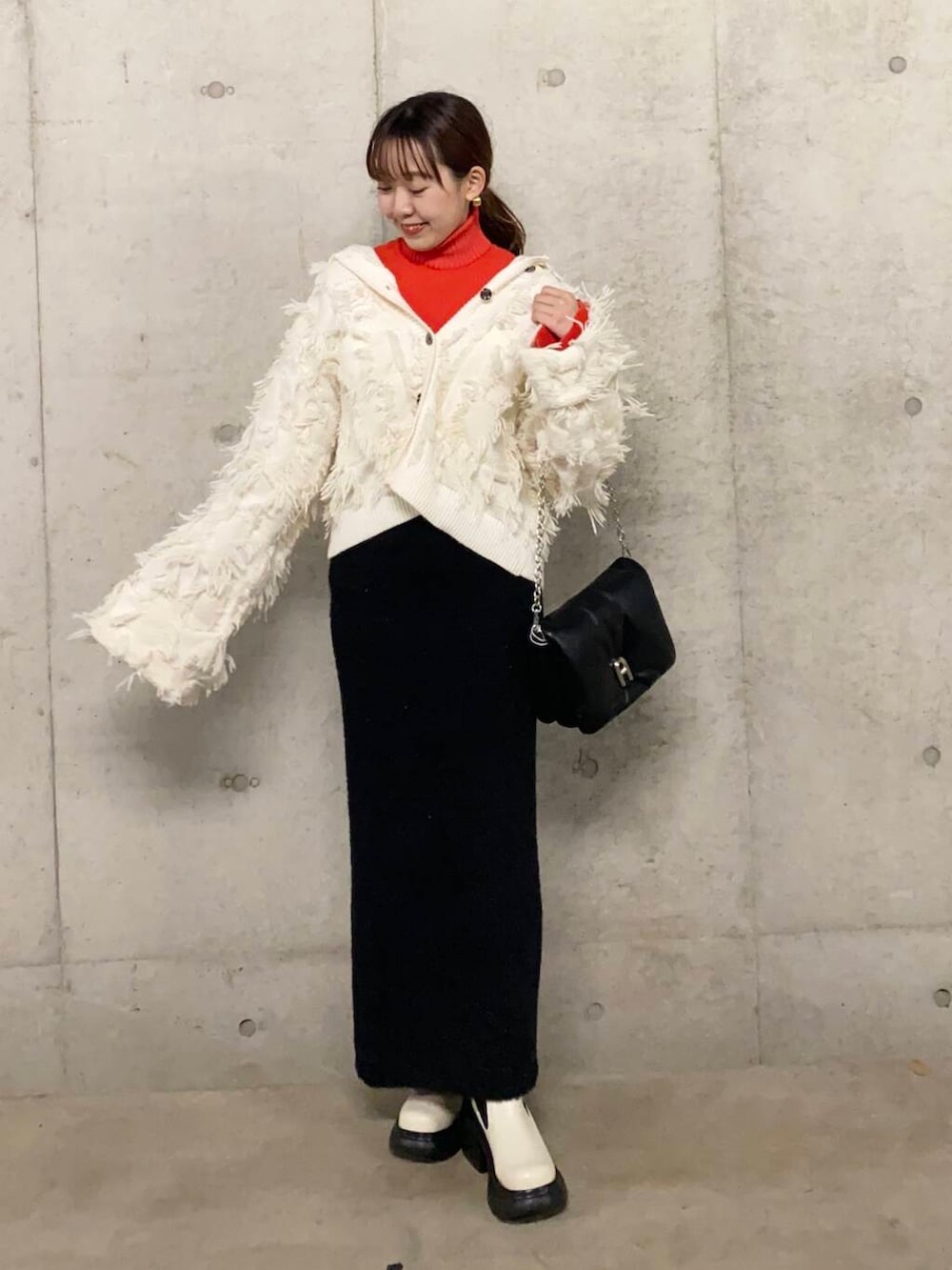 赤ニットは鉄板!そして雪のようなフリンジアウターで、さらにふわふわ可愛らしい雰囲気に🥹✨️