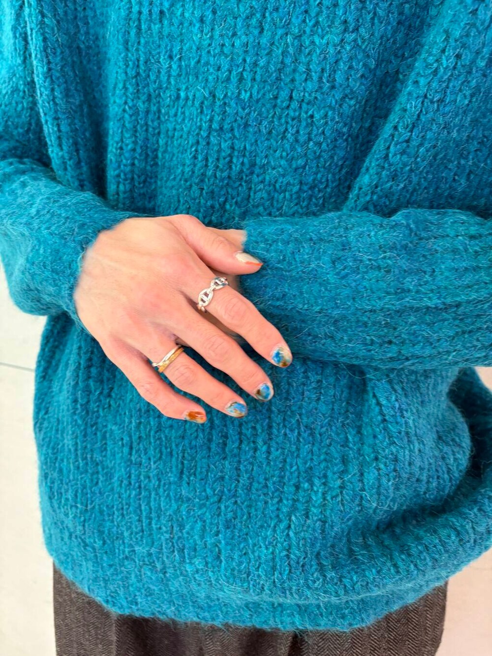 発色がとても綺麗なので、1枚でもアウターの中から覗かせてもばっちりです!