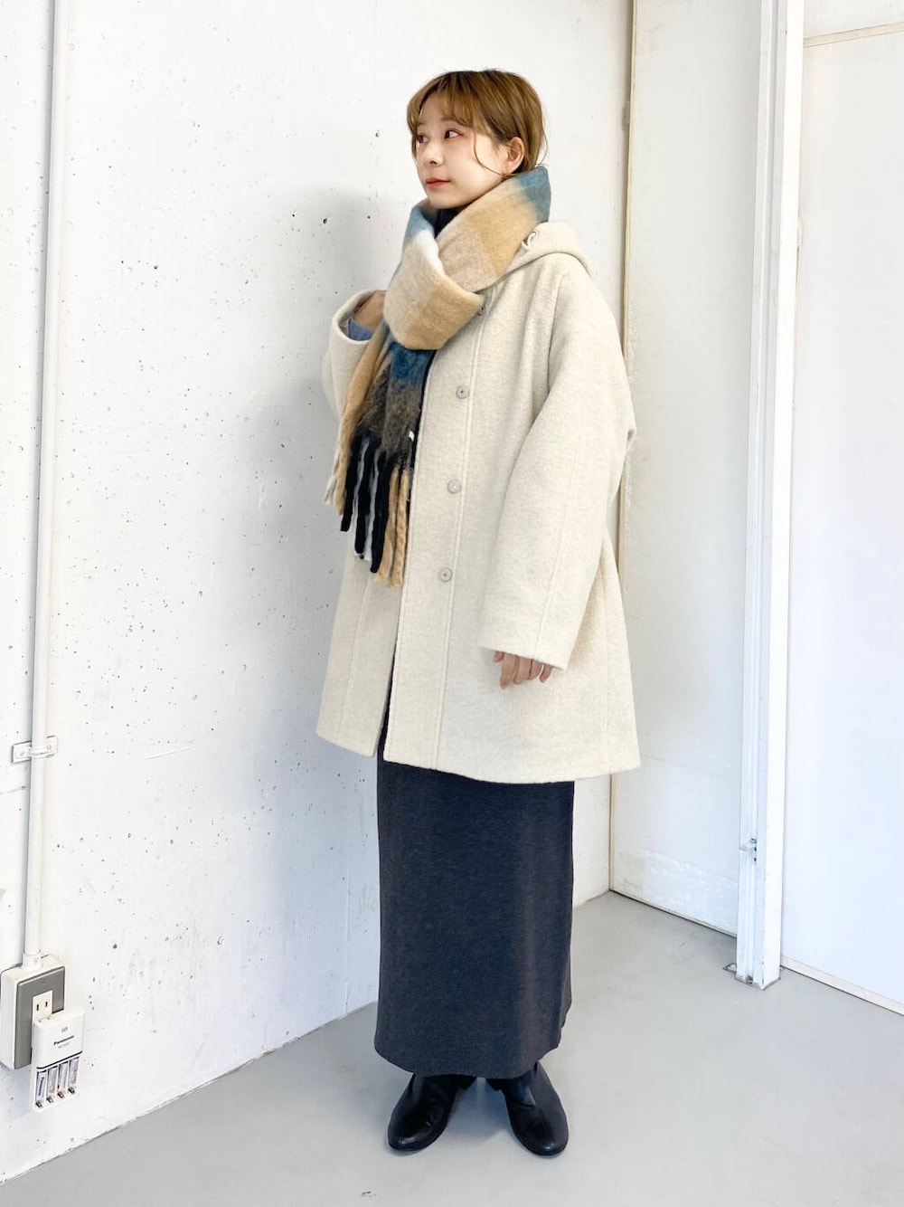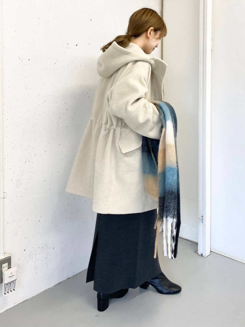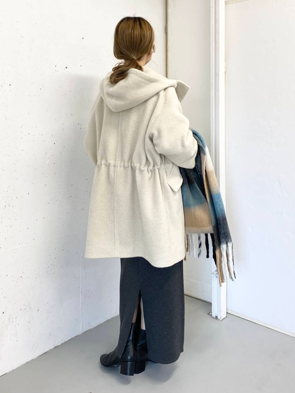 合わせているアウターは、ウエスト部分のシルエット調整ができるので