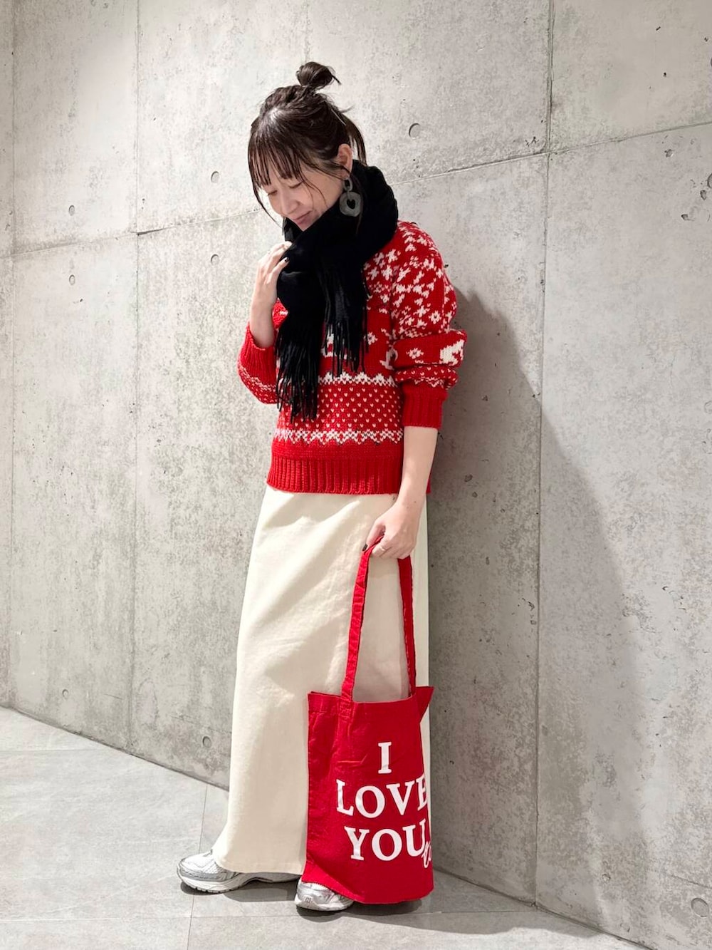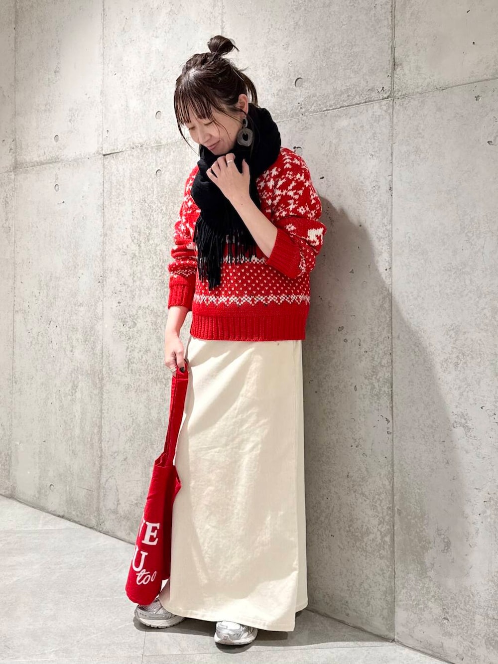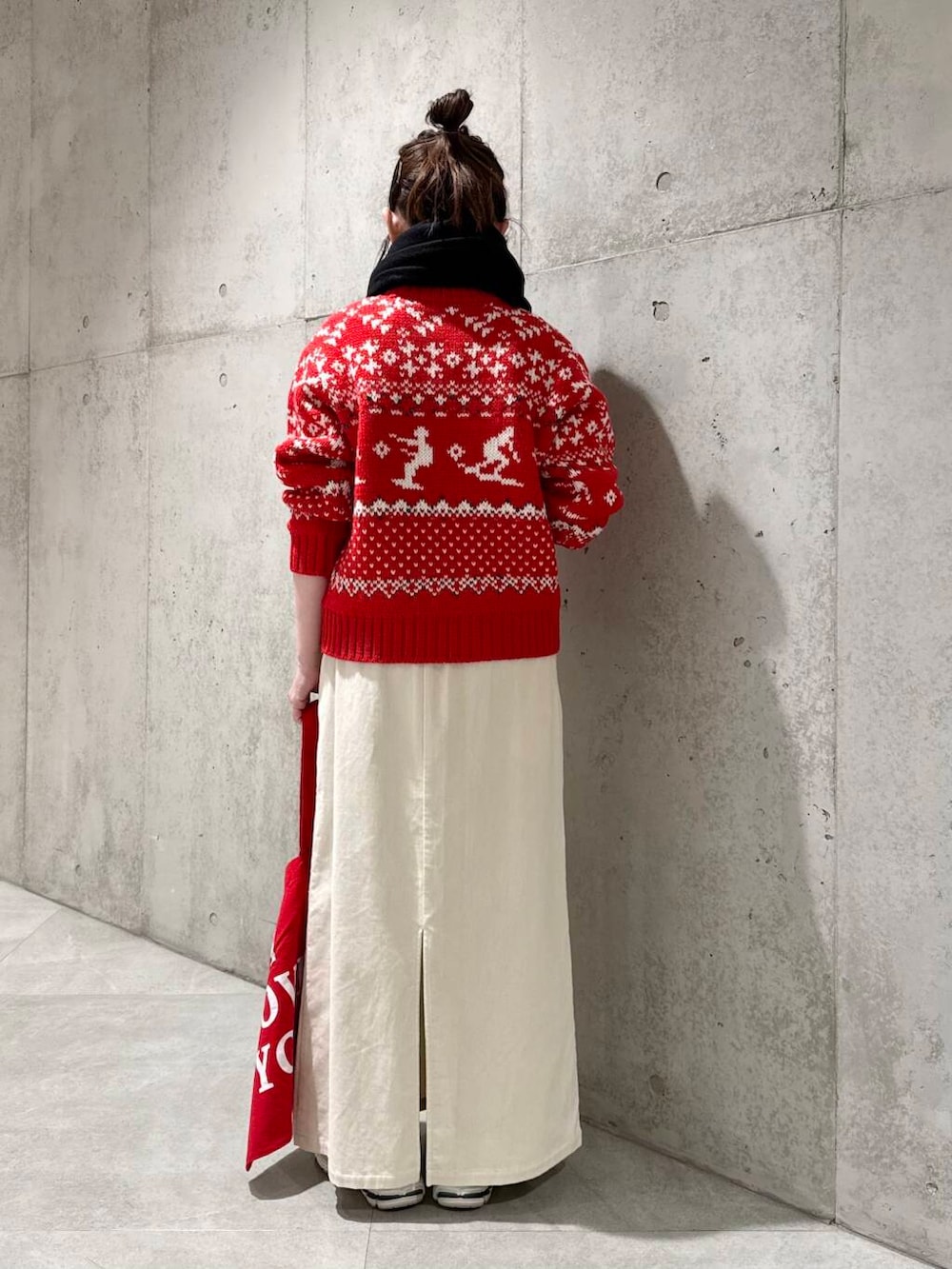 今回は、ホワイトカラーのスカートを合わせて、ニットのレッドカラーが映えるようなコーディネートにしてみました。