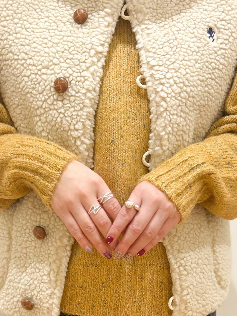 上の2段ボタンをとめて、インナーを三角形の様に見せると