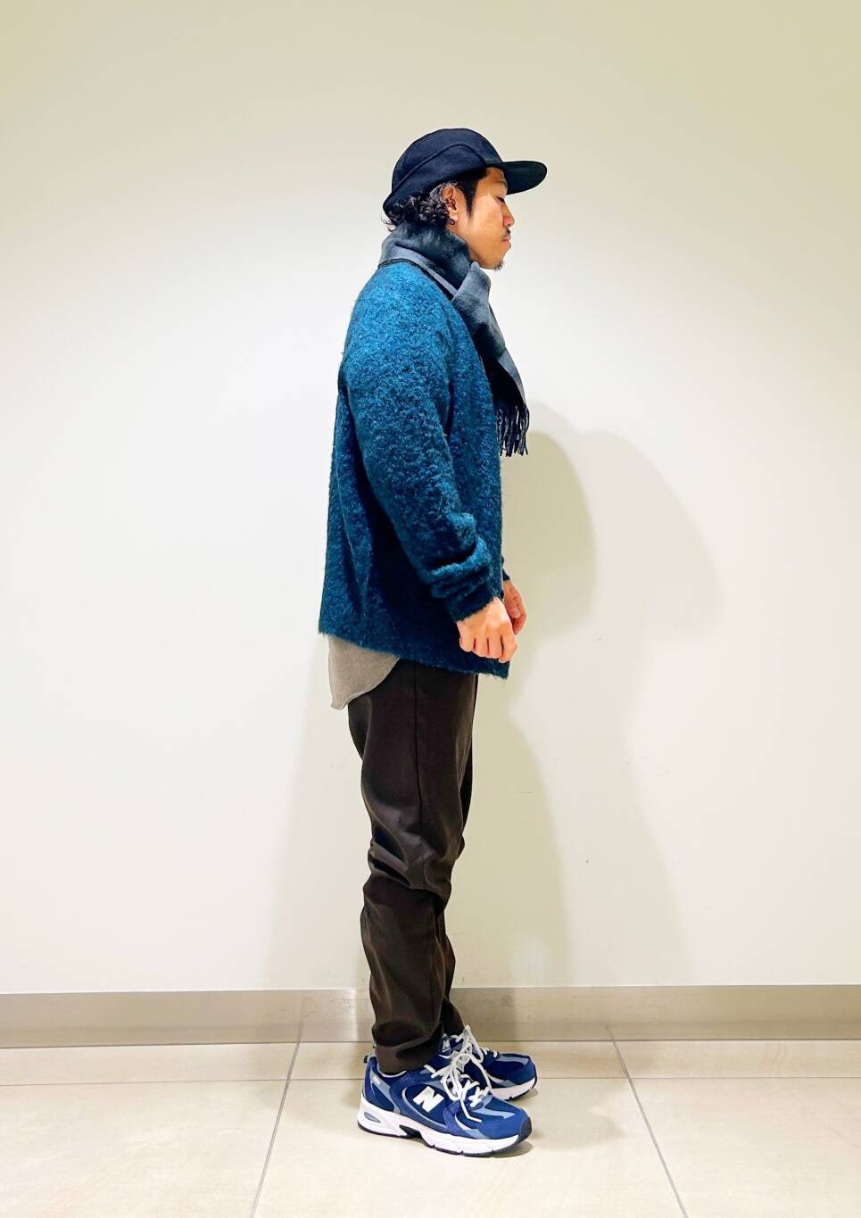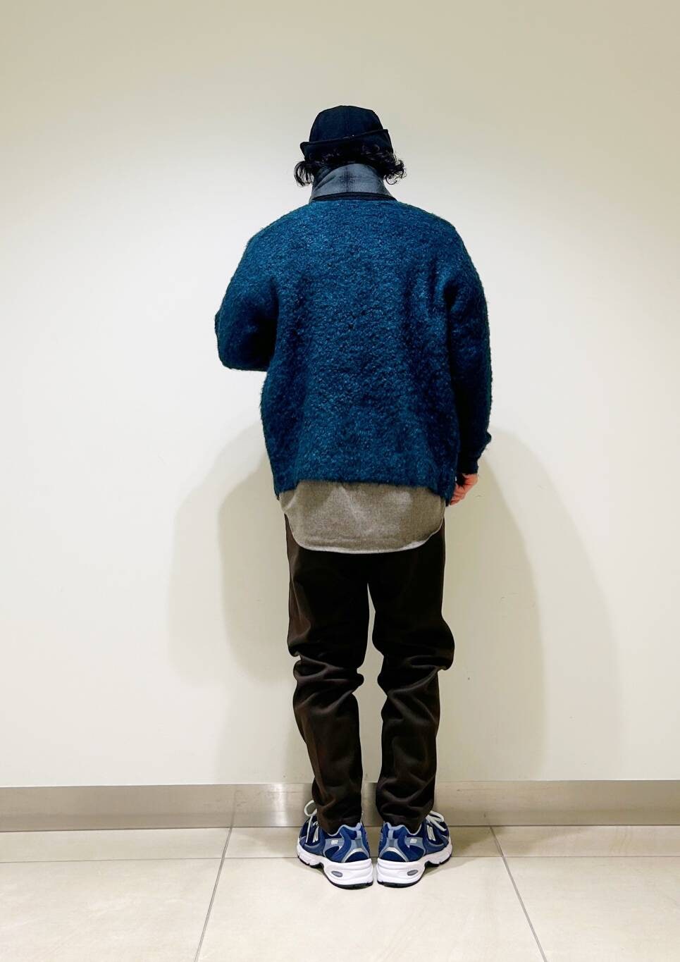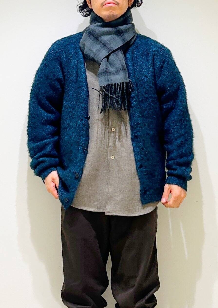 毛足の長い糸を3ゲージでふっくらと編みたてており、糸特有の柔らかさを出しながら甘くなりすぎないように仕上げています。