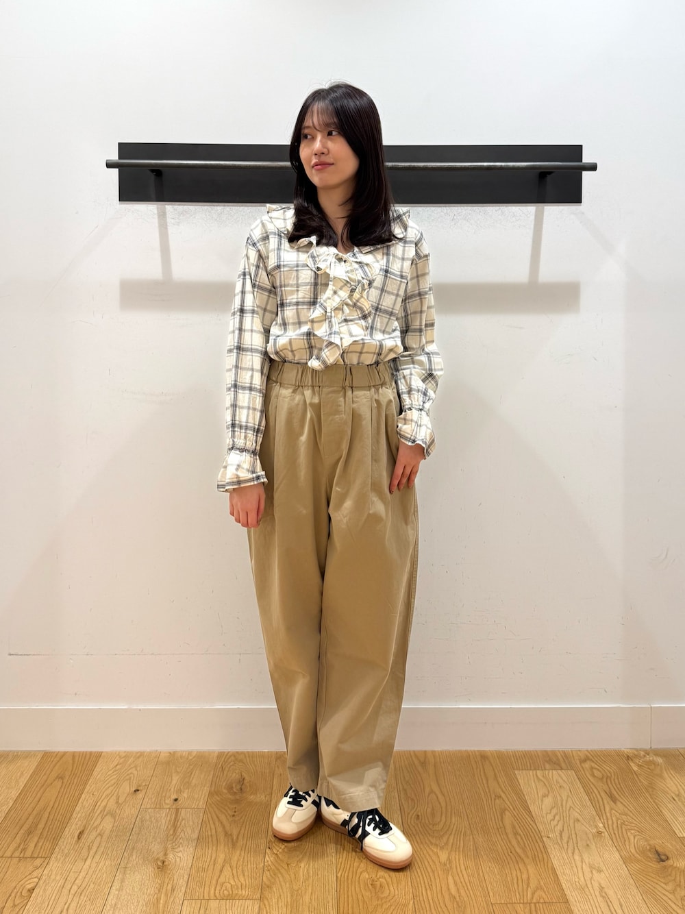 少し短めの丈感で、中にシャツを入れて着ると