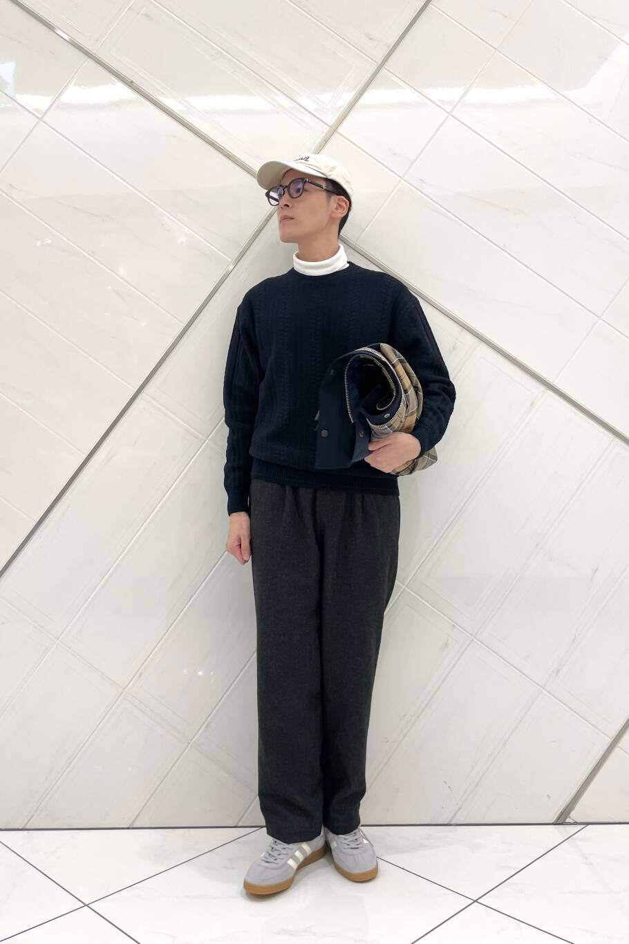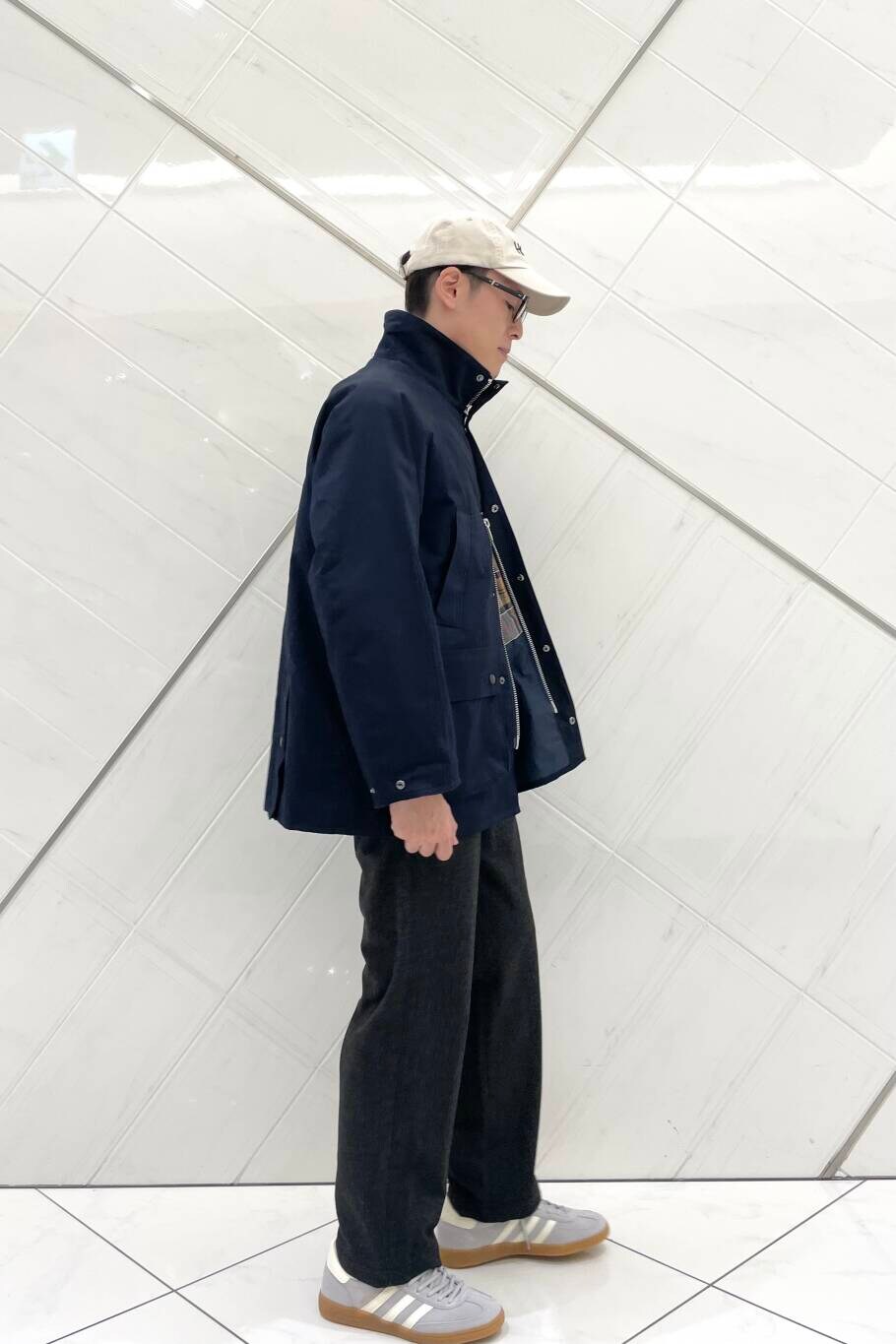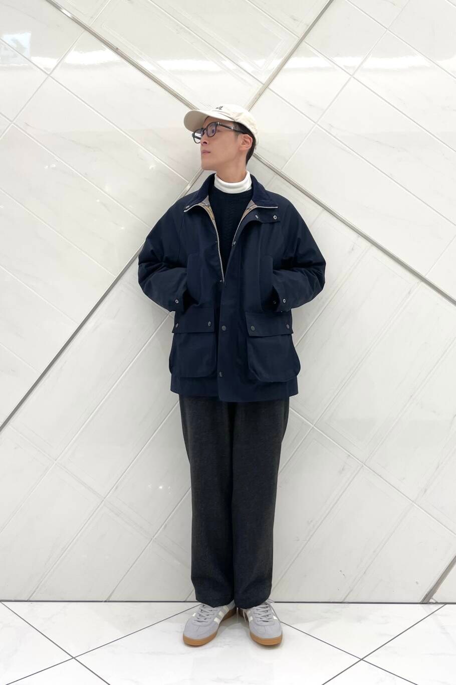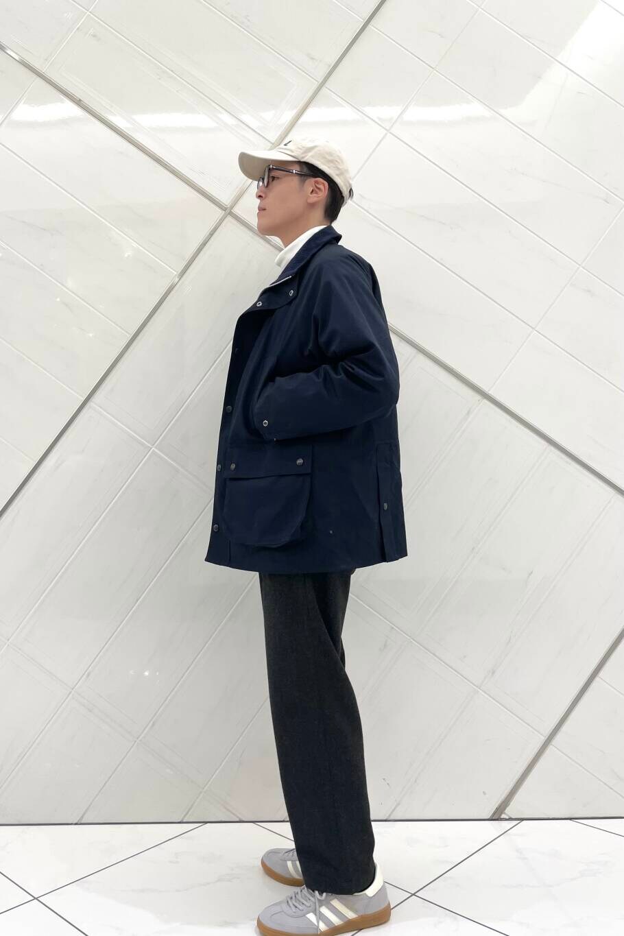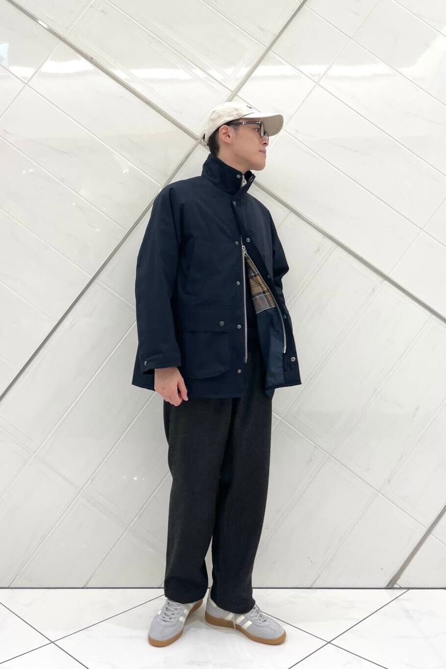 Barbour×DOORSのBEDALE STANDCOLLARを着用したスタイリングです。