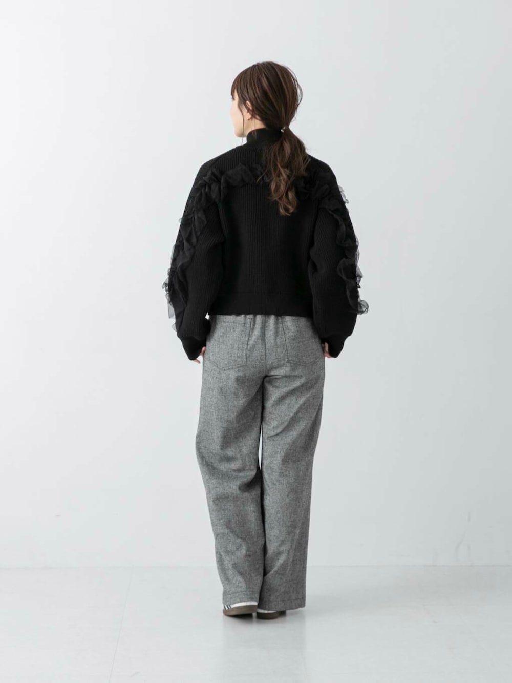 合わせたパンツはツイード素材が冬らしいイージーパンツ。