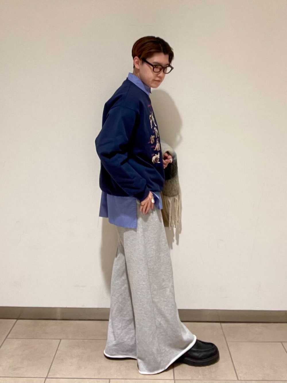 シャツをスウェットの下にレイヤードしたりデニムとも相性がいいので色んなコーデが楽しめます!