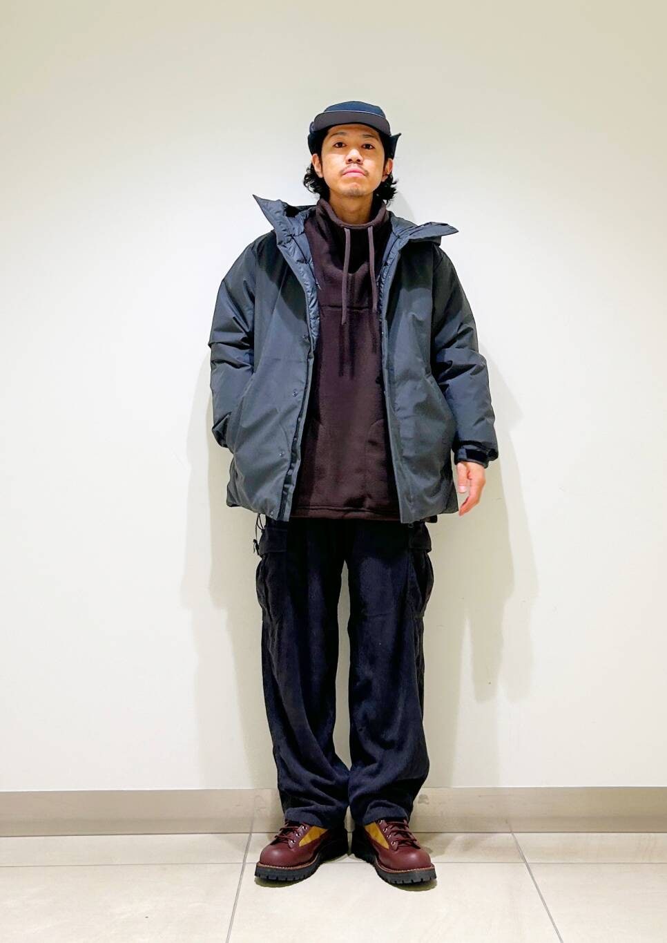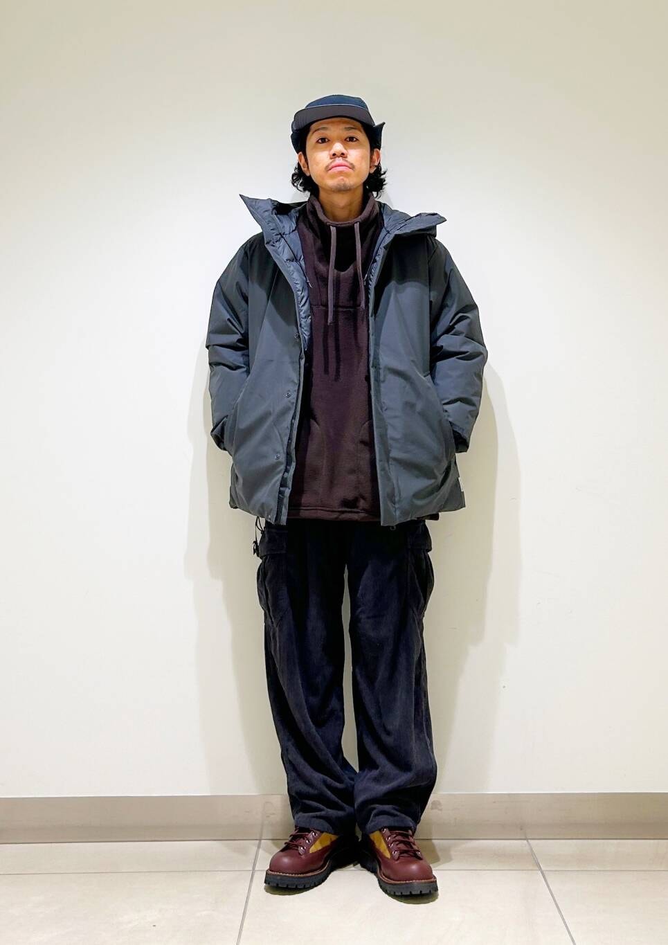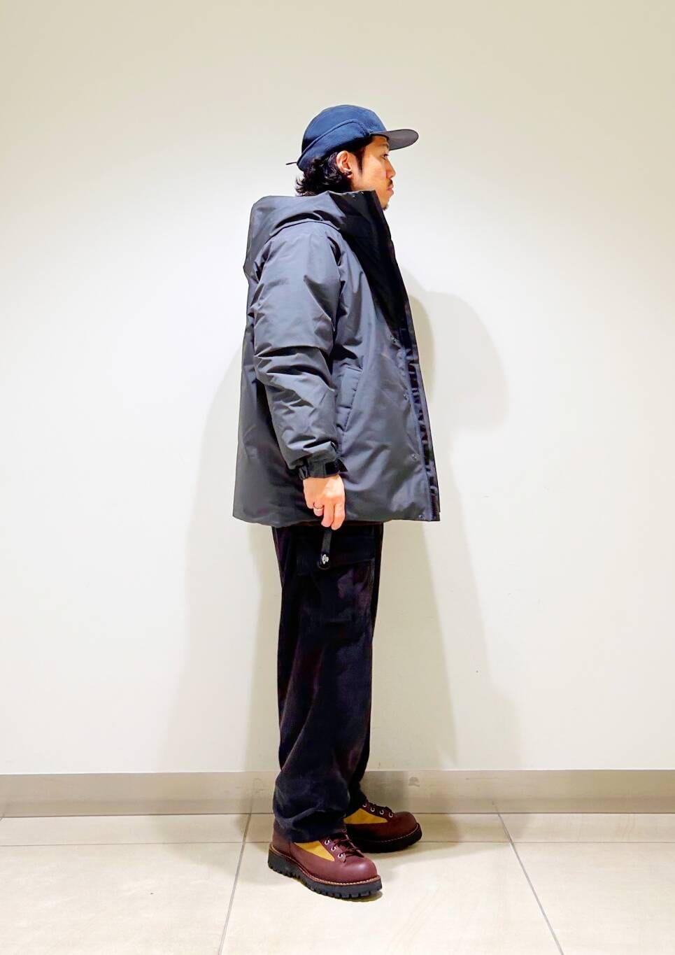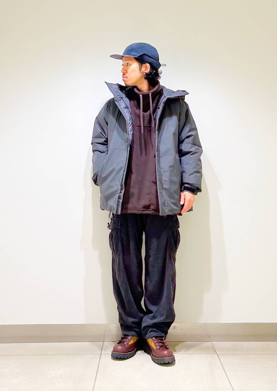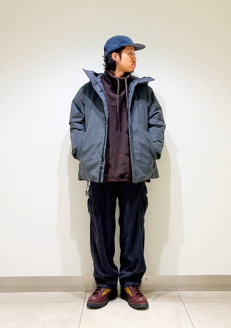今回はFoxfire×DOORS ダウンジャケットとコーデュロイカーゴパンツを使用したコーディネート。 日本発のアウトドアブランド”Foxfire”に別注したダウンジャケット。