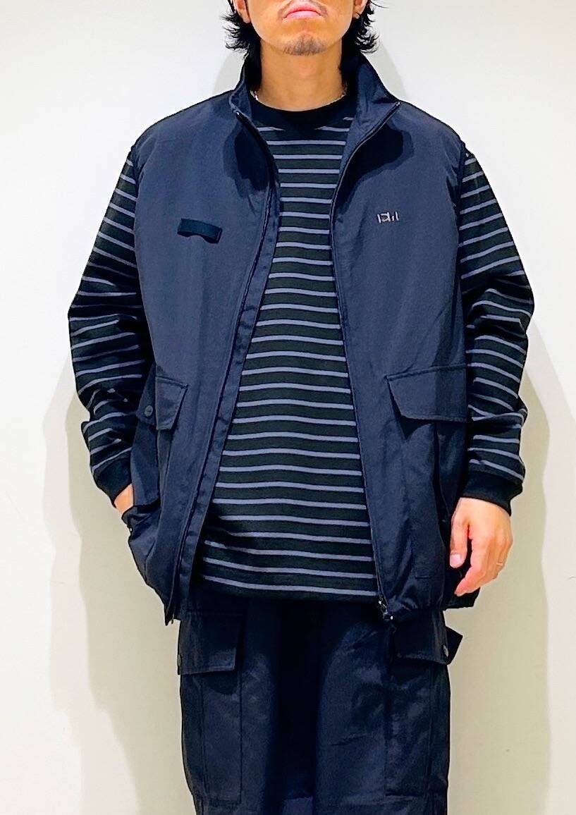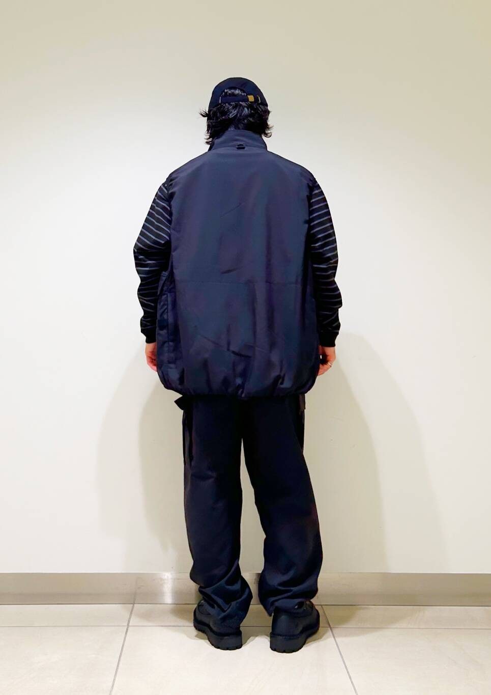 フィッシングベストをベースにスタンド衿型にアレンジして後ろ身頃に大容量のゲームポケットを採用。