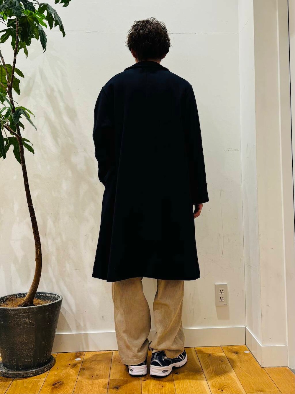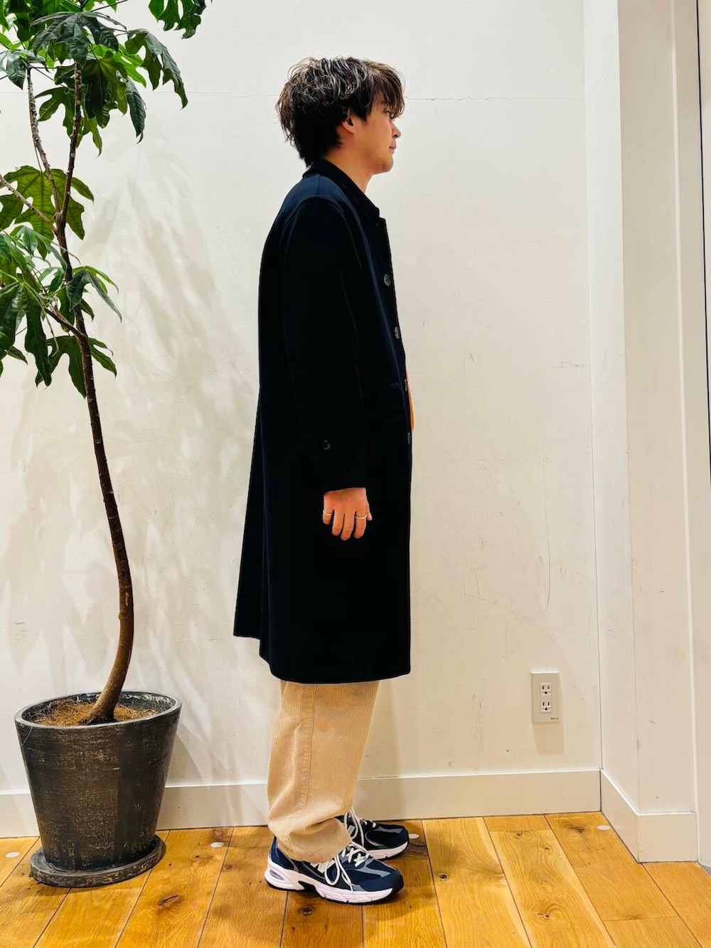 全体的に明るいカラーで合わせているのでコートとシューズは暗いカラーで組んでいます。